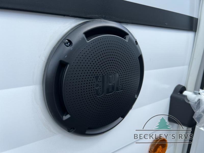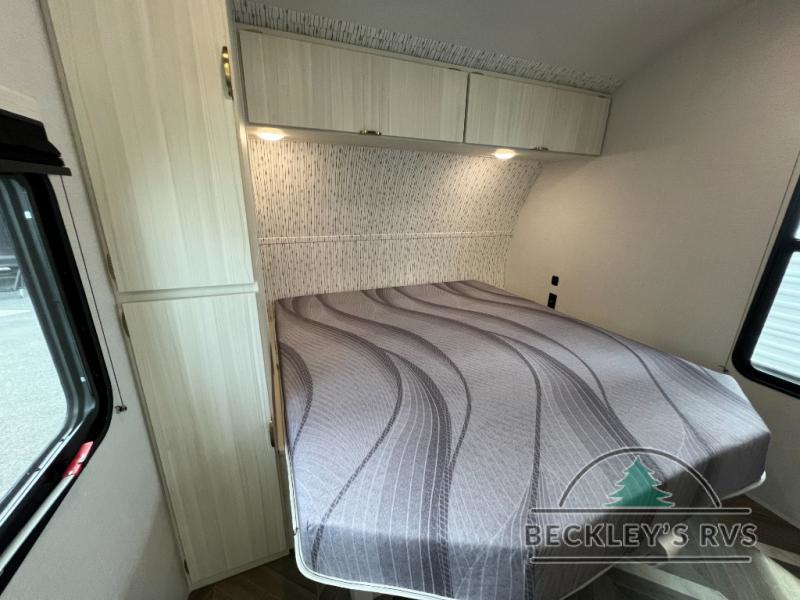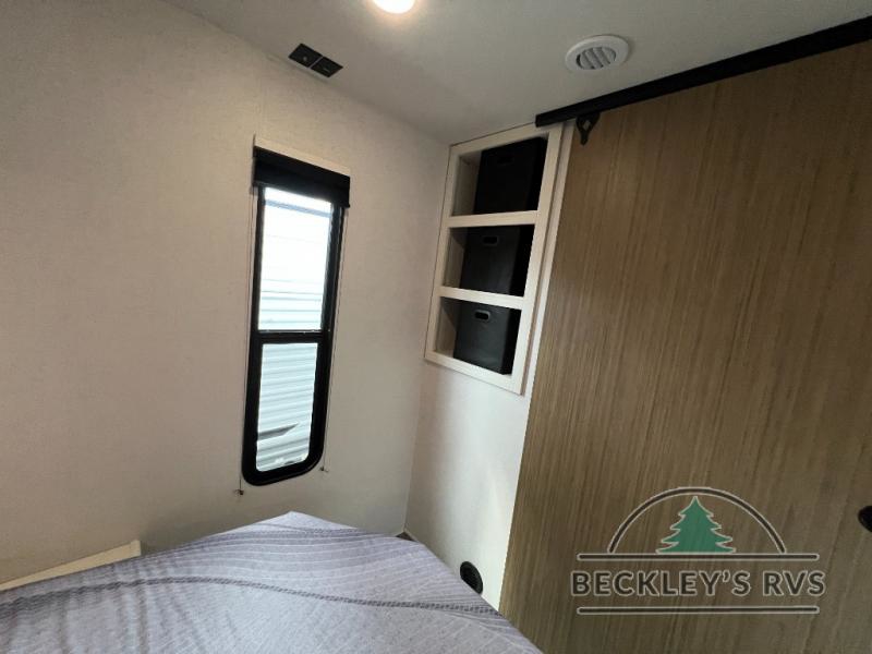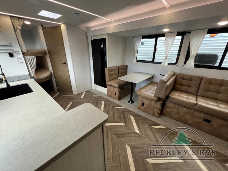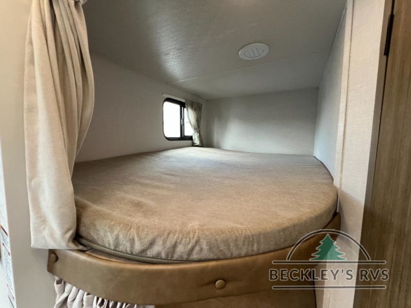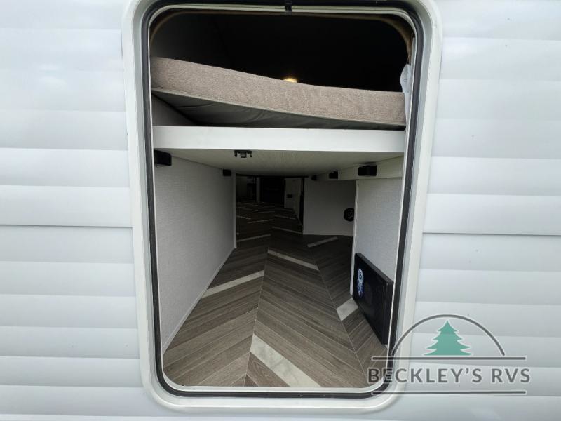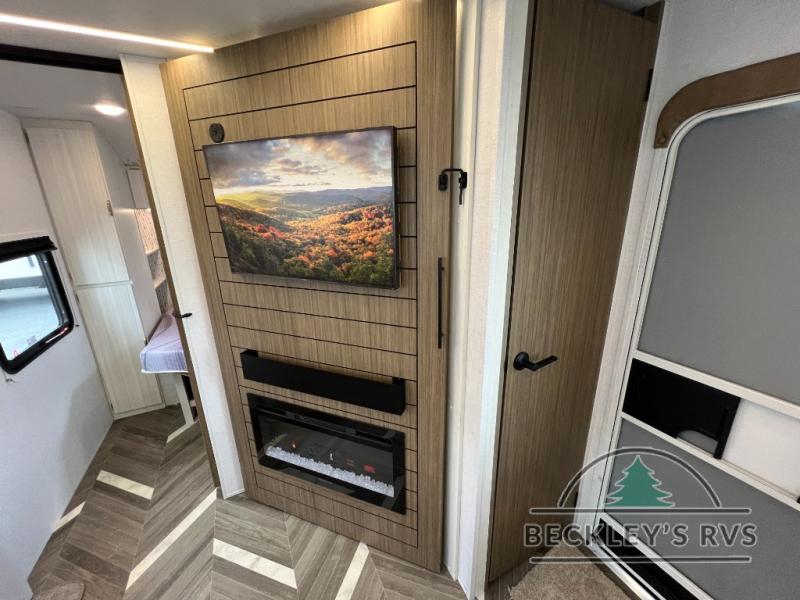 Trips to the lake just got sweeter in this travel trailer with a large slide for more space. Here, you'll find an versa lounge , and the entertainment center with a fireplace will make it feel a little more like home. A full bath with a 36" x 30" shower will let you clean up each day without having to use the camp's facilities, and the double-size bunks with an exterior bike door will let you easily pack gear in. Head up front to enjoy the private bedroom all to yourselves with a king bed and dual wardrobes for wrinkle-free clothes!