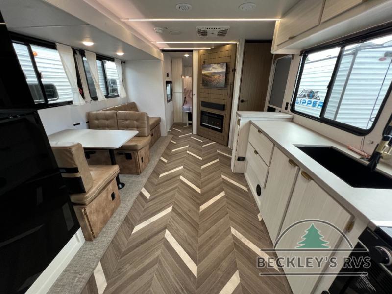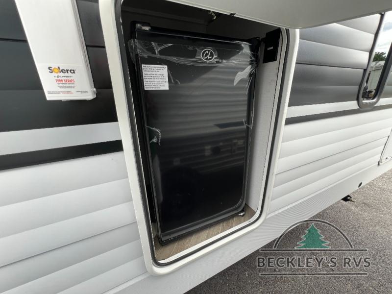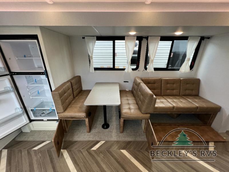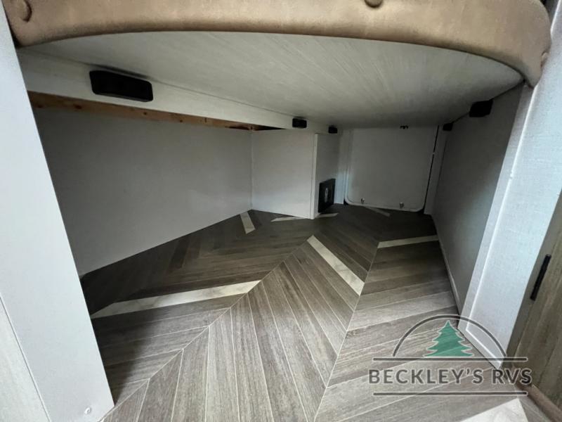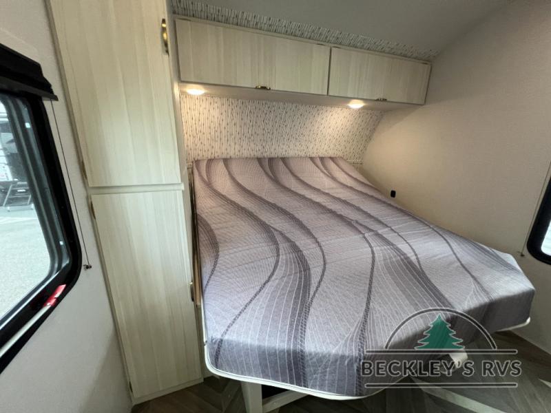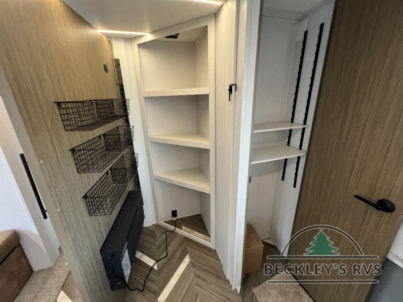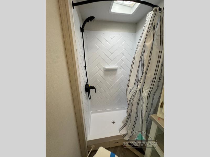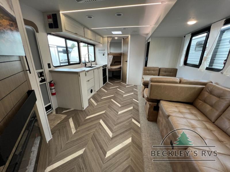 Trips to the lake just got sweeter in this travel trailer with a large slide for more space. Here, you'll find an versa lounge , and the entertainment center with a fireplace will make it feel a little more like home. A full bath with a 36" x 30" shower will let you clean up each day without having to use the camp's facilities, and the double-size bunks with an exterior bike door will let you easily pack gear in. Head up front to enjoy the private bedroom all to yourselves with a king bed and dual wardrobes for wrinkle-free clothes!