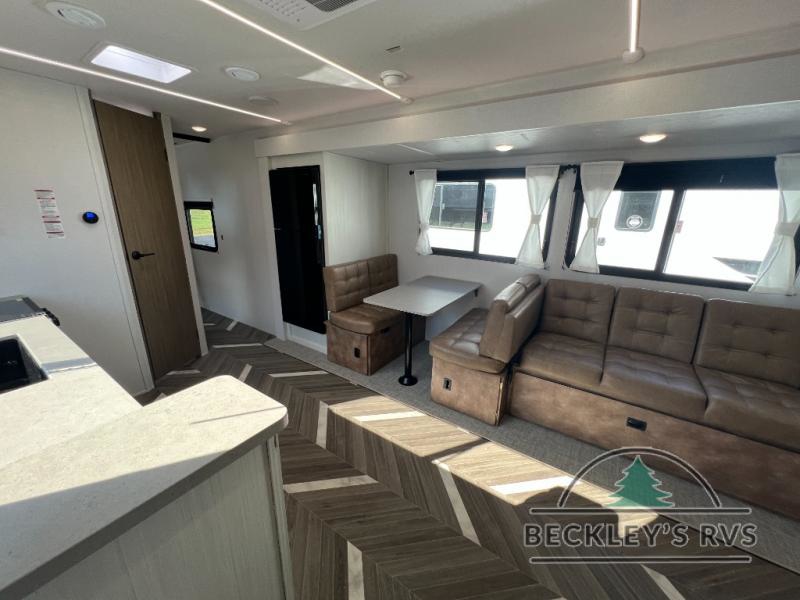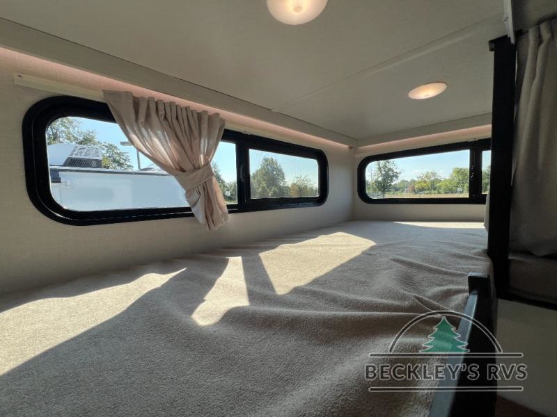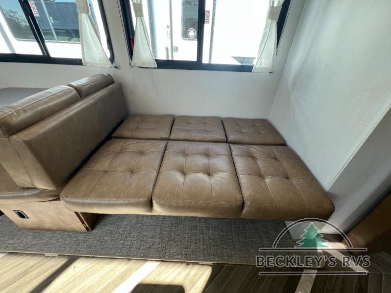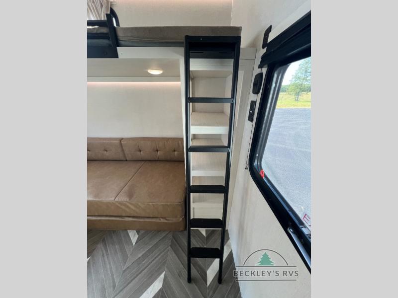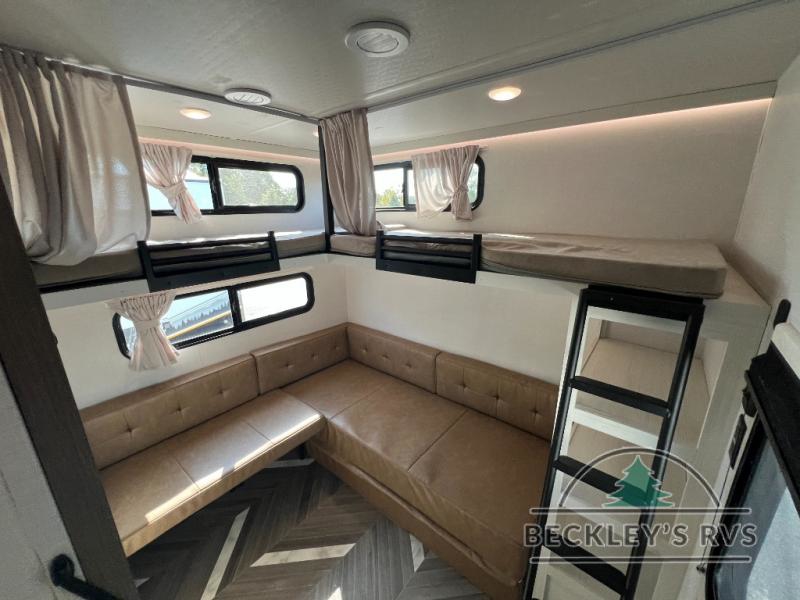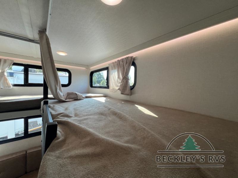 Trips to the lake just got sweeter in this travel trailer with a large slide for more space. Here, you'll find an versa lounge, and the entertainment center with a fireplace will make it feel a little more like home. A full bath with a 24' x 36" shower will let you clean up each day without having to use the camp's facilities, and the rear bunkhouse will provide sleeping space for your guests or kids. There are two bunk beds here, along with an open lounge/queen bed combo and storage space to keep this room tidy. Head up front to enjoy the private bedroom all to yourselves with a king bed and dual wardrobes for wrinkle-free clothes!