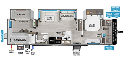 With any Transcend travel trailer by Grand Design, you will enjoy upscale appointments and convenient amenities to make each camping experience one to remember! The Quad Seal technology, residential insulated walls, plus heated and enclosed underbelly with suspended tanks make these units solid and durable. There is a black automotive glass door outside, along with a Safe-T-Rail assist on the main entry door, backup camera prep, and a universal docking station. JBL interior and exterior speakers plus a JBL head unit will let you listen to your favorite tunes as you visit under the power awning with LED strip lights. Inside, you'll enjoy multiple outlets to keep your gadgets charged, thermoformed and seamless countertops, and a 6' 6" interior height so you won't feel closed in. The Solar Prep Package will allow you to enjoy off-grid capabilities with a 200W solar panel, which is wired for up to 600W, a 30 AMP Bluetooth solar controller, a 2000W inverter prep, and more!