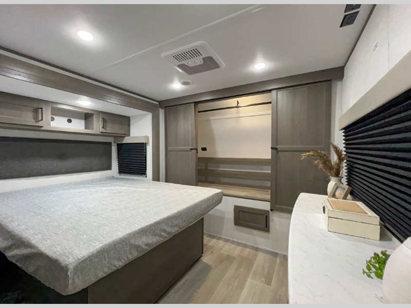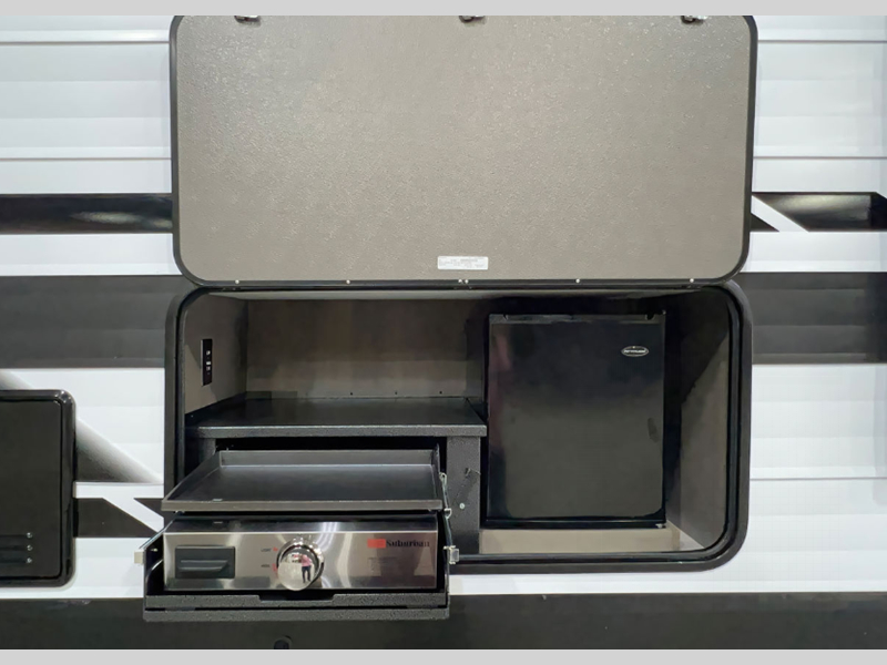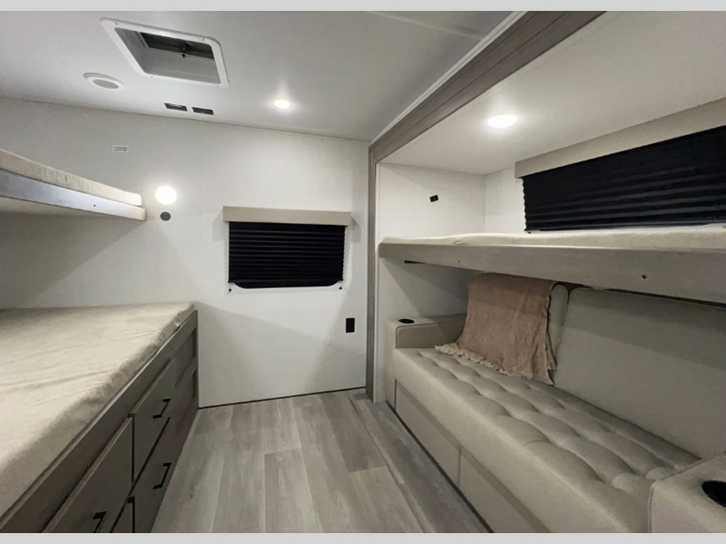 If you're looking for a travel trailer that can house your whole gang, this unit is the one! The rear private bunkhouse can sleep up to five since there is a sleeper sofa and three bunks, plus there are storage drawers for your guests' things. A front private bedroom will be perfect for the owners with a queen bed slide out and spacious front closet with washer and dryer prep! Whether you cook outside on the exterior griddle or inside on the three burner range, you'll be able to make your best meals. There is also a 12V French door refrigerator with a glass front and bottom freezer and a convection microwave/combo air fryer to enjoy some crispy fries! A U-shaped dinette and 60" sleeper sofa within the living room slide provides even more seating and sleeping space, or you can choose the optional theater seating!