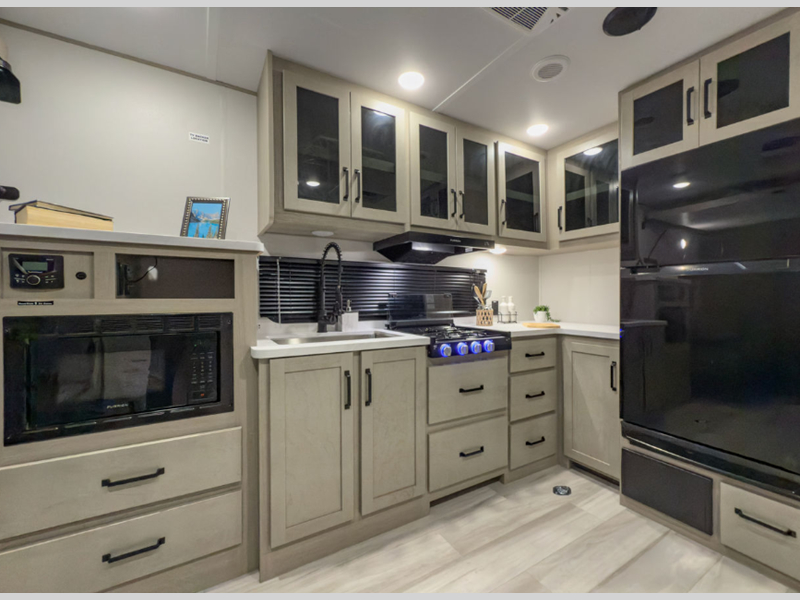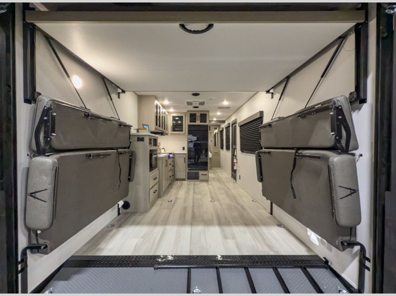 The Momentum MAV toy hauler travel trailers by Grand Design are designed to provide exactly what you need. The spacious garage provides tons of cargo space, with no wheel wells to get in the way. Additional storage includes magnetic storage door catches, and overhead consoles throughout. Conveniences like motion sensor lights and USB outlets will make your life easier, and you will be comfortable in all seasons with the 30K BTU furnace plus 15K BTU ducted air conditioning. The standard Solar Package comes with a 180W solar panel, a 40 Amp charge controller with Bluetooth, and a 12V refrigerator so you can go off-grid when the adventure calls for it.