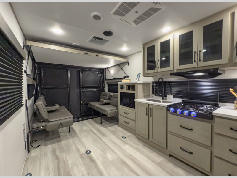 You will love this Momentum MAV toy hauler travel trailer! The front bedroom features a queen bed, and there is plenty of room to walk around. The sliding solid bedroom door helps with space. Overhead storage and a pair of nightstands are convenient storage, plus there is a wardrobe with both drawers and space to hang items. The kitchen offers a microwave, stainless steel sink, and an 8 cu. ft. 12V refrigerator. In the garage, you'll find rollover sofas with a table and a top bed for guests to sleep on. The ramp door/patio will provide additional living space once your toys are unloaded, and the pull down screen will keep bugs out!