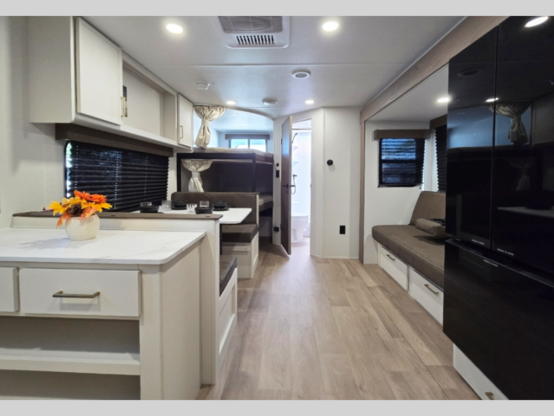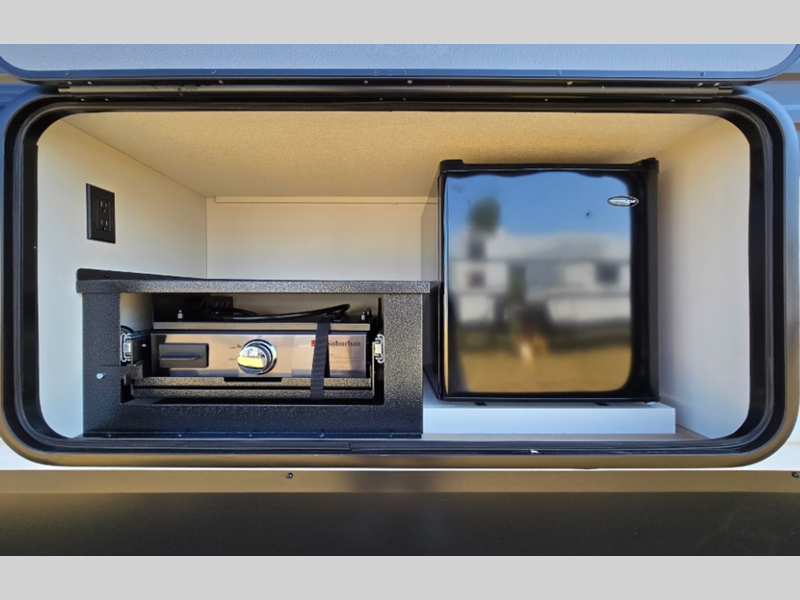 Camping with your larger family or when you want to take along a few extra friends is easy with this trailer. This unit sleeps nine with the double-size bunks in the rear corner, the 60" roll over sofa, and the queen bed in the front semi-private bedroom. The booth dinette can also be used to sleep a guest or two little ones at night once converted. Prepare your meals on the three-burner cooktop indoors, or out on the outside kitchen! You'll also find a handy exterior spray port and an outdoor refrigerator for cold drinks! It will be so easy to fill the dog's food bowl with the added pet dish under the refrigerator, and the full bath in this model means you don't have to use the camp's facilities. Having a 17' awning outside along with a large pass-through compartment allows you extended living outdoors and plenty of space for all of your gear!