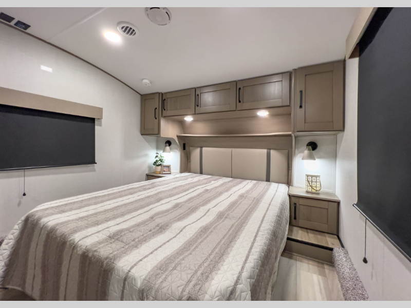 When you are looking for a versatile extra room for either a second bedroom or living area as well as an office, this middle bunkhouse might just work! There is a slide out with two bunks and drawers plus a dresser. You can sleep like a queen on the walk-around bed in the front private bedroom that offers more clothing storage and windows for views. The rear main living and kitchen area provides plenty of seating on the a 78" triple person theater seats, and on the 92" U-shaped lounge with table with windows within the slide for natural lighting and great views. The kitchen island gives the cook more space to make and serve meals, and the gourmet kitchen includes a 16 cu. ft. refrigerator, plus a pantry for dry goods. There is an exterior outside kitchen with a griddle and a 1.6 cu. ft. refrigerator for beverages and such, plus you will find an LP quick connect, Coax TV hookup, and a spray port to wash off your dirty shoes.
