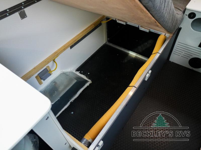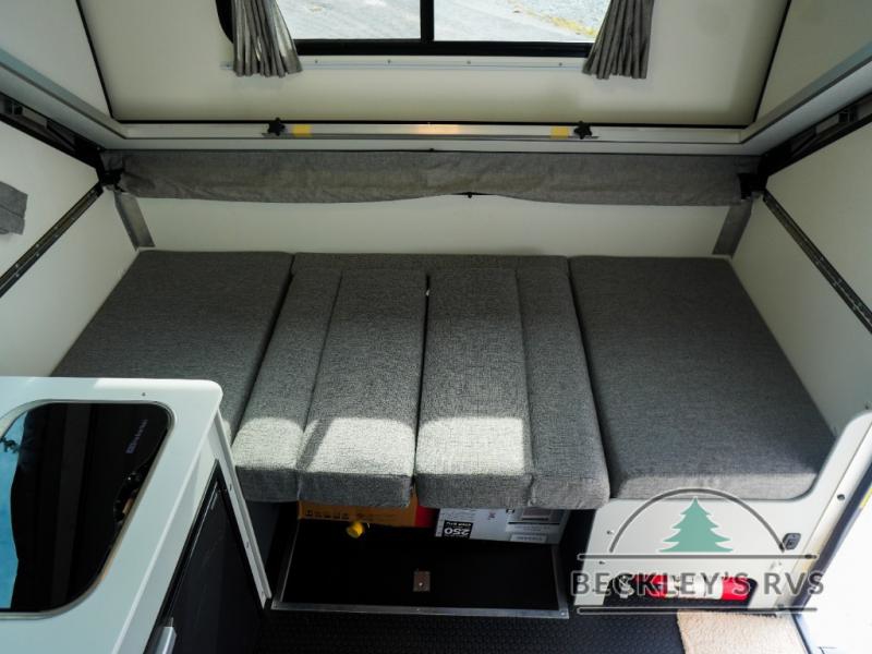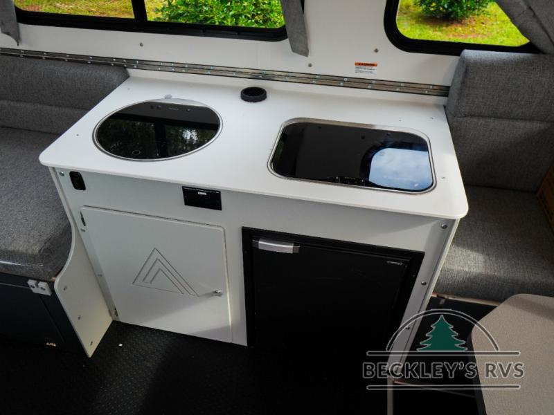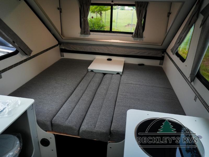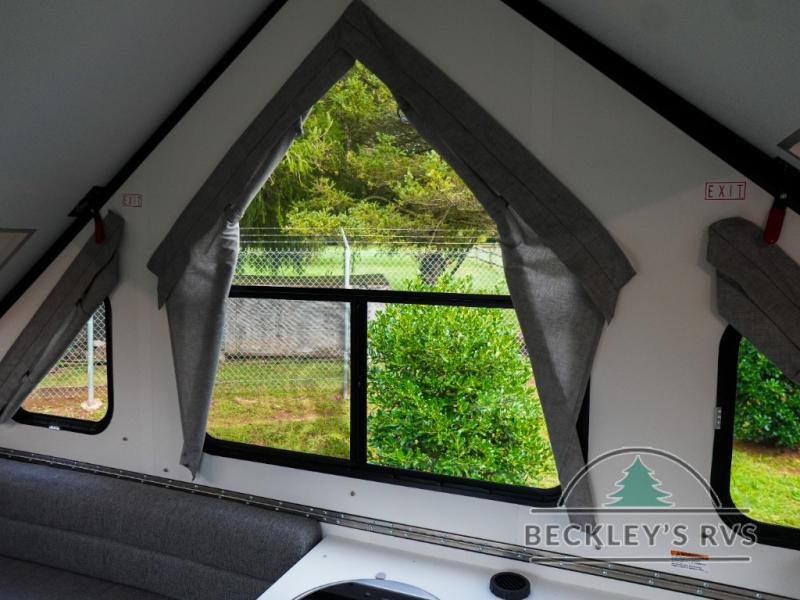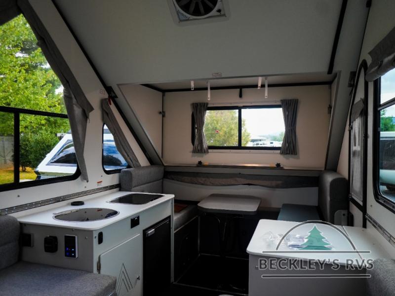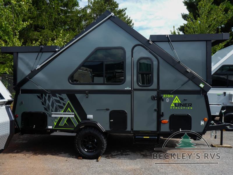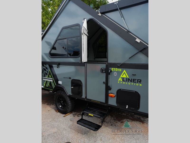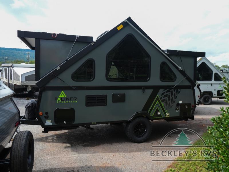 The Evolution A-frame camper by Aliner is coming to you with residential features and solid construction materials. You'll love the slate gray exterior, and the Azdel composite panels included help prolong the life of your camper. There are 15" off-road tires with graphics package, LED running lights, exterior baggage doors, plus many more exterior conveniences. The Evolution A-Frame camper comes with commercial grade, raised coin polyvinyl flooring, SIMONA BOATBOARD interior cabinets and furniture, and three indoor electrical outlets to name a few interior comforts.