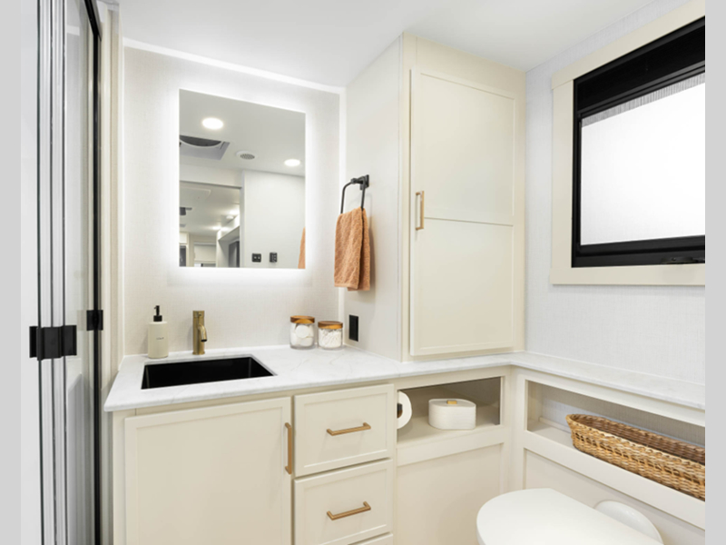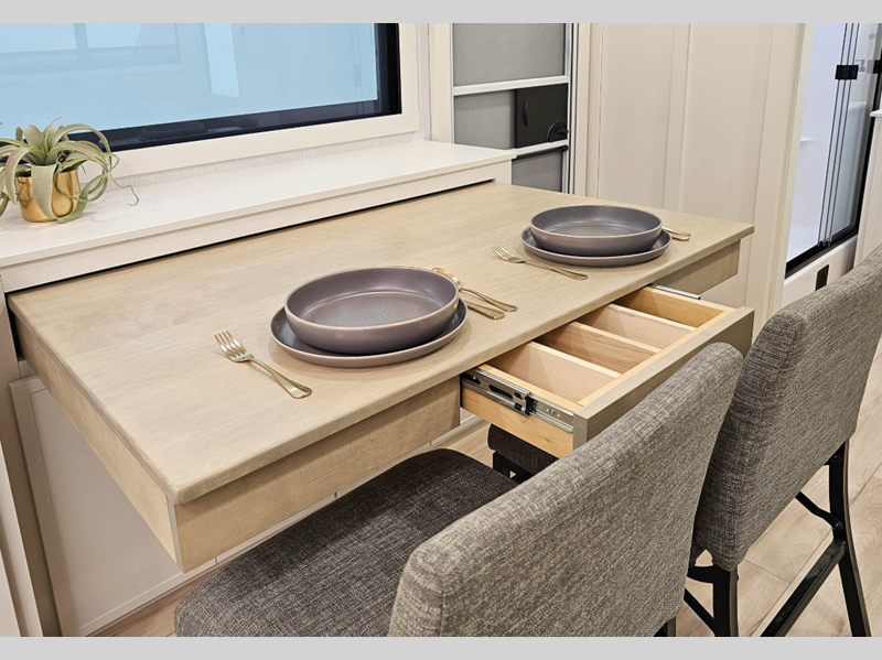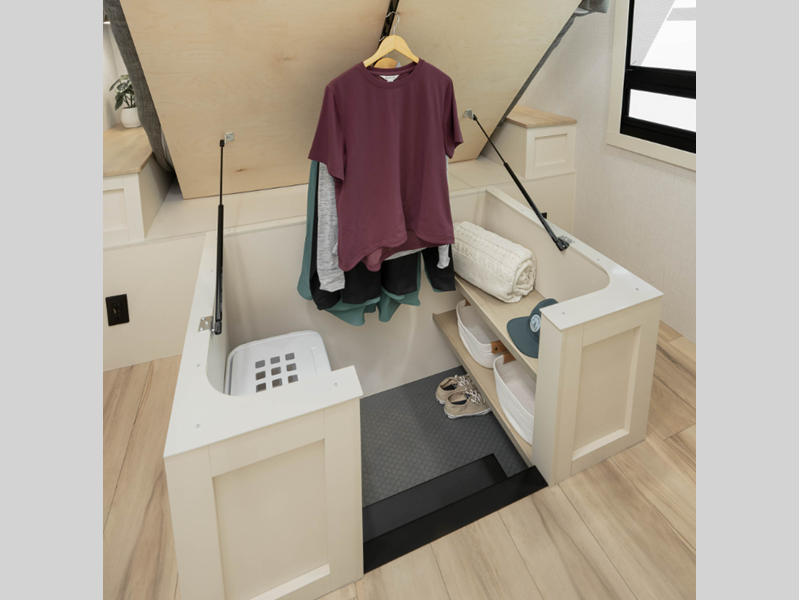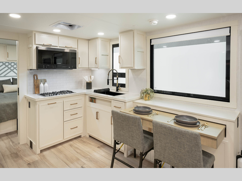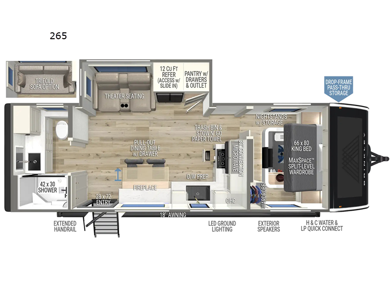 One look at this travel trailer and you'll be sold! The full rear bath features a spacious 42" x 30" shower with a built-in seat and Maxxair fan to name a few comforts. The front private bedroom features a 66" x 80" king bed with a MaxSpace Split-Level Wardrobe underneath to store shoes, clothes, and more! A slide out in the combined living area and kitchen makes your space more open, and you'll enjoy relaxing on the theater seating here in the evenings. The full kitchen includes a three burner stovetop, residential 30" convection microwave, 12 cu. ft. 12V refrigerator, plus a trash bin and Stow N' Go paper towel holder for added convenience. You can choose to eat outdoors under the 18' electric awning with LED lights or stay inside to dine at the pull-out dining table with a drawer for added storage! And if you're needing more sleeping space, just choose the optional tri-fold sofa in place of the theater seating!