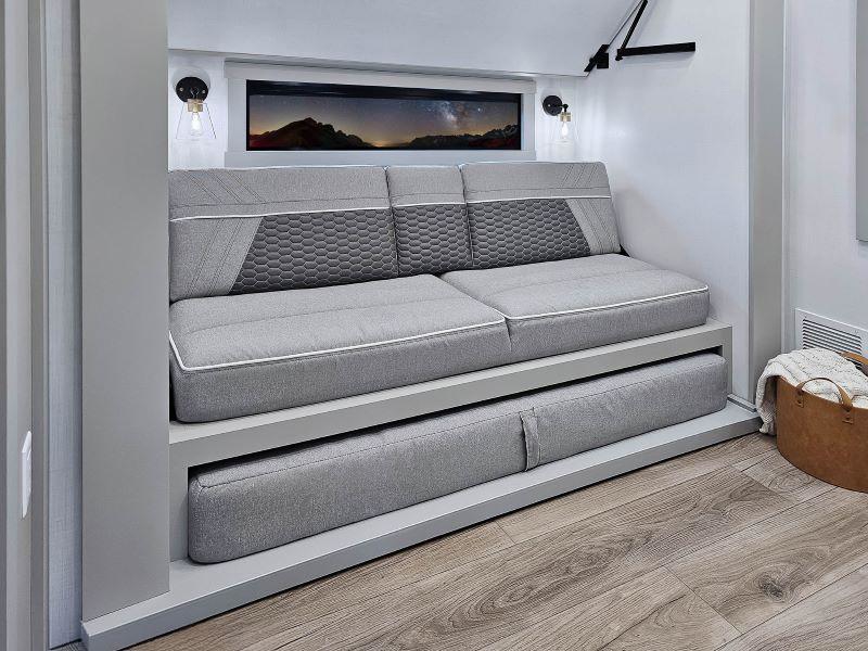 This unit is perfect for your family that needs sleeping space for eight! There is ample seating with a sliding desk/dining table, 62" theater seating, and a 72" tri-fold sofa along the rear wall. You can easily relax and enjoy the telescoping TV with a cozy fireplace below. The kitchen offers all that you need to prepare and cook meals just like home with a 16 cu. ft. refrigerator for your perishables, a 30" residential microwave oven, and three burner range top and oven. You will love the kitchen island all outfitted with pull-out pet bowls and double pull out trash bins with an integrated Stow & Go paper towel holder. There is also an 84" pantry with adjustable shelves for all of your canned and dry goods. Mid-coach, just ahead through the main entry, is a bonus room that can be used as a bedroom featuring a sofa bed with flip-up overhead bunk and trundle below, or an office with pull-out desk so that you can work easily while you travel, or it could also be used as a gaming room since there is also a 50" Smart TV. Head up the steps to a bathroom on your left and a private master suite with king bed slide all the way up front. A sliding dresser top features hidden storage which is perfect for jewelry and other personal belongings. The front wardrobe features mirrored doors and the corner closet has been prepped for a stackable washer and dryer if you choose to add that option.