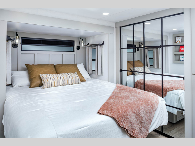 With any Model G toy hauler fifth wheel by Brinkley you will enjoy luxurious amenities, tons of storage space, and innovative features that have been developed and tested in the real world. Durable construction includes an industry leading PDI process, an industry best insulation package, and reinforced and walkable slide roofs. Some of the exterior features you'll find are a 3-way pass-through with a multi-functional flip-up bulkhead wall, under I-beam storage, a MAX-Vision reverse lighting system, and a low-maintenance roof to name a few. A Rockford Fosgate audio system comes standard, along with a OneControl app system that lets you control your fifth wheel's functions right from your mobile device. You will find the solar system with a designated storage area to be ultra convenient, plus there is a FlexPower 5500 with a dual fuel inverter generator for all your power needs. Head inside to find a residential interior with Brinkley's CraftSense wood trim construction, floating entrance steps, integrated window screens and insulated blackout blinds, and residential solid surface countertops plus backsplash. You will also enjoy the neon shower lighting and recessed medicine cabinets in the bath, plus motion activated LED bed lights and dual bedside outlets in the bedroom. Choose a Model G toy hauler fifth wheel to experience all the luxury it has to offer!
