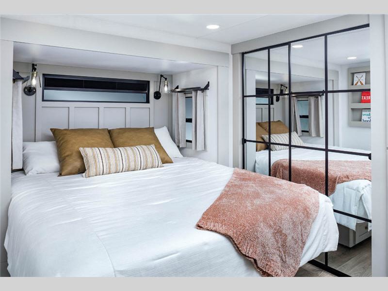 Prepare to be amazed by all the features packed into this toy hauler! There are triple slides that will provide your crew with more space, a separate garage that can sleep five with the loft included, plus a bath and a half for added convenience. The chef of your group will love the middle kitchen with a waterfall island that converts to a counter peninsula, a pull-out pantry, a GE Energy Star 19 cu. ft. refrigerator with ice and filtered water, and much more. In the combined kitchen and living space you'll find a spacious sofa with heat and massage, a fireplace, a TV, plus convenient dog bowls and shoe storage. After your toys are unloaded from the garage, you can relax on the independent dual sofas with a Fold-N-Stow table in between. You will find the front private bedroom with a king bed slide out will provide a great night's rest, and you'll also find a walk-in closet, under-bed storage, and a sliding dresser top with hidden storage for special belongings.