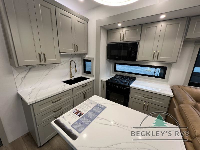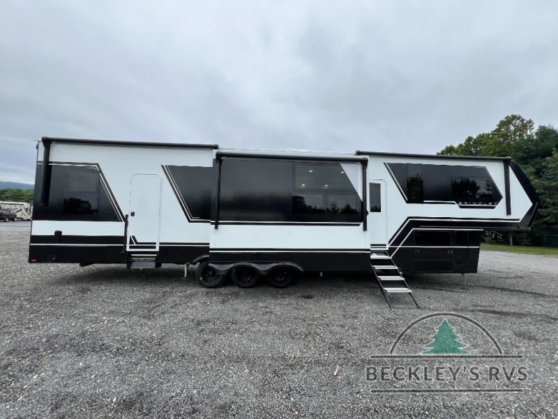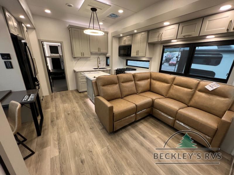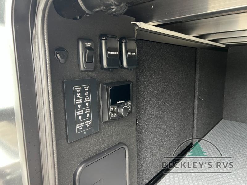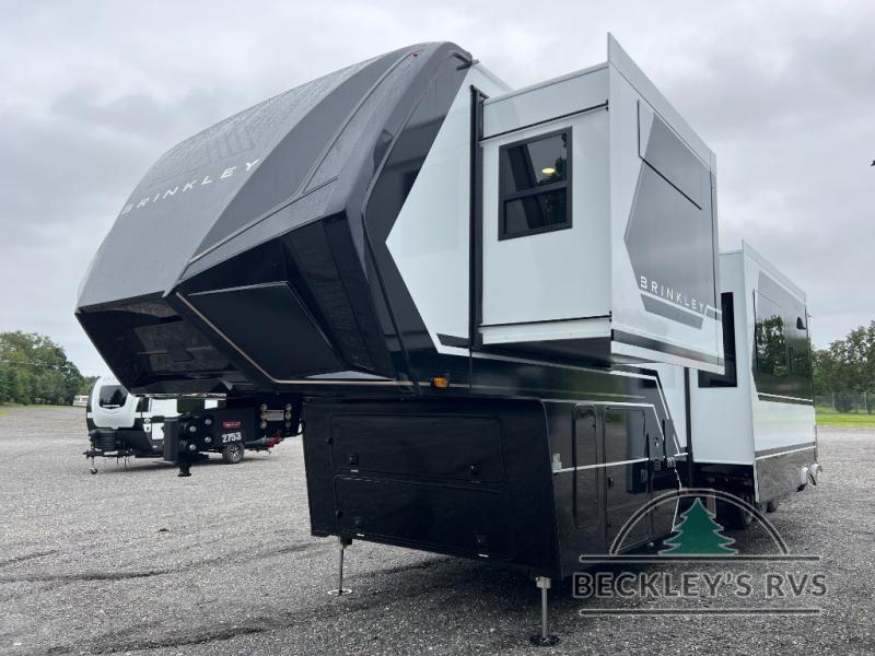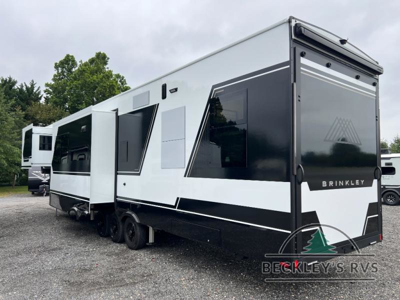With any Model G toy hauler fifth wheel by Brinkley you will enjoy luxurious amenities, tons of storage space, and innovative features that have been developed and tested in the real world. Durable construction includes an industry leading PDI process, an industry best insulation package, and reinforced and walkable slide roofs. Some of the exterior features you'll find are a 3-way pass-through with a multi-functional flip-up bulkhead wall, under I-beam storage, a MAX-Vision reverse lighting system, and a low-maintenance roof to name a few. A Rockford Fosgate audio system comes standard, along with a OneControl app system that lets you control your fifth wheel's functions right from your mobile device. You will find the solar system with a designated storage area to be ultra convenient, plus there is a FlexPower 5500 with a dual fuel inverter generator for all your power needs. Head inside to find a residential interior with Brinkley's CraftSense wood trim construction, floating entrance steps, integrated window screens and insulated blackout blinds, and residential solid surface countertops plus backsplash. You will also enjoy the neon shower lighting and recessed medicine cabinets in the bath, plus motion activated LED bed lights and dual bedside outlets in the bedroom. Choose a Model G toy hauler fifth wheel to experience all the luxury it has to offer!