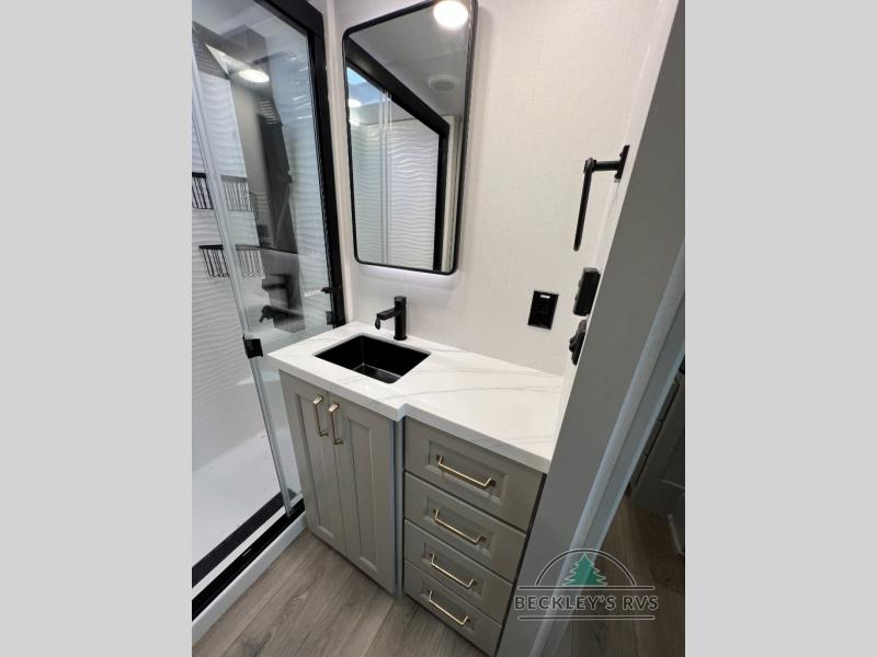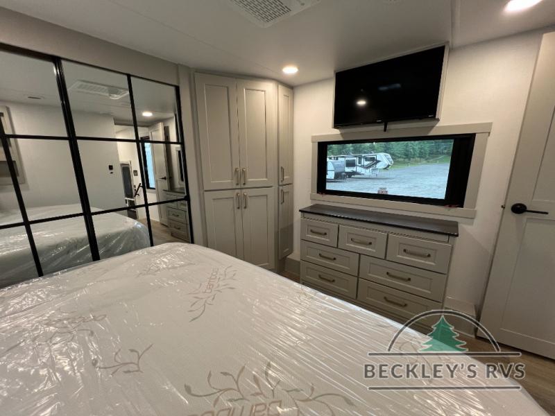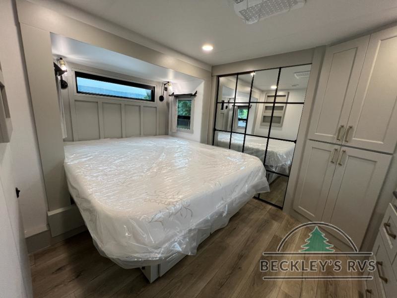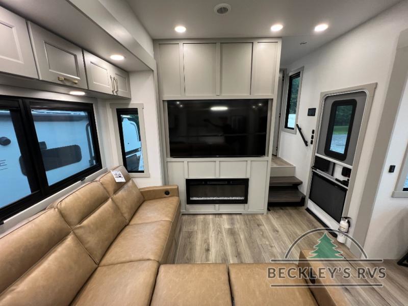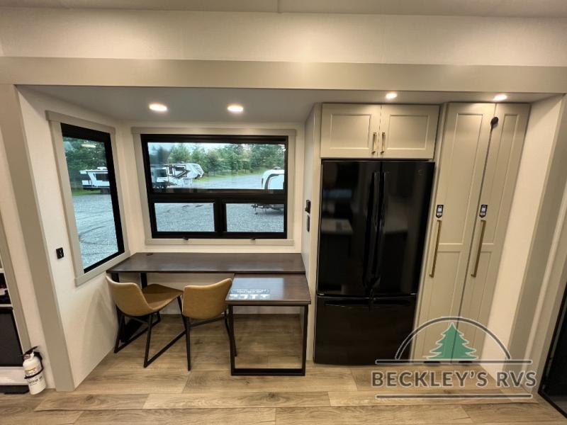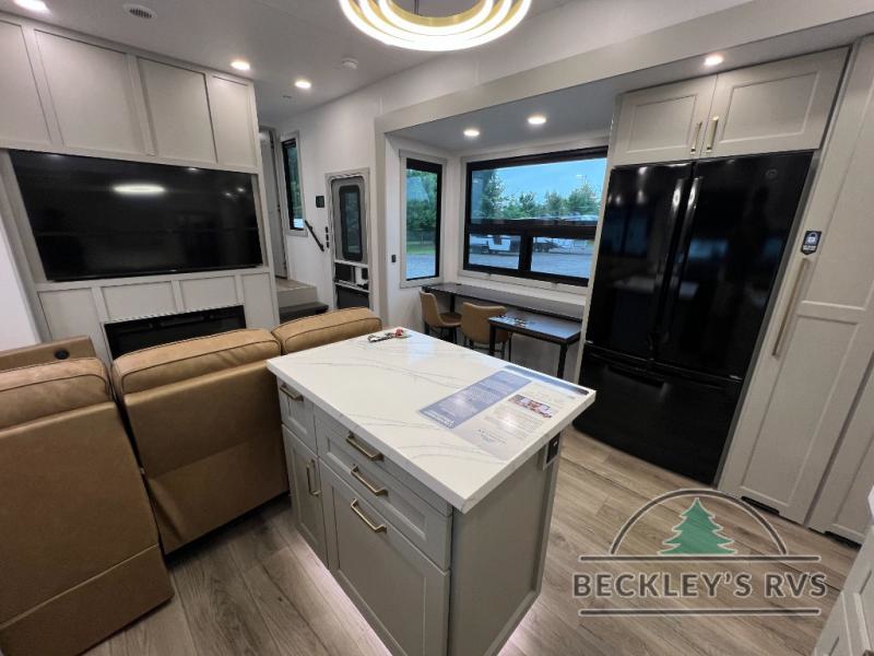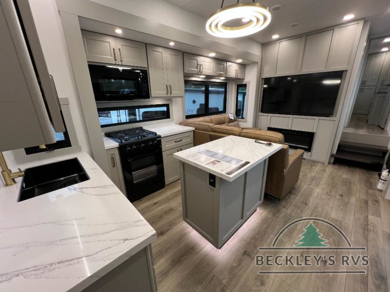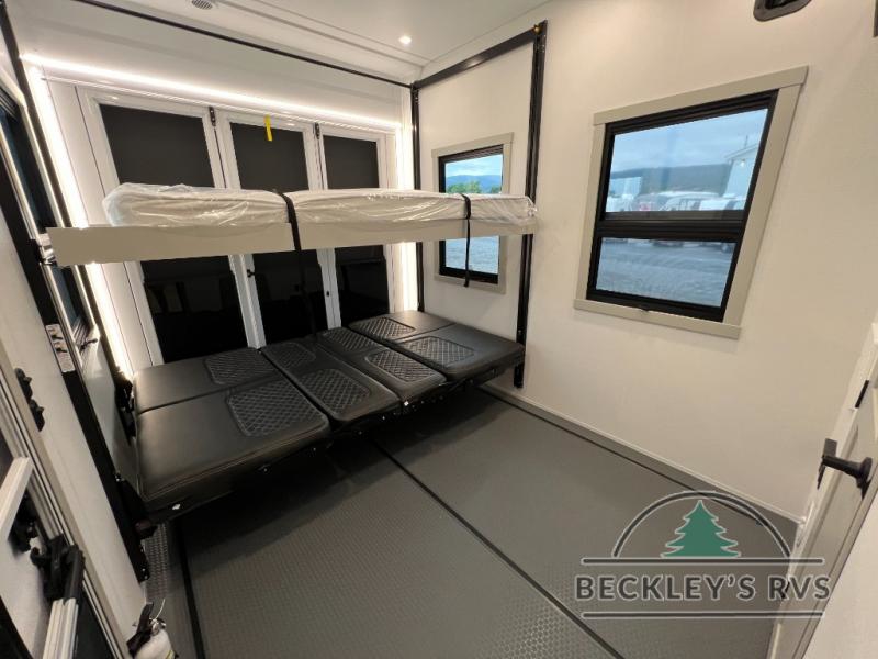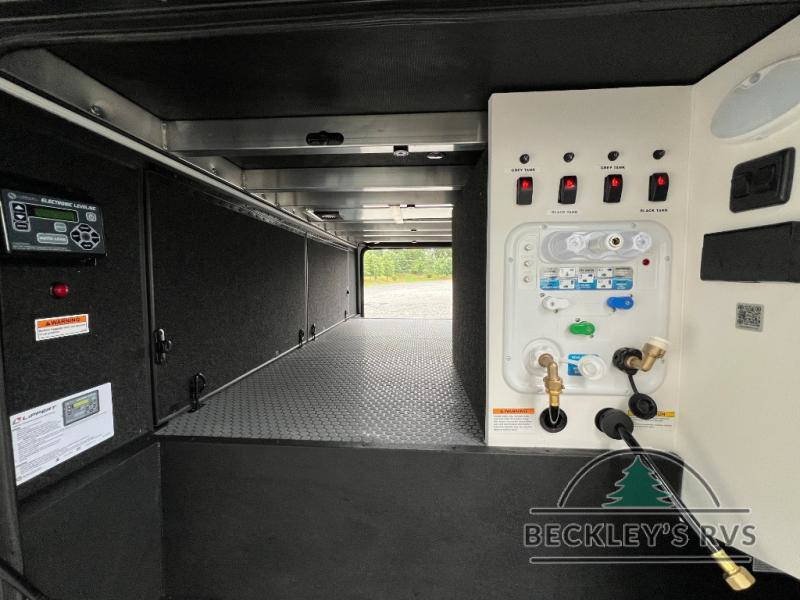 Whether you use this toy hauler to haul your favorite ride-on toys or as a mobile office, you're sure to love every inch of it! The 14' separate garage includes a Fold-N-Stow table and independent dual sofas, along with a full bath and a loft/storage with a twin bed for more sleeping space. The middle kitchen is every chef's dream with its GE appliances, kitchen island, and convenient features, such as pull-out trash bins and a cutting board, a pull-down knife rack and utensil tray, and a pull-out pantry/utility closet! Right next to the kitchen is the living room with a L-sofa with four modes, a 65" Phillips Smart TV and a fireplace, plus a convertible dining table/L-desk where you can dine or get some work done. You'll love the second full bath up front close to the private bedroom, and here, you'll find a king bed slide out, under-bed storage drawers and motion lights, a walk-in closet with cordless vacuum prep, and a sliding dresser top with hidden storage for valuables. There is also washer and dryer prep in the bedroom and garage, making this toy hauler full-time capable!
