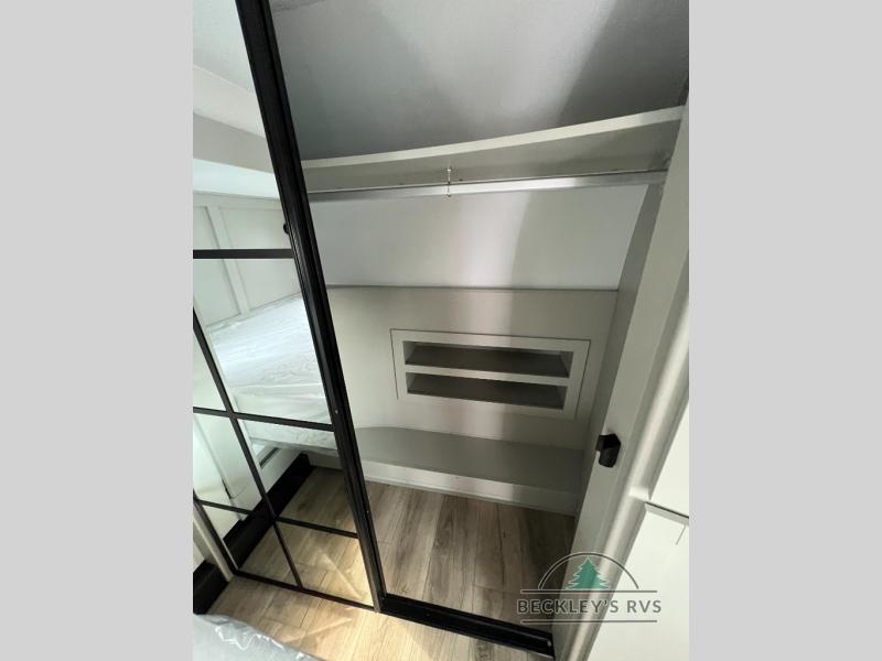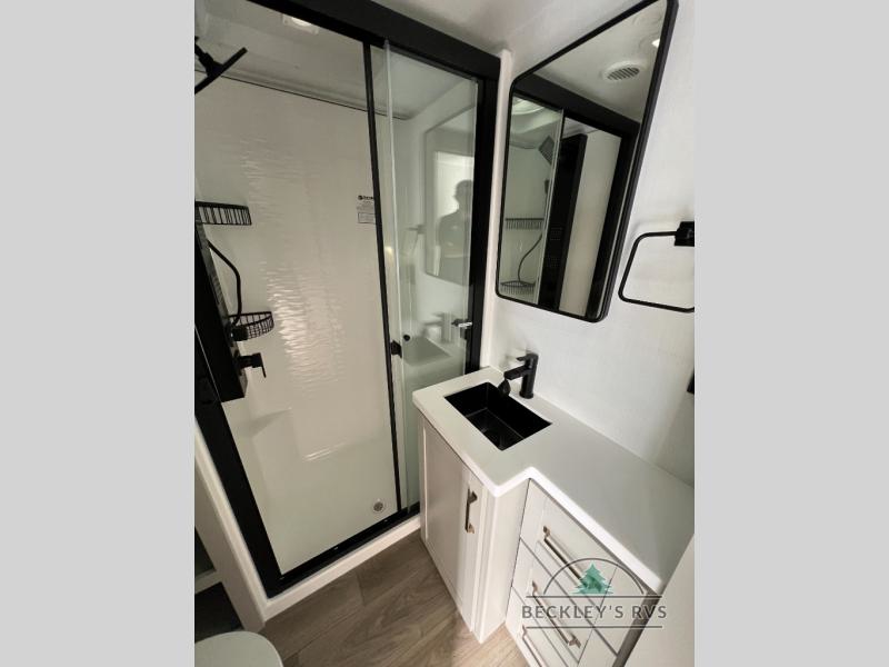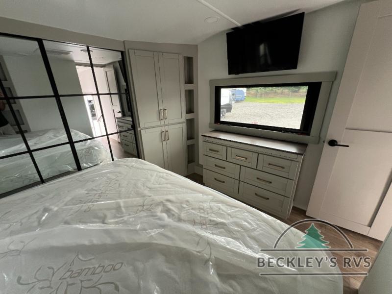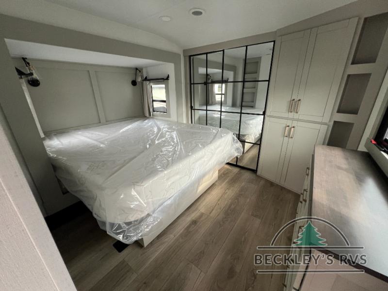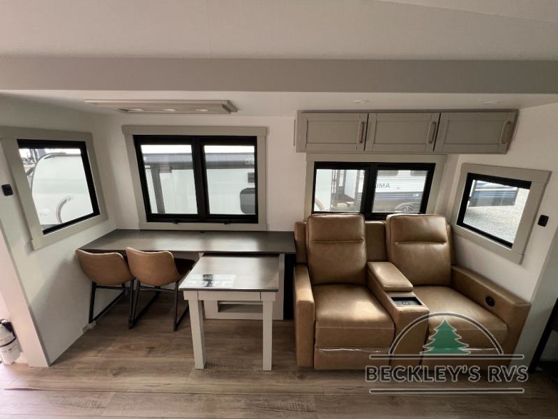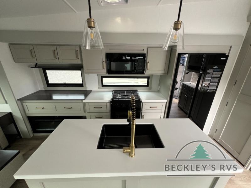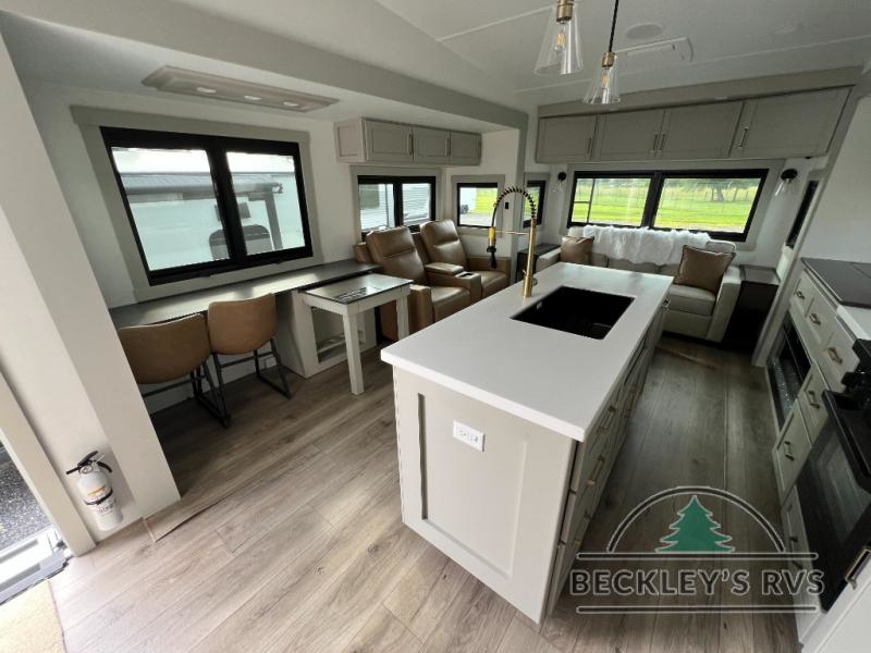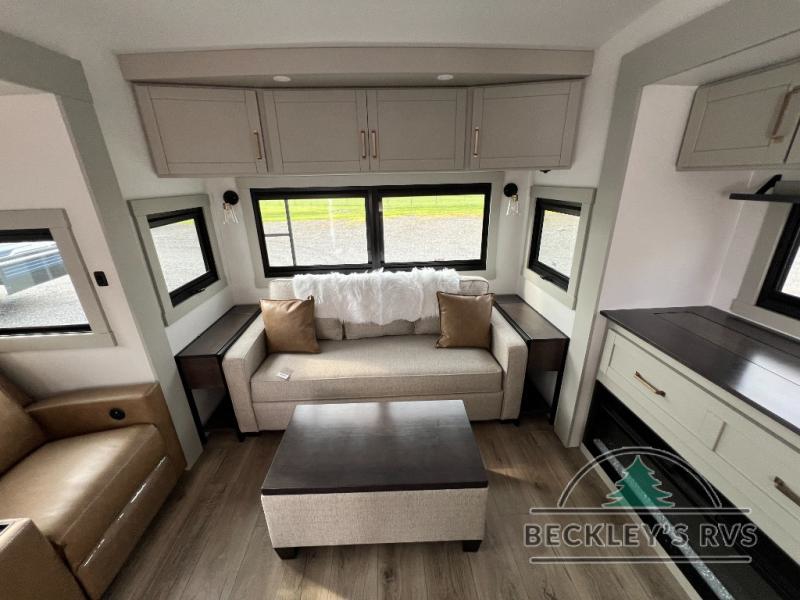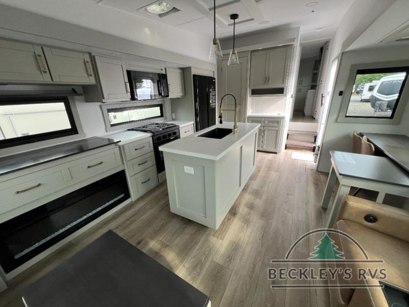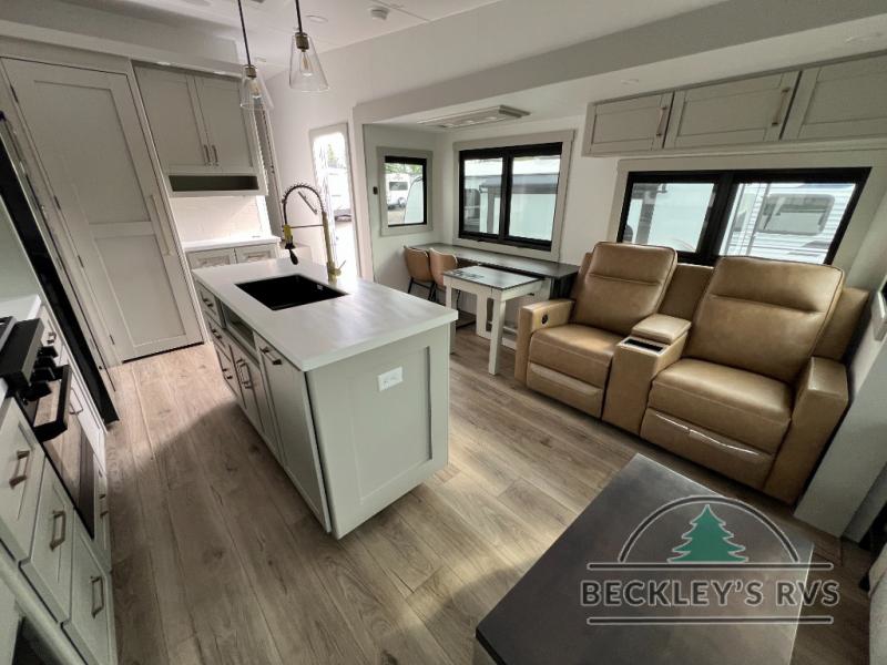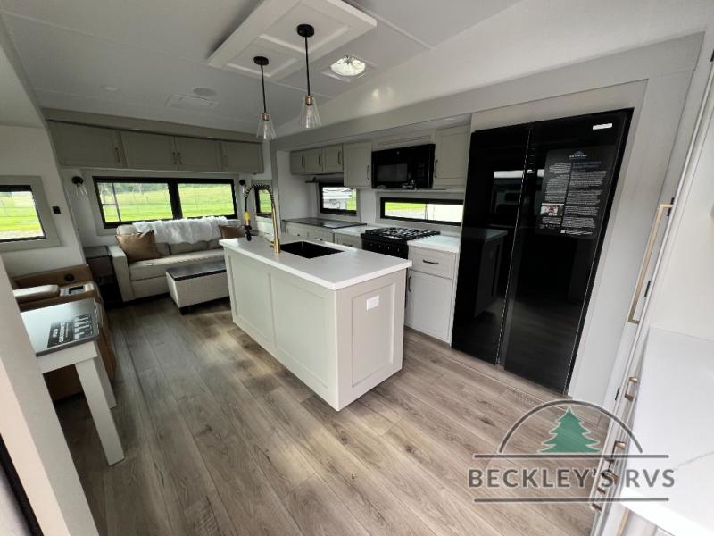 This Model Z luxury fifth wheel is bright and modern on the inside, with loads of amenities that will have you dreaming of your next trip! Enter and find a spacious combined living/kitchen space thanks to dual opposing slides. There is ample seating with a sliding desk/dining table, 62" theater seating, and a 72" tri-fold sofa along the rear wall. You can easily relax and enjoy the 50" Smart telescoping TV with a cozy fireplace below. The kitchen offers all that you need to prepare and cook meals just like home with a 16 cu. ft. refrigerator for your perishables, a 30" microwave oven, and three burner range top and oven. You will love the integrated spice rack, and the kitchen island all outfitted with dog bowls and double pull out trash bins with an integrated Stow 'N Go paper towel holder. There is also an 84" pantry with adjustable shelves for all of your canned and dry goods. Head up the steps to a private master suite with king bed slide. You can opt for the queen bed if you like. A sliding dresser top features hidden storage which is perfect for jewelry and other personal belongings. The front wardrobe features mirrored doors and the corner closet has been prepped for a stackable washer and dryer if you choose to add that option. Relax and enjoy a large bath featuring a linen cabinet, a 30" x 42" shower, and vanity with sink, plus medicine cabinet.