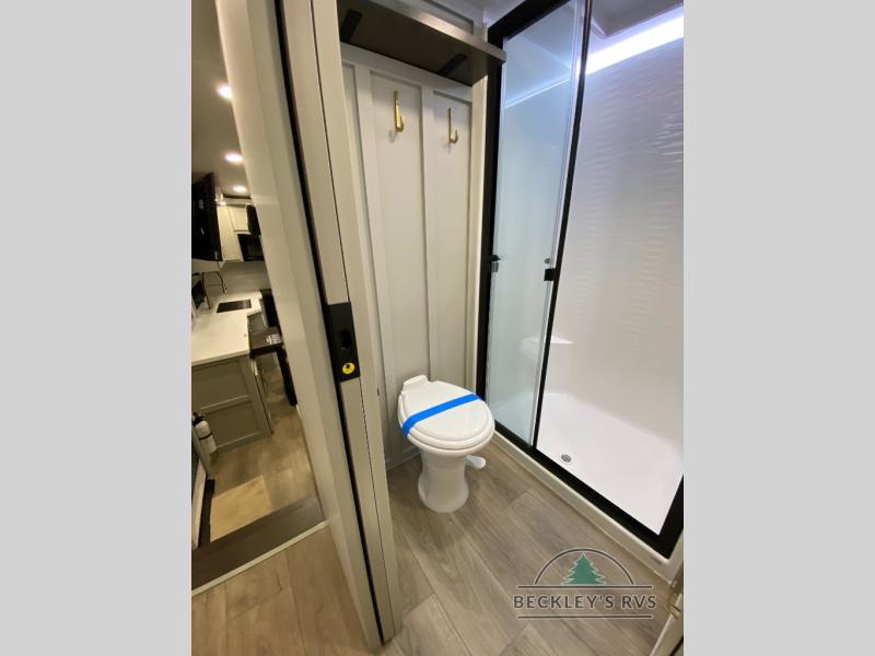 Start living your best camping life in this fifth wheel! The rear bunkhouse has an L shaped 72" x 92" x 32" top bunk above cubbies and a 44" x 72" bottom bunk, plus its very own private entrance/exit door to the unit. Just outside the bunkhouse is the kitchen which has everything you need to prepare your best home cooked meals including a flip-up countertop extension, a trash bin with Stow N' Go paper towel, and an area prepped for a dishwasher. Enjoy your delicious home cooked meals at the sliding dining/desk table then relax on either the 62" theater seating or 64" tri-fold sofa that extends into a 54" x 70" bed for more guests. As you step up the stairs to head up to the full bathroom and front private bedroom, you will notice that they have shoe storage to keep things tidy. Crank up the tunes with the exterior speakers and grab a cold beverage from the exterior refrigerator with storage drawers near it too!