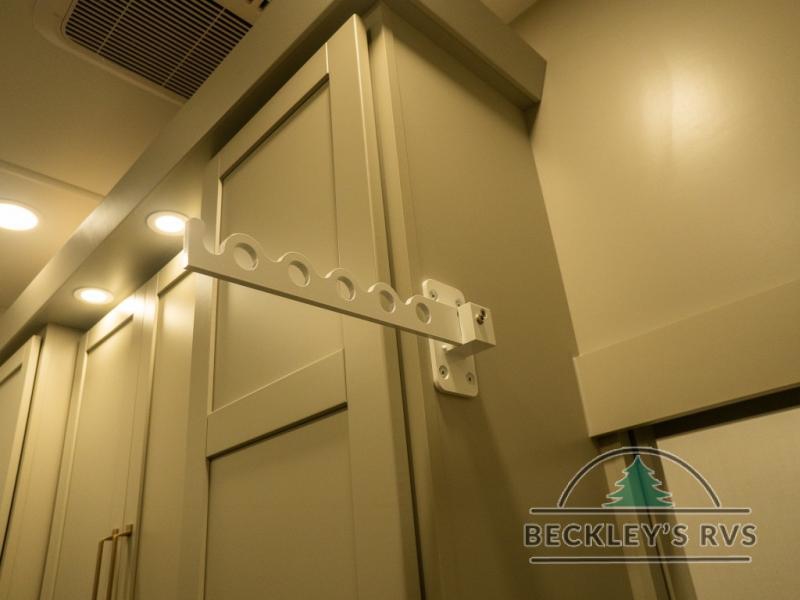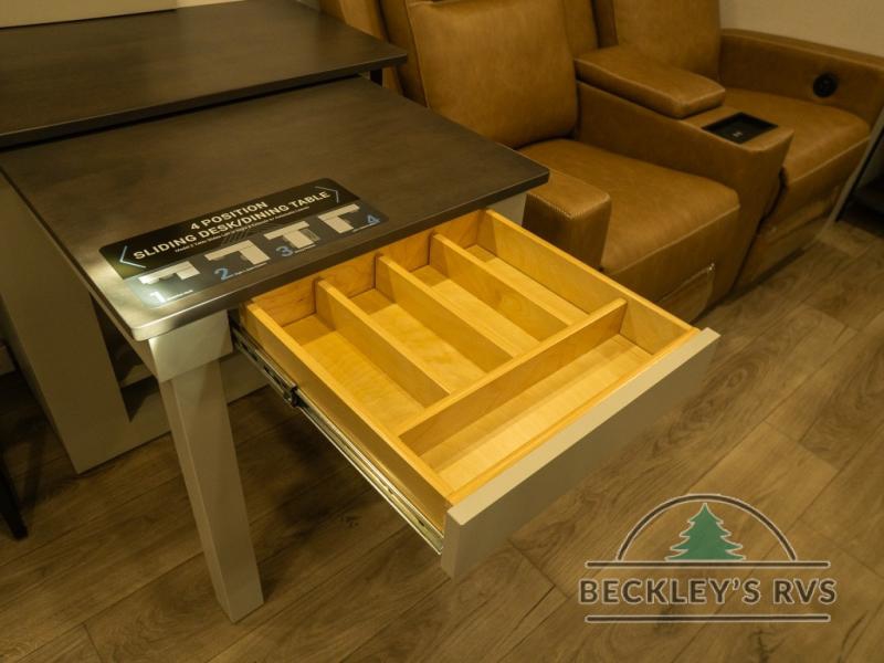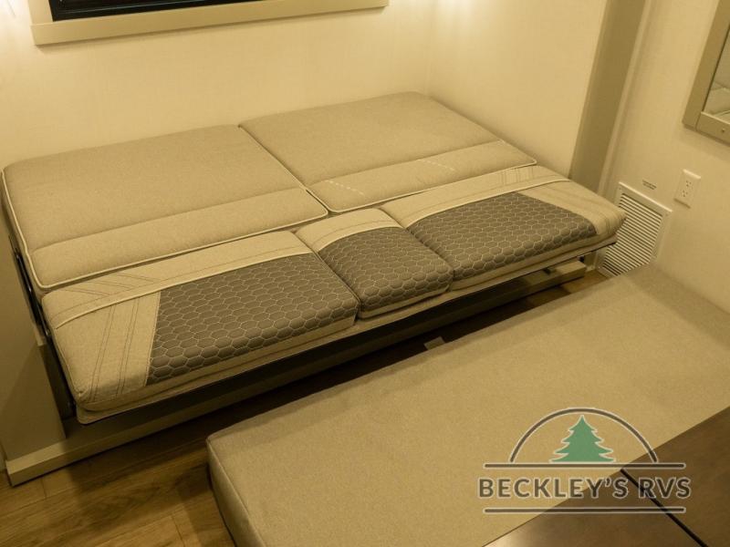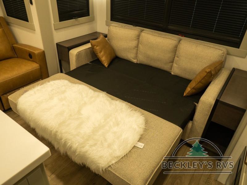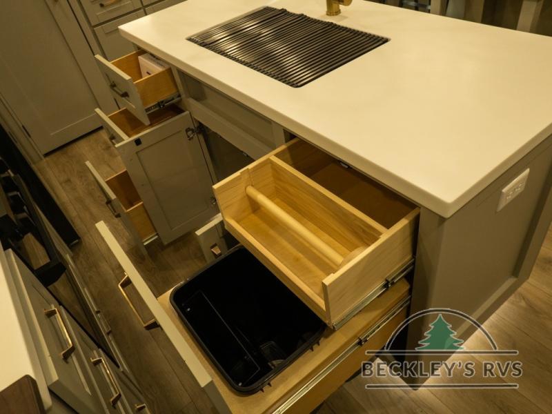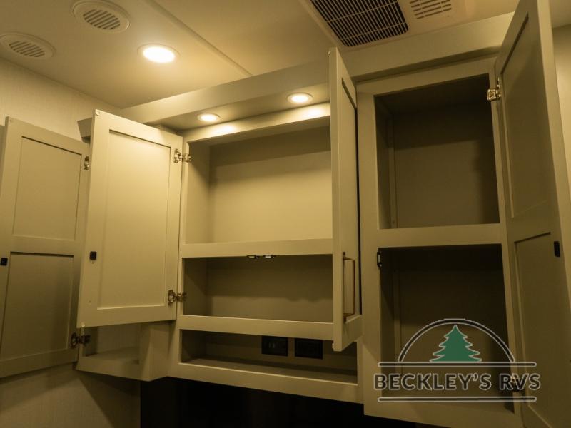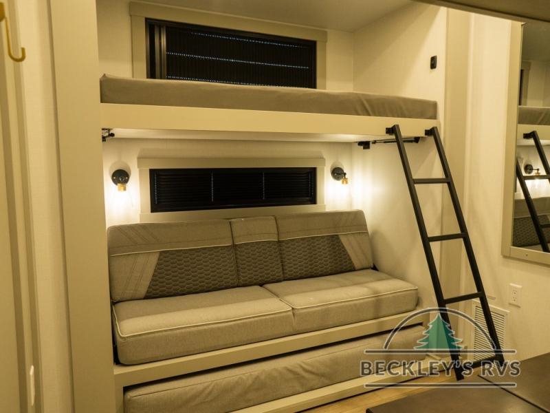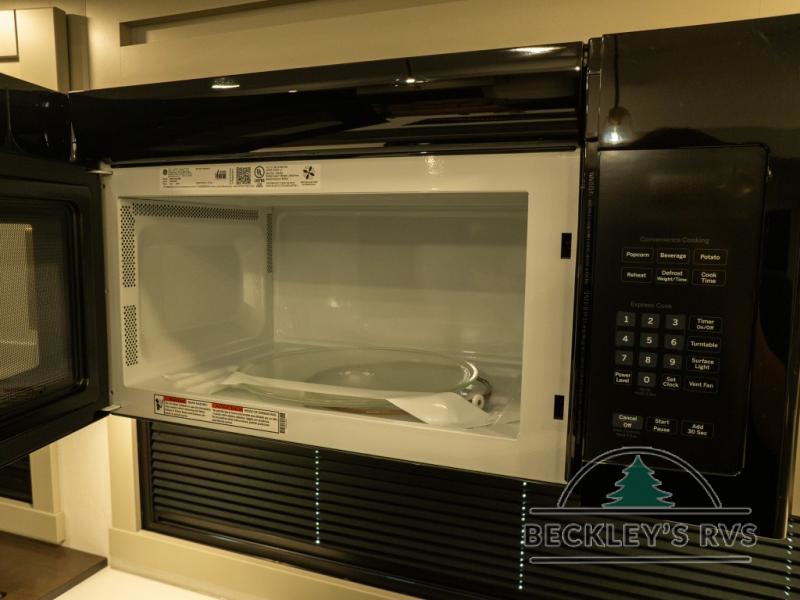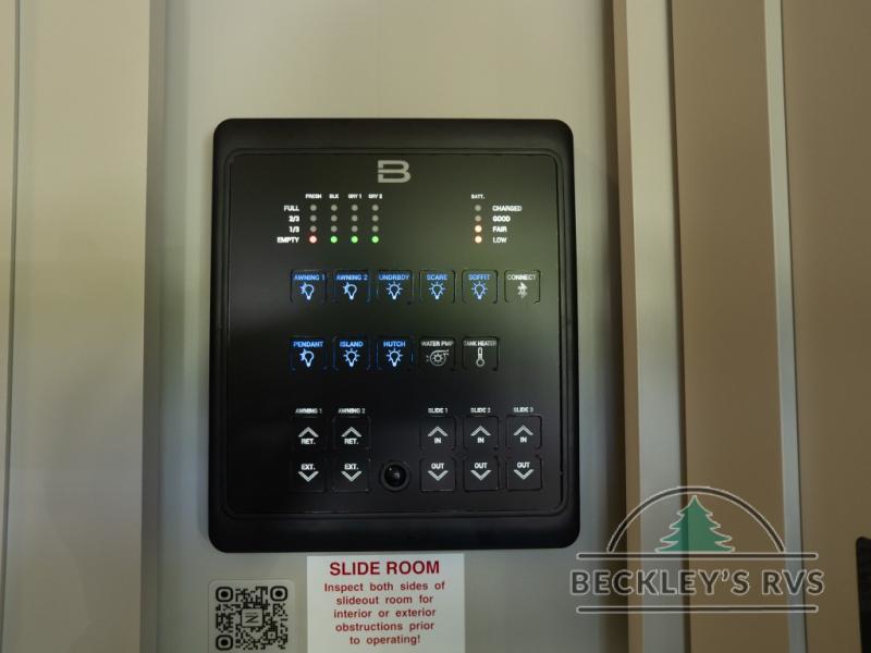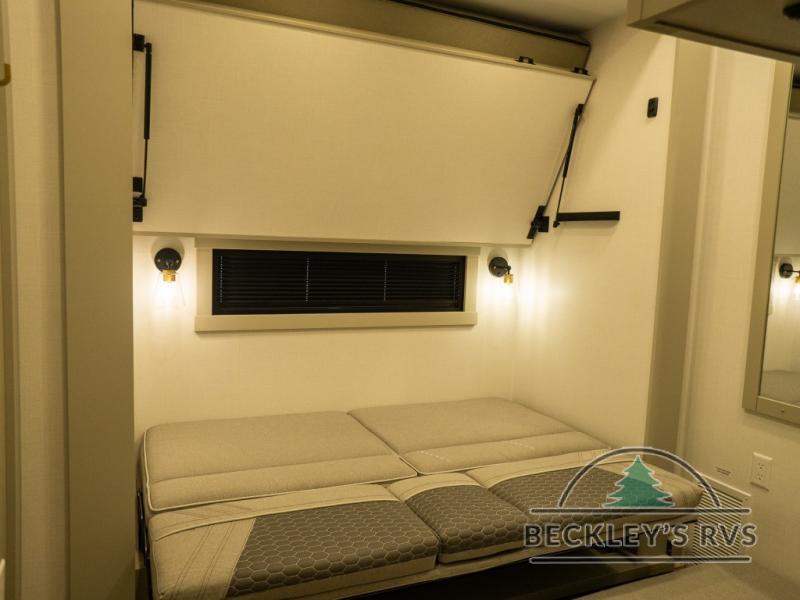 This unit is perfect for your family that needs sleeping space for eight! There is ample seating with a sliding desk/dining table, 62" theater seating, and a 72" tri-fold sofa along the rear wall. You can easily relax and enjoy the telescoping TV with a cozy fireplace below. The kitchen offers all that you need to prepare and cook meals just like home with a 16 cu. ft. refrigerator for your perishables, a 30" residential microwave oven, and three burner range top and oven. You will love the kitchen island all outfitted with pull-out pet bowls and double pull out trash bins with an integrated Stow & Go paper towel holder. There is also an 84" pantry with adjustable shelves for all of your canned and dry goods. Mid-coach, just ahead through the main entry, is a bonus room that can be used as a bedroom featuring a sofa bed with flip-up overhead bunk and trundle below, or an office with pull-out desk so that you can work easily while you travel, or it could also be used as a gaming room since there is also a 50" Smart TV. Head up the steps to a bathroom on your left and a private master suite with king bed slide all the way up front. A sliding dresser top features hidden storage which is perfect for jewelry and other personal belongings. The front wardrobe features mirrored doors and the corner closet has been prepped for a stackable washer and dryer if you choose to add that option.