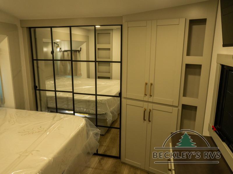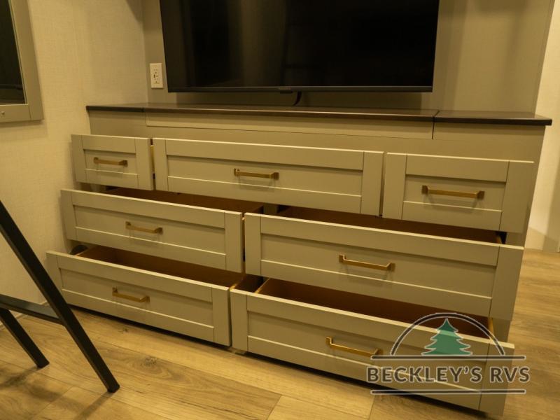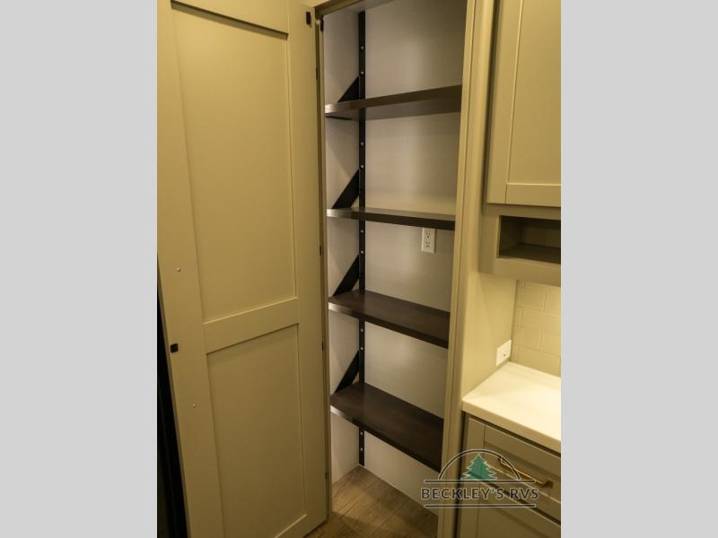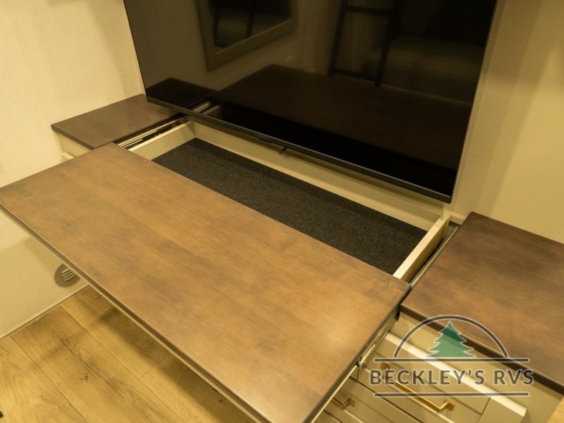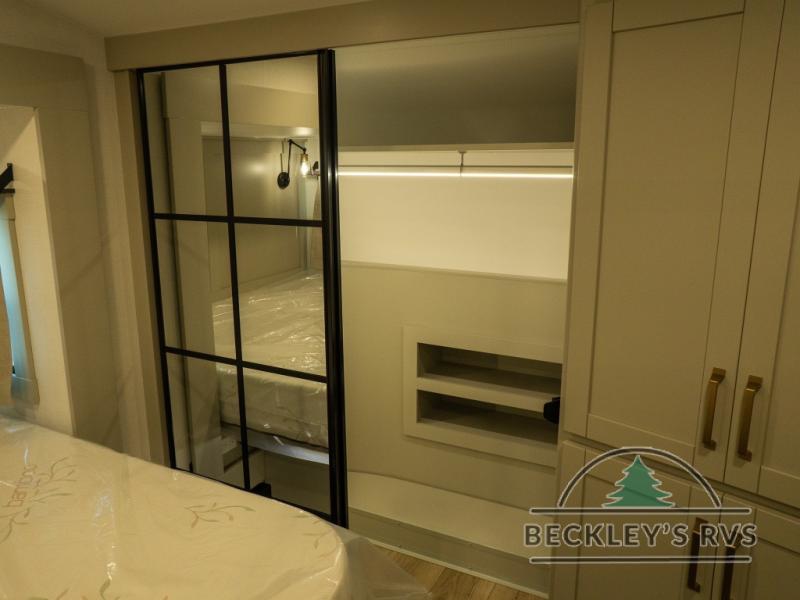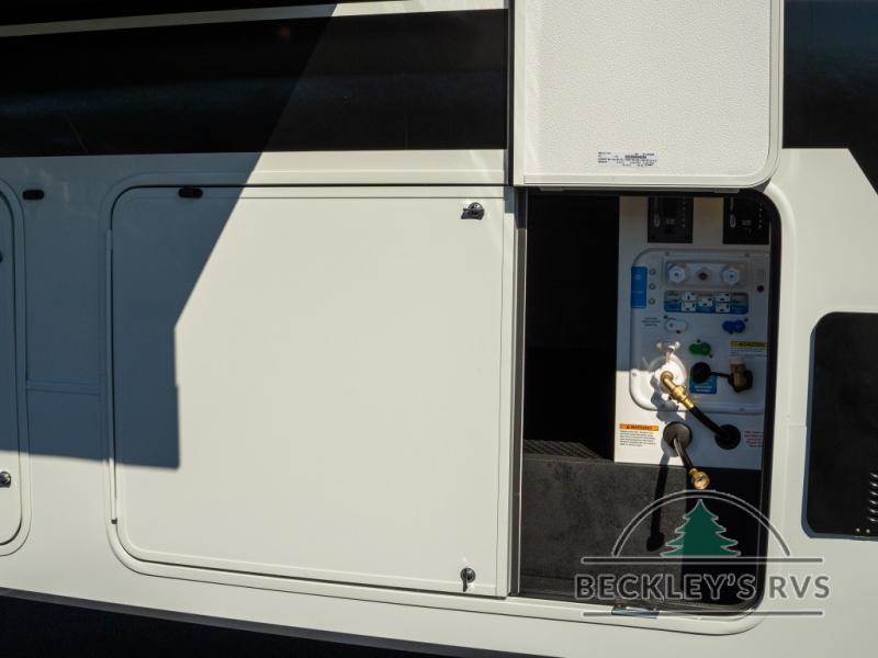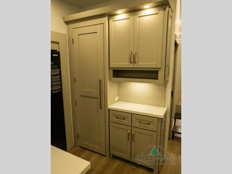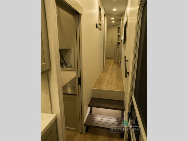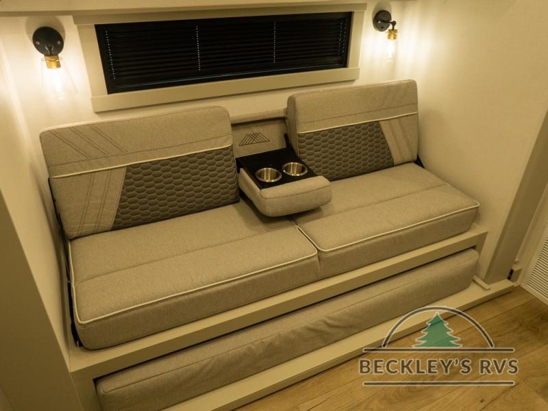 This unit is perfect for your family that needs sleeping space for eight! There is ample seating with a sliding desk/dining table, 62" theater seating, and a 72" tri-fold sofa along the rear wall. You can easily relax and enjoy the telescoping TV with a cozy fireplace below. The kitchen offers all that you need to prepare and cook meals just like home with a 16 cu. ft. refrigerator for your perishables, a 30" residential microwave oven, and three burner range top and oven. You will love the kitchen island all outfitted with pull-out pet bowls and double pull out trash bins with an integrated Stow & Go paper towel holder. There is also an 84" pantry with adjustable shelves for all of your canned and dry goods. Mid-coach, just ahead through the main entry, is a bonus room that can be used as a bedroom featuring a sofa bed with flip-up overhead bunk and trundle below, or an office with pull-out desk so that you can work easily while you travel, or it could also be used as a gaming room since there is also a 50" Smart TV. Head up the steps to a bathroom on your left and a private master suite with king bed slide all the way up front. A sliding dresser top features hidden storage which is perfect for jewelry and other personal belongings. The front wardrobe features mirrored doors and the corner closet has been prepped for a stackable washer and dryer if you choose to add that option.