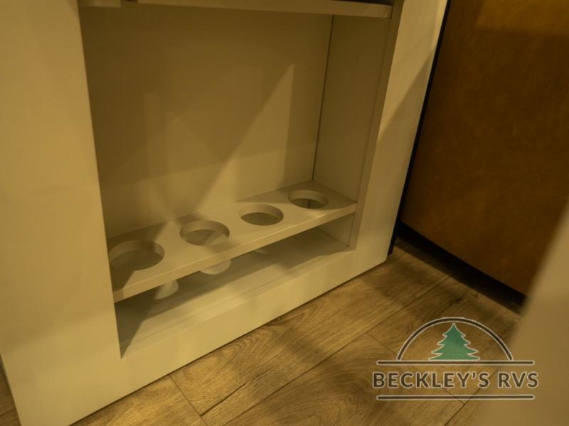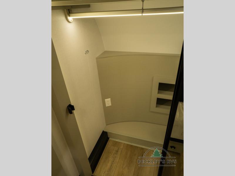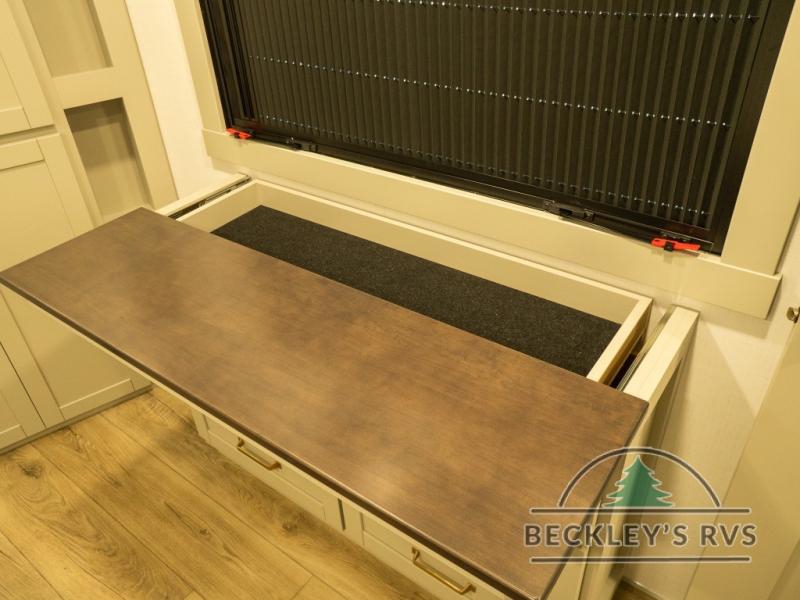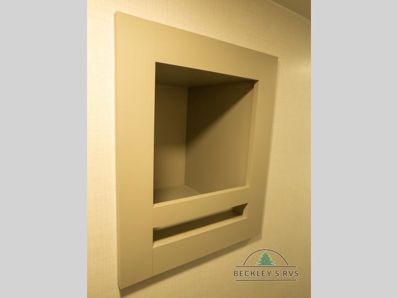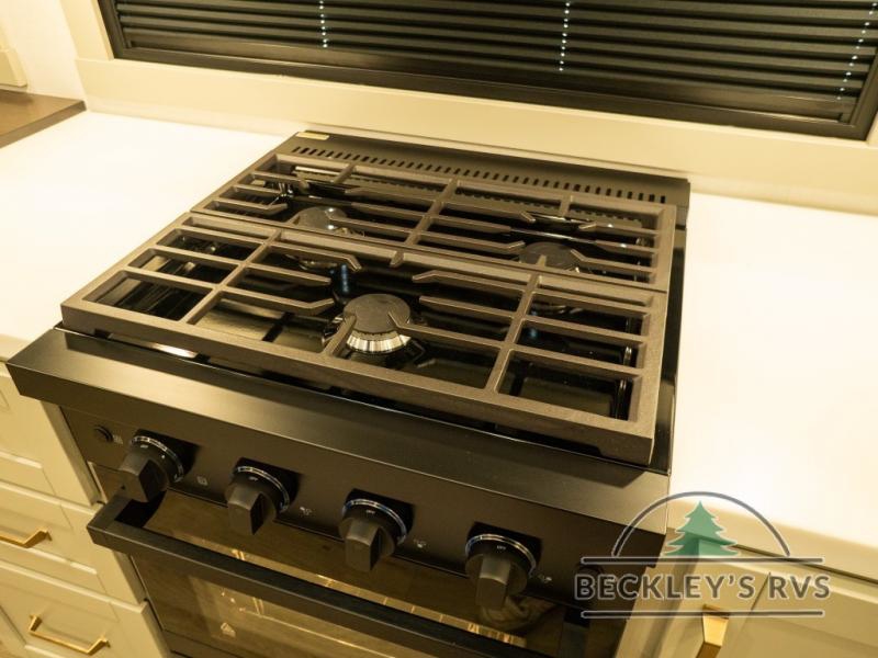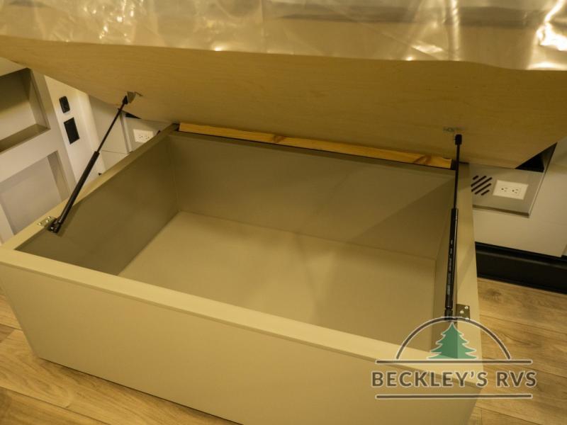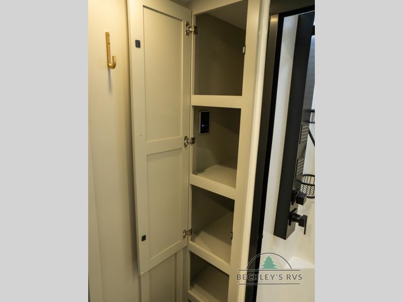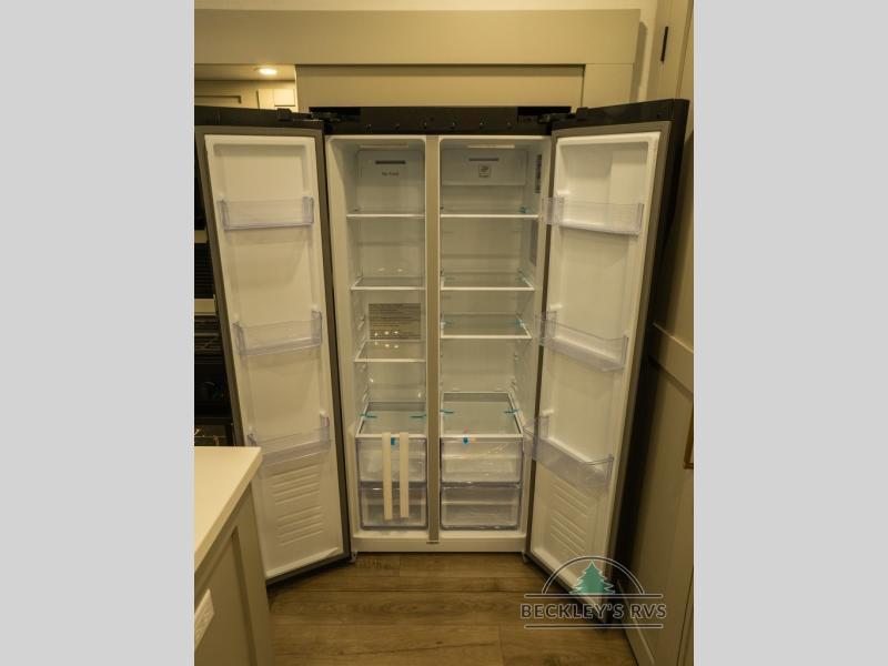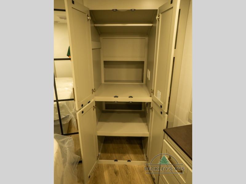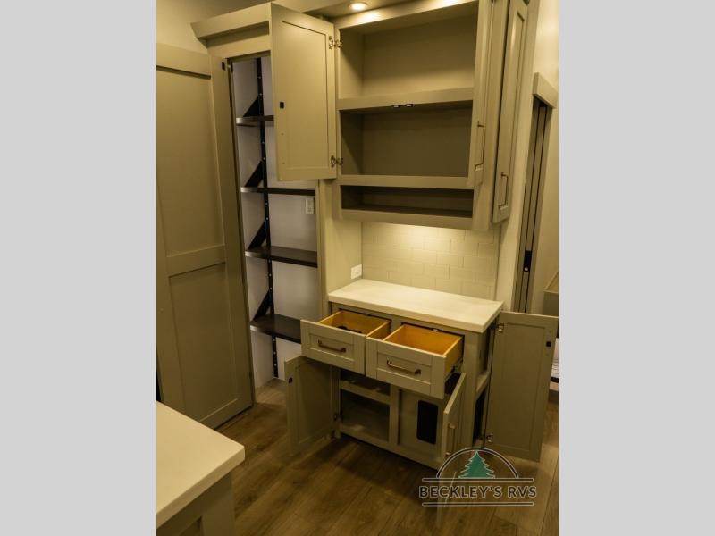 This unit is perfect for your family that needs sleeping space for eight! There is ample seating with a sliding desk/dining table, 62" theater seating, and a 72" tri-fold sofa along the rear wall. You can easily relax and enjoy the telescoping TV with a cozy fireplace below. The kitchen offers all that you need to prepare and cook meals just like home with a 16 cu. ft. refrigerator for your perishables, a 30" residential microwave oven, and three burner range top and oven. You will love the kitchen island all outfitted with pull-out pet bowls and double pull out trash bins with an integrated Stow & Go paper towel holder. There is also an 84" pantry with adjustable shelves for all of your canned and dry goods. Mid-coach, just ahead through the main entry, is a bonus room that can be used as a bedroom featuring a sofa bed with flip-up overhead bunk and trundle below, or an office with pull-out desk so that you can work easily while you travel, or it could also be used as a gaming room since there is also a 50" Smart TV. Head up the steps to a bathroom on your left and a private master suite with king bed slide all the way up front. A sliding dresser top features hidden storage which is perfect for jewelry and other personal belongings. The front wardrobe features mirrored doors and the corner closet has been prepped for a stackable washer and dryer if you choose to add that option.