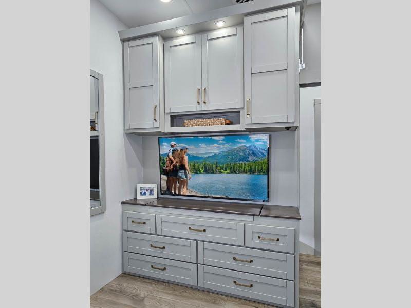 This unit is perfect for your family that needs sleeping space for eight! There is ample seating with a sliding desk/dining table, 62" theater seating, and a 72" tri-fold sofa along the rear wall. You can easily relax and enjoy the telescoping TV with a cozy fireplace below. The kitchen offers all that you need to prepare and cook meals just like home with a 16 cu. ft. refrigerator for your perishables, a 30" residential microwave oven, and three burner range top and oven. You will love the kitchen island all outfitted with pull-out pet bowls and double pull out trash bins with an integrated Stow & Go paper towel holder. There is also an 84" pantry with adjustable shelves for all of your canned and dry goods. Mid-coach, just ahead through the main entry, is a bonus room that can be used as a bedroom featuring a sofa bed with flip-up overhead bunk and trundle below, or an office with pull-out desk so that you can work easily while you travel, or it could also be used as a gaming room since there is also a 50" Smart TV. Head up the steps to a bathroom on your left and a private master suite with king bed slide all the way up front. A sliding dresser top features hidden storage which is perfect for jewelry and other personal belongings. The front wardrobe features mirrored doors and the corner closet has been prepped for a stackable washer and dryer if you choose to add that option.