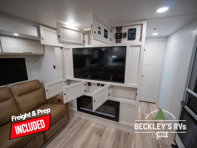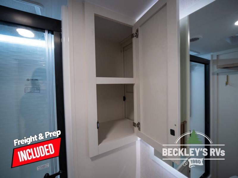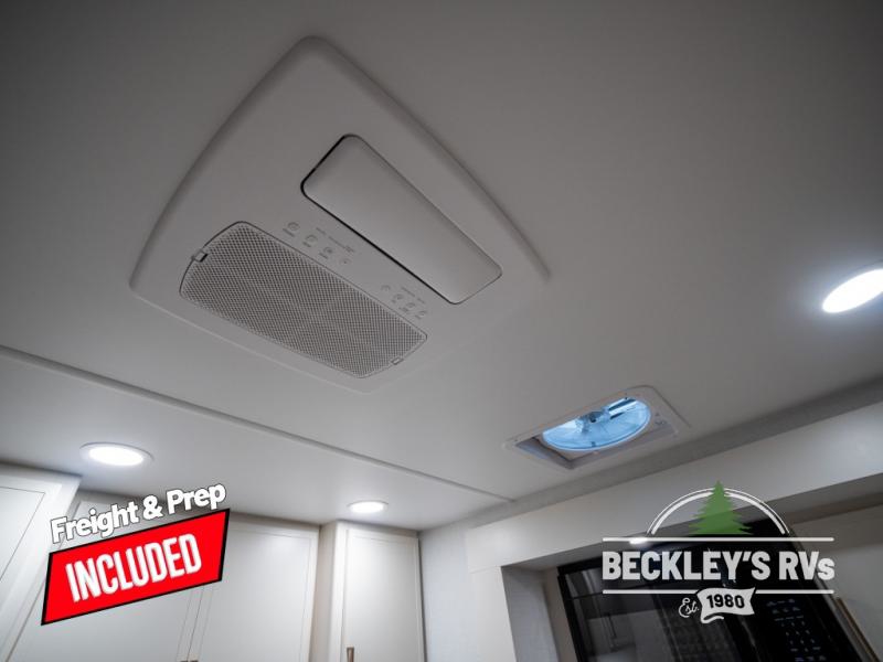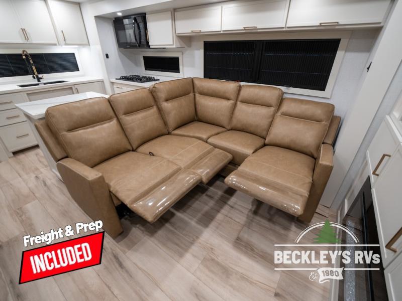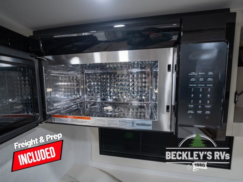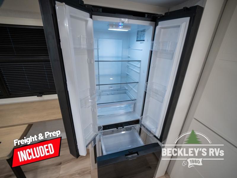 Savor the joy of cooking and sharing meals with loved ones in this beautifully appointed kitchen! This rear kitchen features a spacious pantry with drawers and outlets, a 30" convection microwave, a flip-up counter, and a 12V refrigerator. The convertible dining table and L-desk create a refined space for meals, work, and relaxation. The adjacent L-sofa forms a cozy sanctuary for reading, socializing, or enjoying the entertainment center and fireplace. There is a full bathroom with everything you need to keep your personal hygiene on the road. Plus, the front bedroom’s peaceful haven features a plush king bed, nightstands with storage, and a MaxSpace split-level wardrobe. Additionally, the two exterior awnings create a spacious outdoor living area, ideal for relaxing, entertaining, or enjoying the great outdoors.