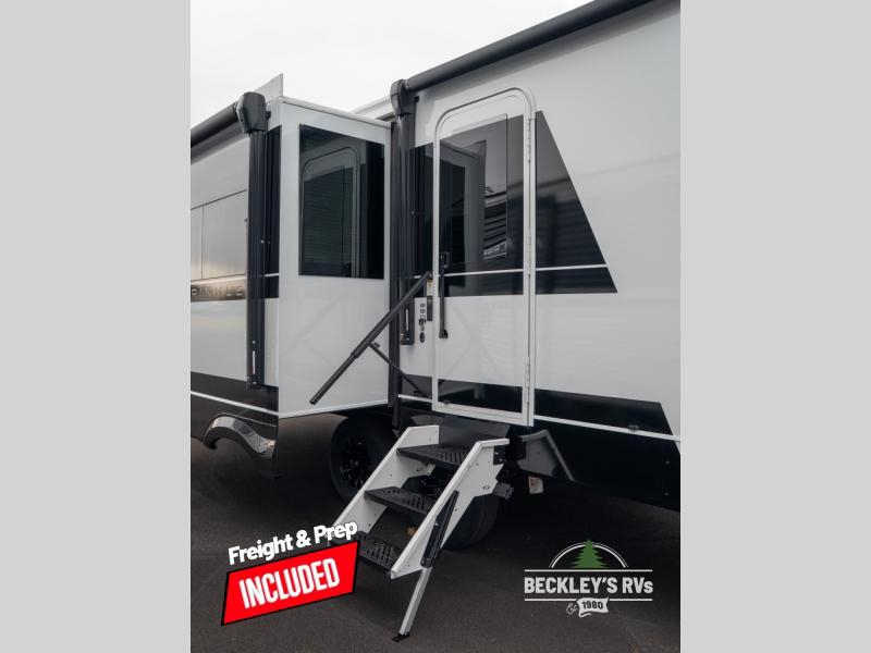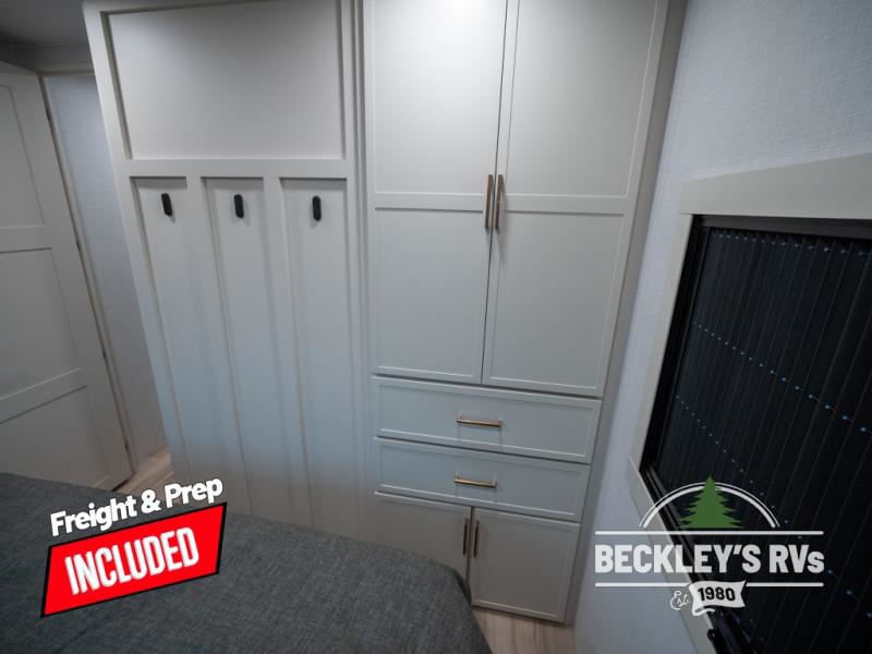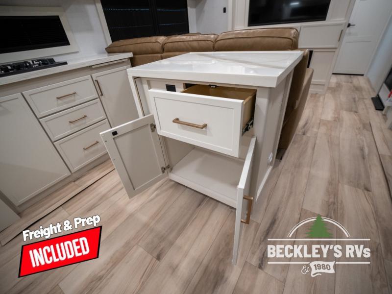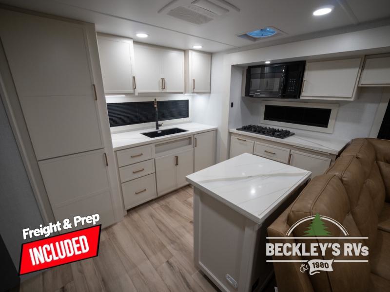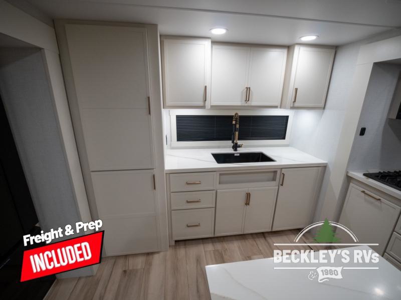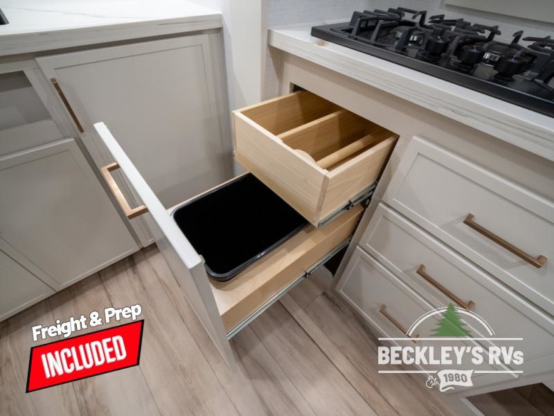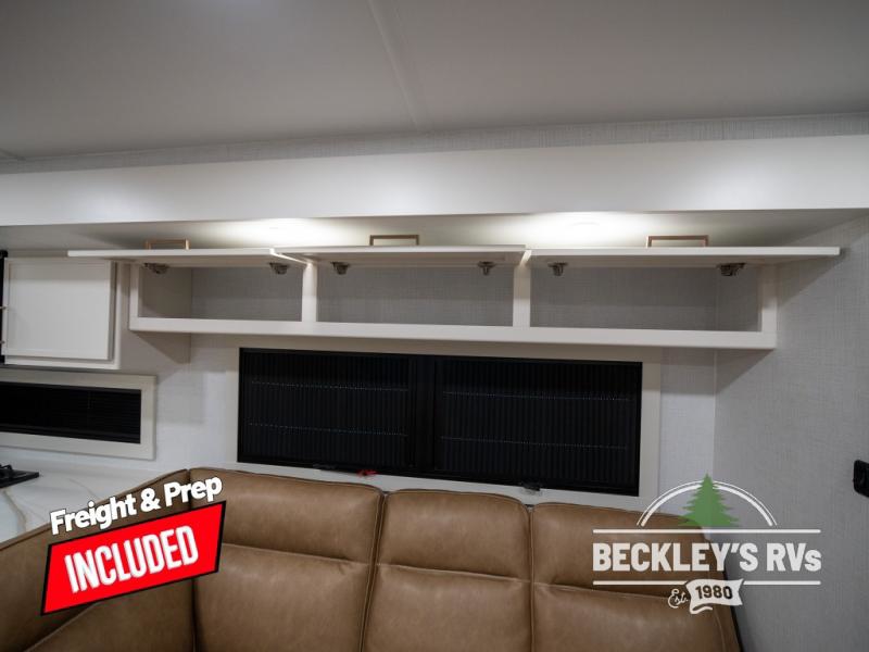 Savor the joy of cooking and sharing meals with loved ones in this beautifully appointed kitchen! This rear kitchen features a spacious pantry with drawers and outlets, a 30" convection microwave, a flip-up counter, and a 12V refrigerator. The convertible dining table and L-desk create a refined space for meals, work, and relaxation. The adjacent L-sofa forms a cozy sanctuary for reading, socializing, or enjoying the entertainment center and fireplace. There is a full bathroom with everything you need to keep your personal hygiene on the road. Plus, the front bedroom’s peaceful haven features a plush king bed, nightstands with storage, and a MaxSpace split-level wardrobe. Additionally, the two exterior awnings create a spacious outdoor living area, ideal for relaxing, entertaining, or enjoying the great outdoors.