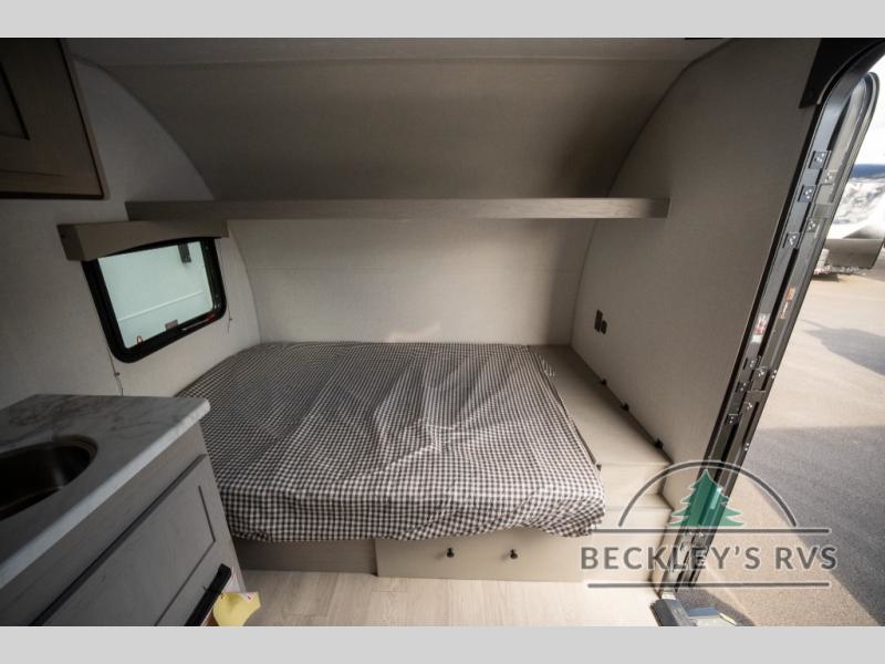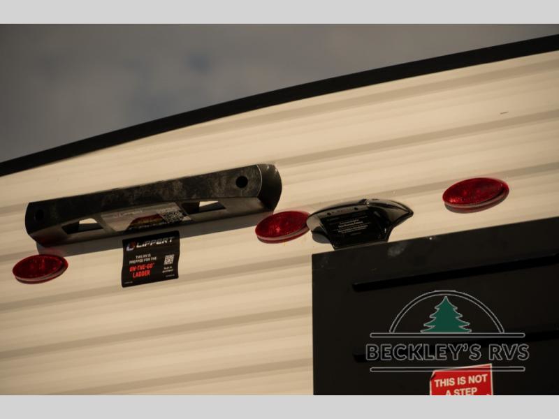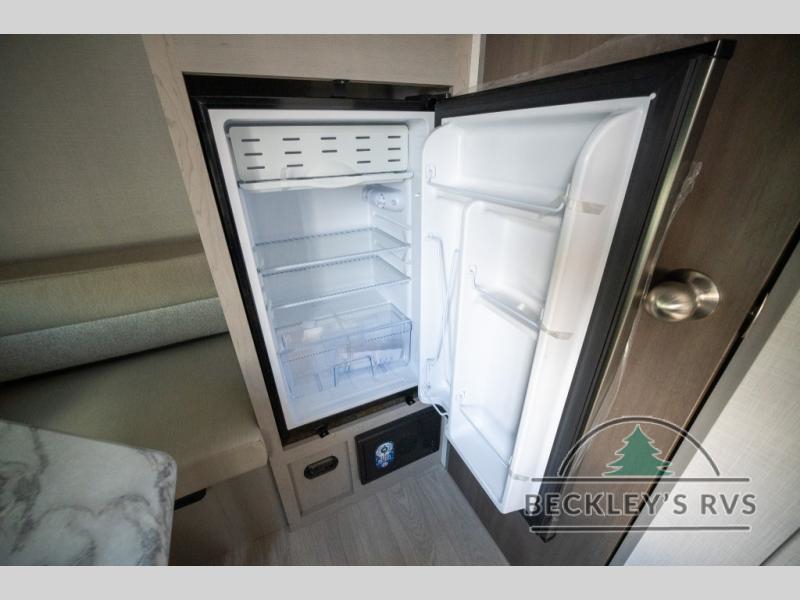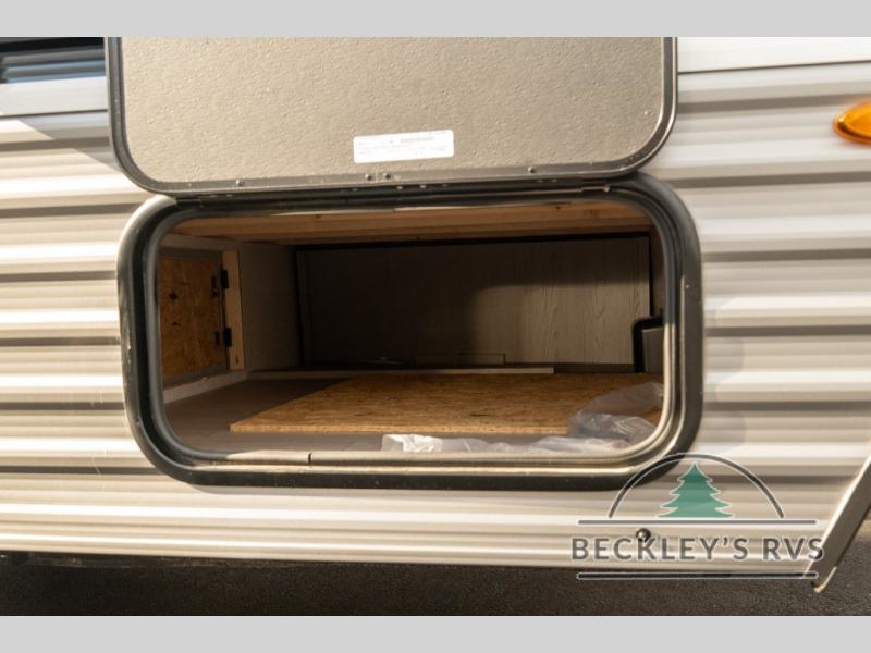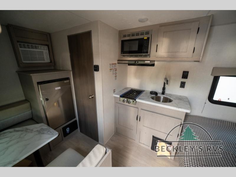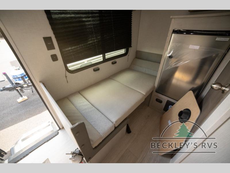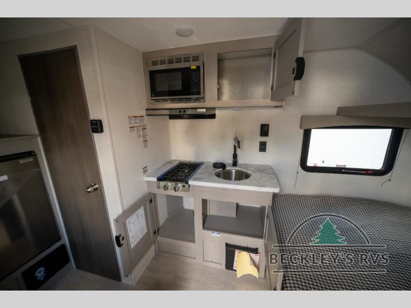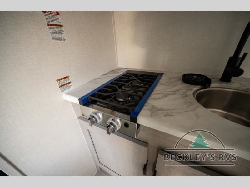 Lightweight camping with at-home comforts is possible with this travel trailer in tow! Once you arrive at the campground, you can unload the exterior storage, put out the awning, then head inside to make lunch on the two-burner cooktop. There is a refrigerator to keep your items fresh, plus a sink with a cup rinse for added convenience. The booth dinette provides a place to dine together, play a board game in the evenings, and let a guest or two little ones sleep on. You'll have the front 54" x 74" RV queen bed to yourselves, along with an overhead shelf and bedroom storage for your things. And don't overlook the private bath with a toilet and 24" x 32" shower!