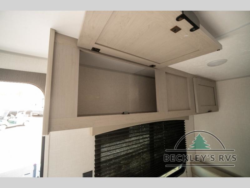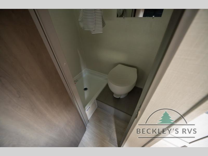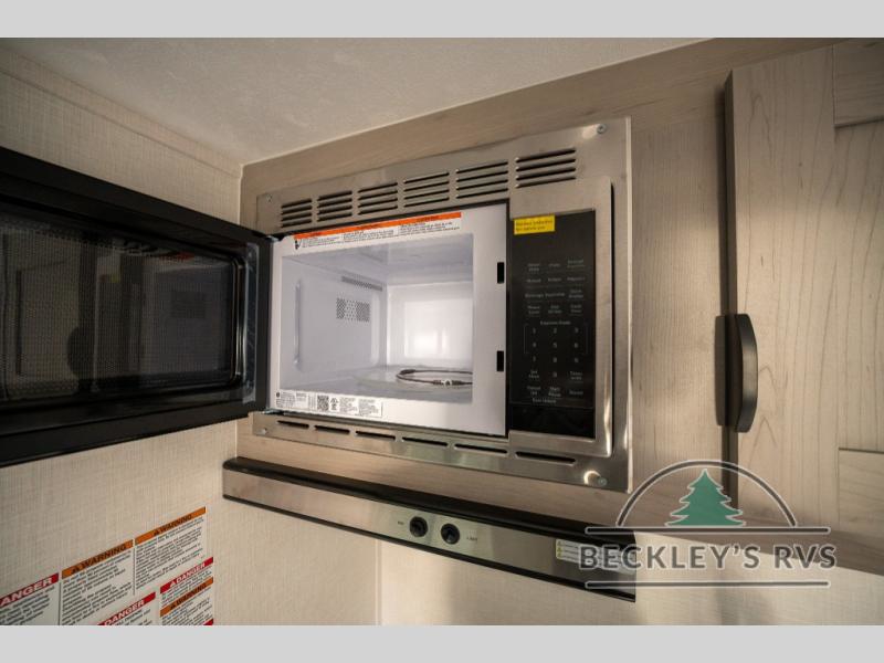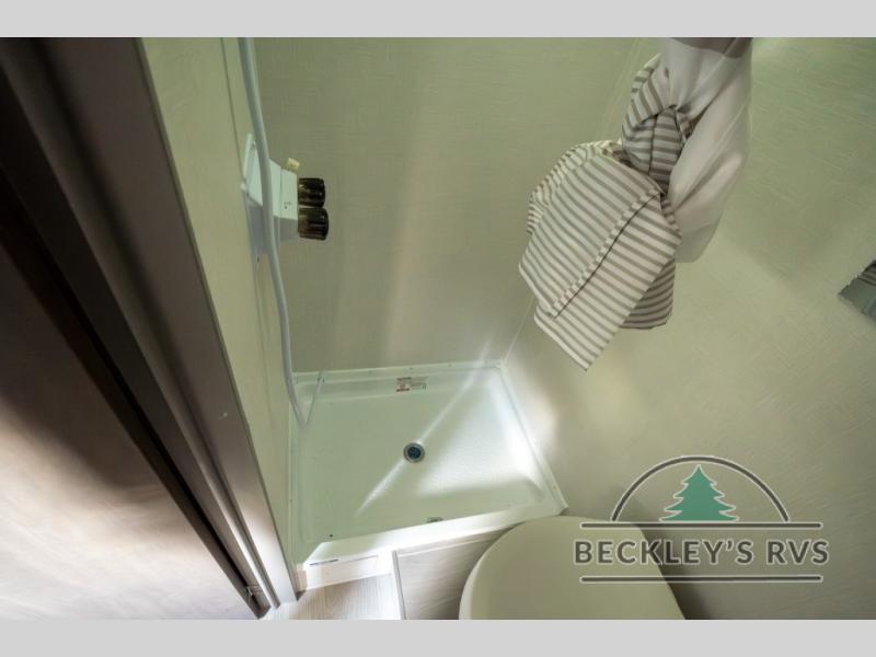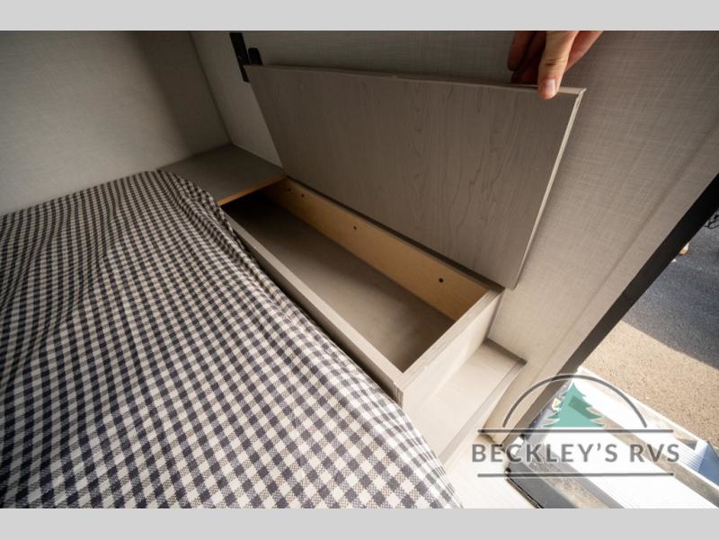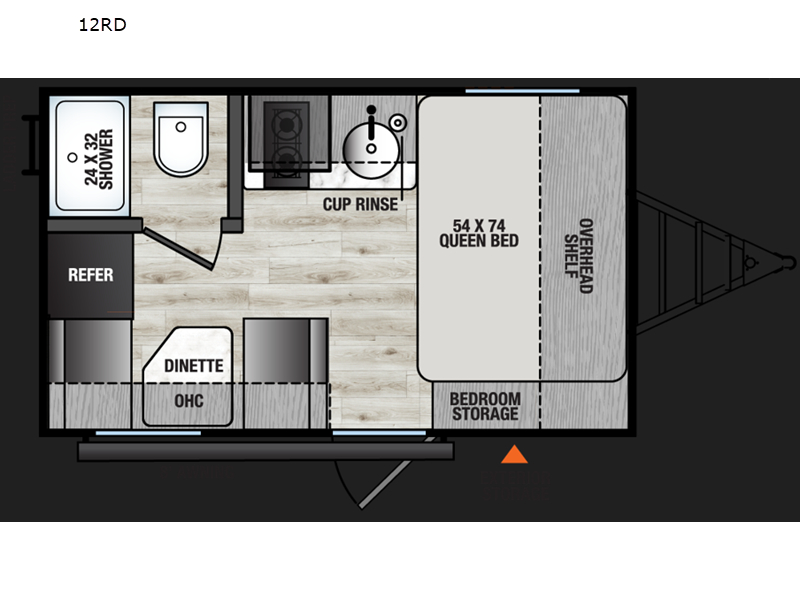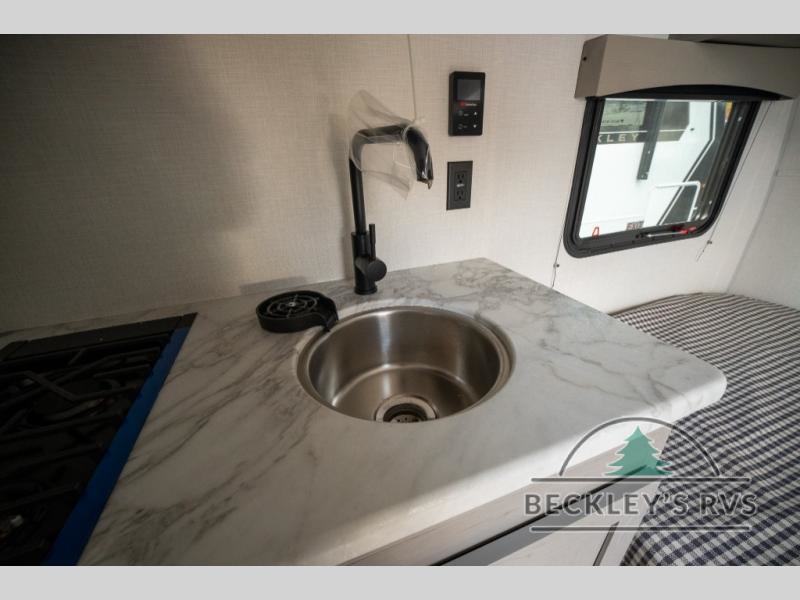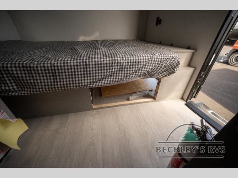 Lightweight camping with at-home comforts is possible with this travel trailer in tow! Once you arrive at the campground, you can unload the exterior storage, put out the awning, then head inside to make lunch on the two-burner cooktop. There is a refrigerator to keep your items fresh, plus a sink with a cup rinse for added convenience. The booth dinette provides a place to dine together, play a board game in the evenings, and let a guest or two little ones sleep on. You'll have the front 54" x 74" RV queen bed to yourselves, along with an overhead shelf and bedroom storage for your things. And don't overlook the private bath with a toilet and 24" x 32" shower!