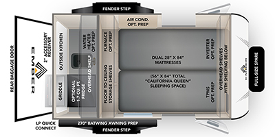 This compact travel trailer is easy to tow and easy to love! There are fender steps so that you can reach the top of your unit, which will especially be helpful if you choose to add the optional Thule roof rack system. The rear kitchen includes a griddle which attaches to the LP Quick Connect, a sink, plus an overhead shelf for food storage. An optional 1.7 cu. ft. refrigerator can be added for even more convenience. Inside, you'll enjoy the dual 28" x 84" mattresses with a converted 56" x 84" "California Queen" sleeping space for a great night's rest. There are also front overhead shelves with shelving below plus floor to ceiling shelves in the back, so nothing gets left behind.