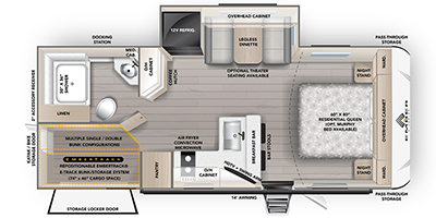 You'll love every minute spent in this spacious travel trailer that can sleep up to six. The repositionable EmberTrack E-Track bunk/storage system includes 74" x 46" cargo space, and there are multiple single/double bunk configurations to fit your needs. The front walk-around residential queen bed includes dual nightstands and dual wardrobes, plus a privacy curtain if you have guests staying over, and an optional Murphy bed is available if you choose that bed configuration. This E-Series kitchen includes an air fryer convection microwave, a two-burner cooktop, plus a breakfast bar with bar stools so you can visit with the chef as they cook meals. A legless dinette or optional theater seating will provide a place to dine, or you can take your plate outdoors to sit under the 14' power awning with a dimmable LED light. You'll also find a pass-through storage outside, along with a docking station and a kayak/bike storage door!