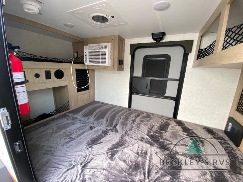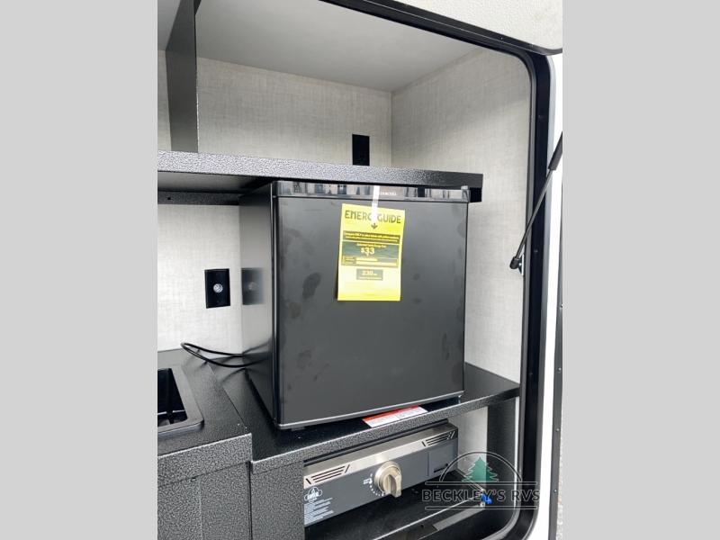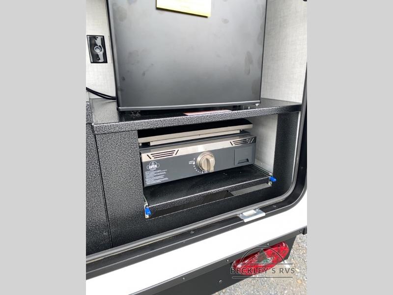 This compact travel trailer is easy to tow and easy to love! There are fender steps so that you can reach the top of your unit, which will especially be helpful if you choose to add the optional Thule roof rack system. You will also find a 6.5" manual awning outside or you can choose the optional batwing awning. The rear kitchen includes a griddle which attaches to the LP Quick Connect, a sink, plus an overhead shelf for food storage. An optional 1.7 cu. ft. refrigerator can be added for even more convenience. Inside, you'll enjoy the dual 28" x 84" mattresses with a converted 56" x 84" "California Queen" sleeping space for a great night's rest. There are also front overhead shelves with shelving below plus floor to ceiling shelves in the back so nothing gets left behind.