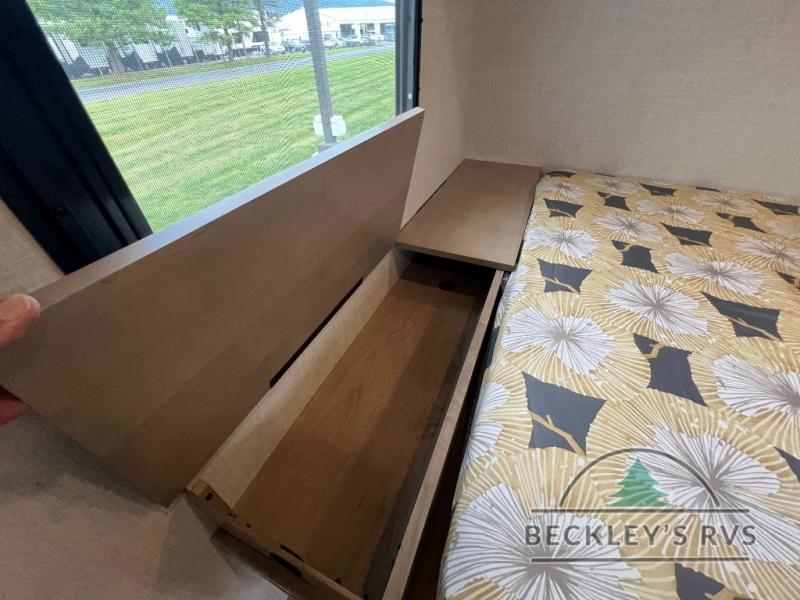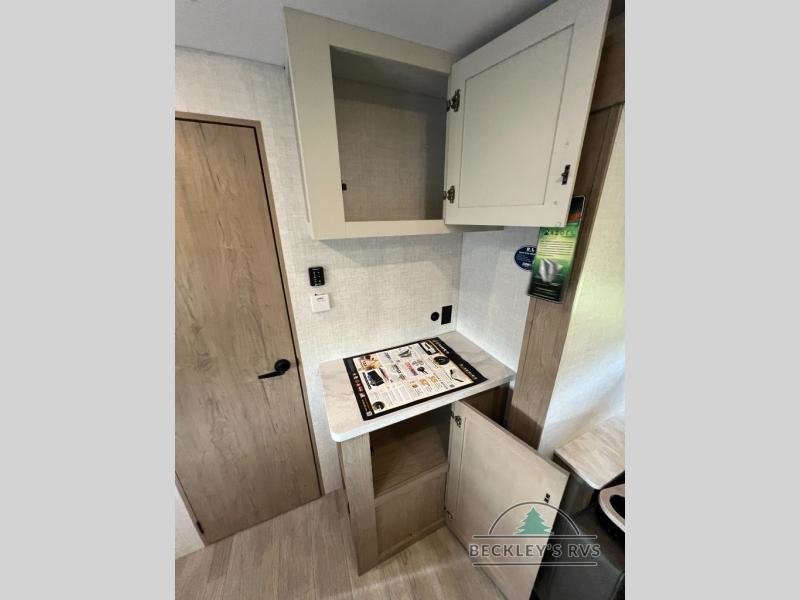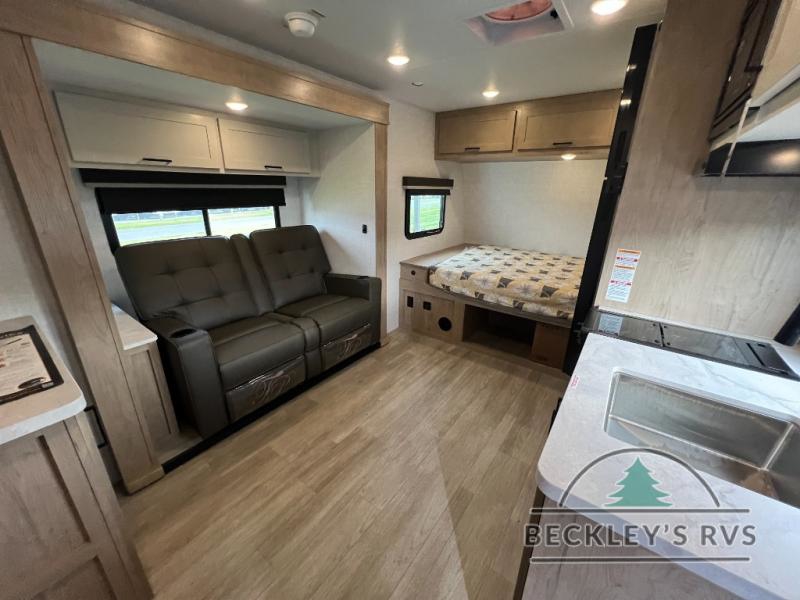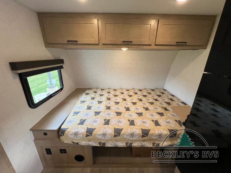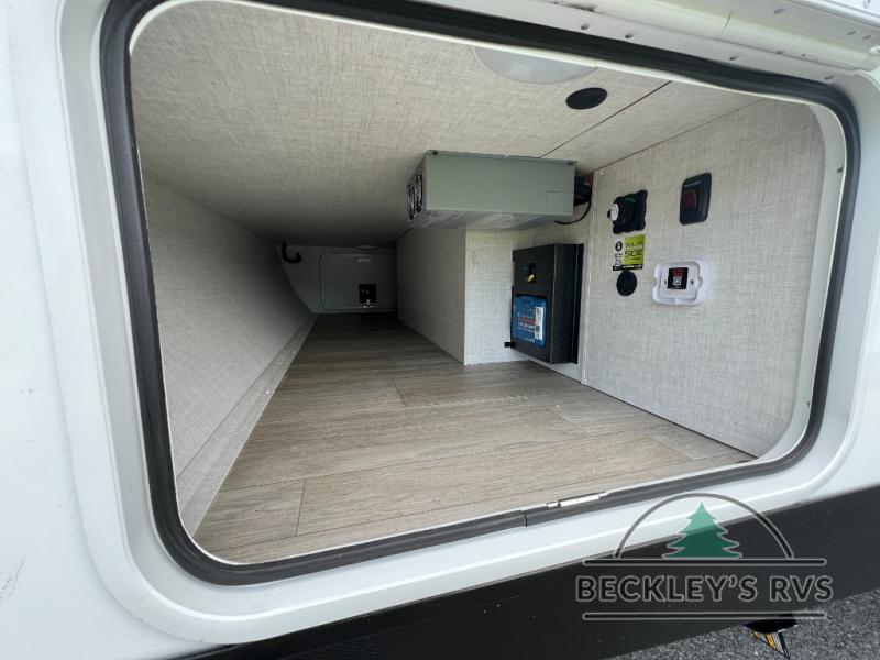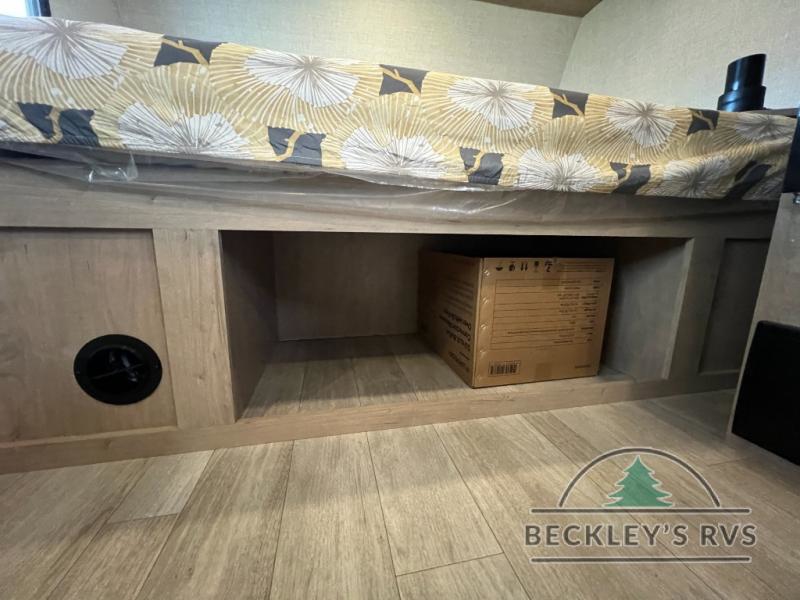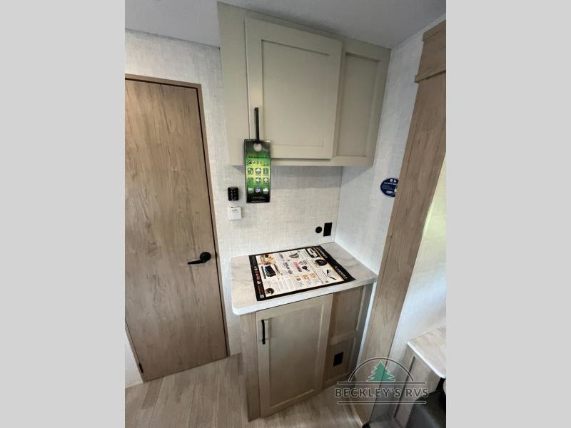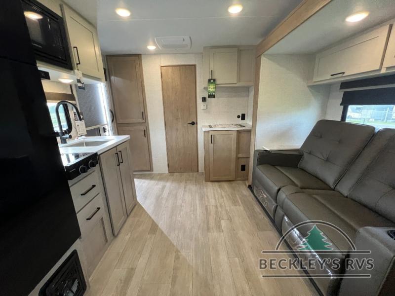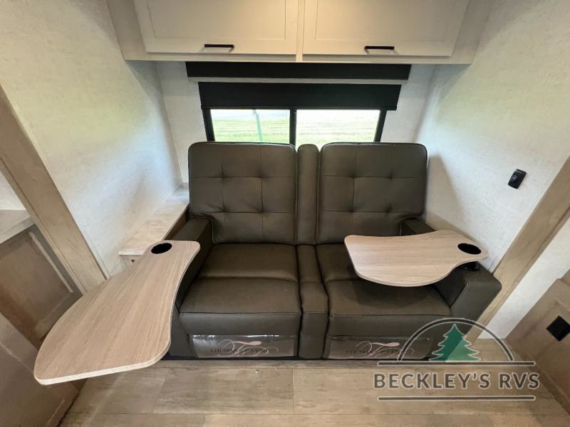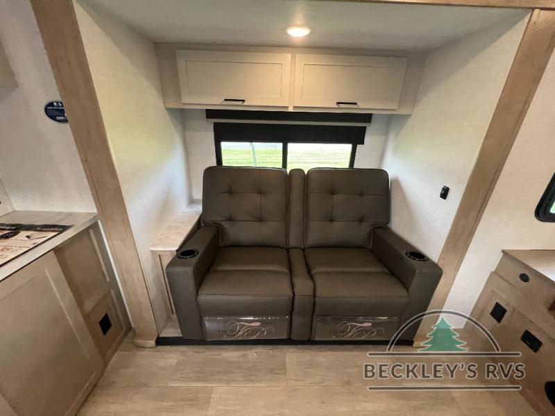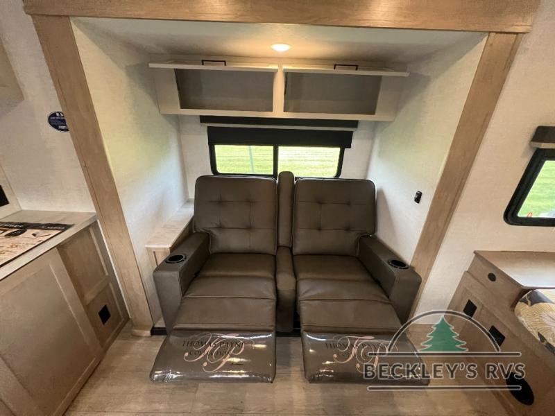 Time at the campground in this travel trailer will be time well spent. Once you arrive at your destination, you can put out the 14' electric awning, unpack the pass-through storage, then head inside for lunch. There is an air fryer convection microwave plus a dual burner cooktop to make meals each day, and the 10 cu. ft. 12V refrigerator will keep your food fresh. A legless dinette slide provides a place to dine together and even let a guest sleep over. If you're not needing the extra sleeping space, just choose the optional theater seating! You'll find the front queen bed will give you a great night's rest, and there is a full rear bath on board that will allow you to freshen up each morning.