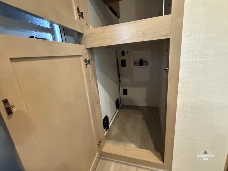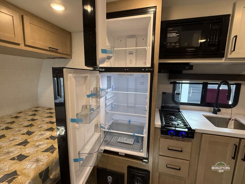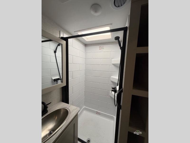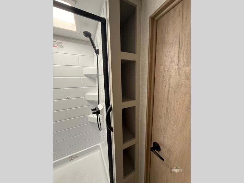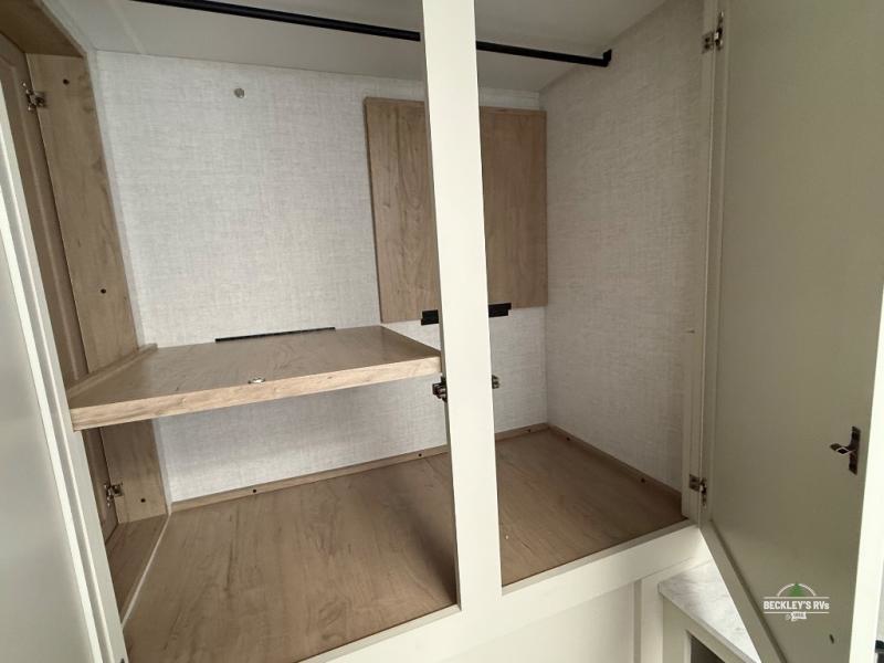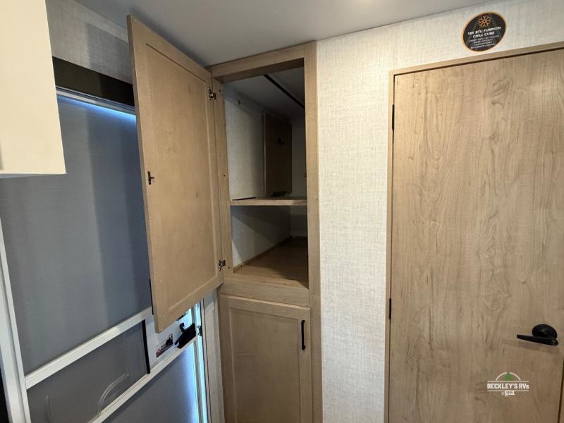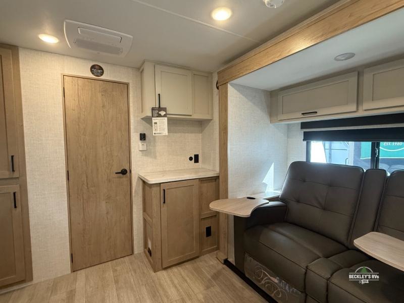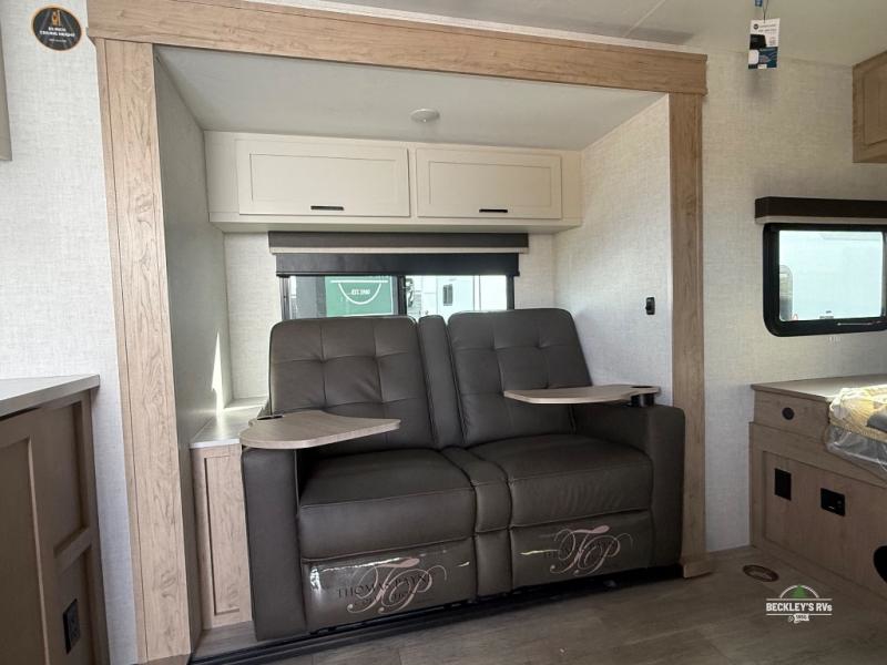 Time at the campground in this travel trailer will be time well spent. Once you arrive at your destination, you can put out the 14' electric awning, unpack the pass-through storage, then head inside for lunch. There is an air fryer convection microwave plus a dual burner cooktop to make meals each day, and the 10 cu. ft. 12V refrigerator will keep your food fresh. A legless dinette slide provides a place to dine together and even let a guest sleep over. If you're not needing the extra sleeping space, just choose the optional theater seating! You'll find the front queen bed will give you a great night's rest, and there is a full rear bath on board that will allow you to freshen up each morning.