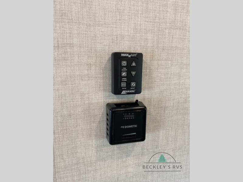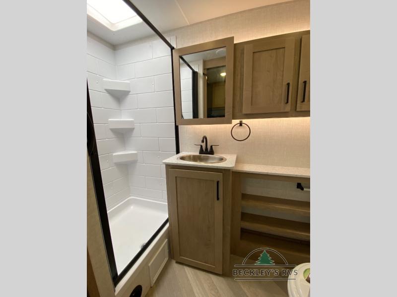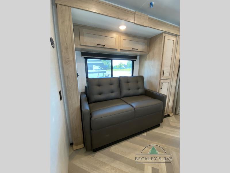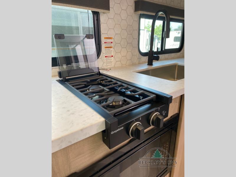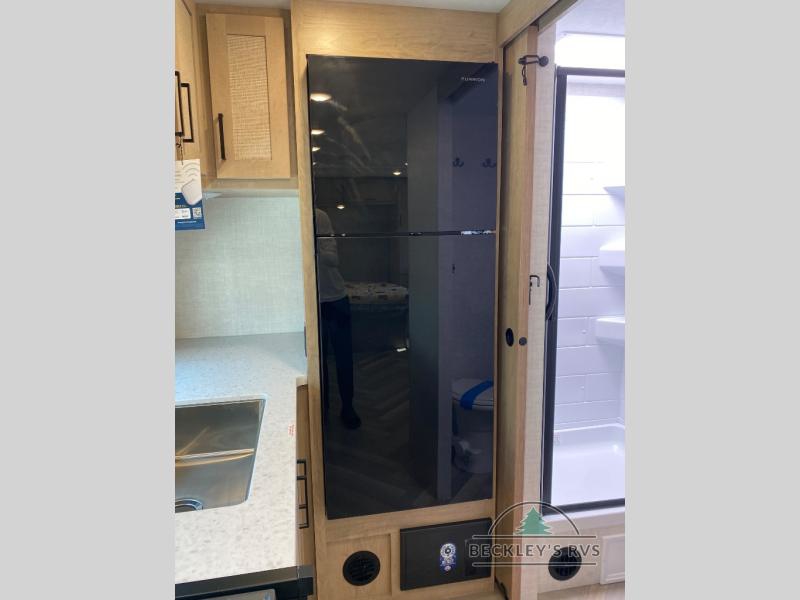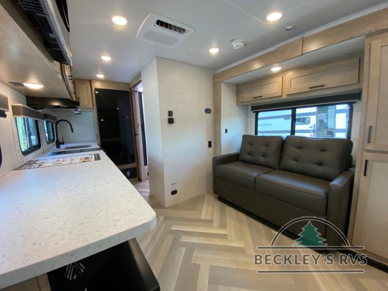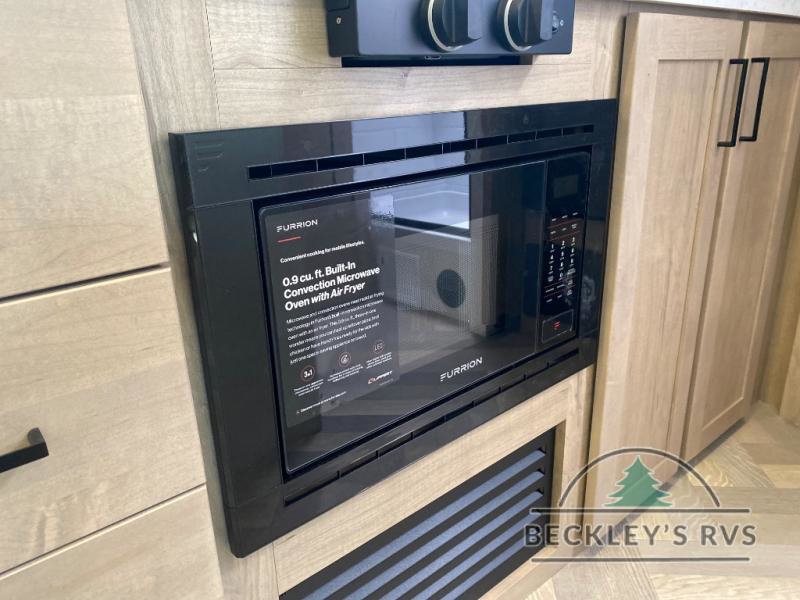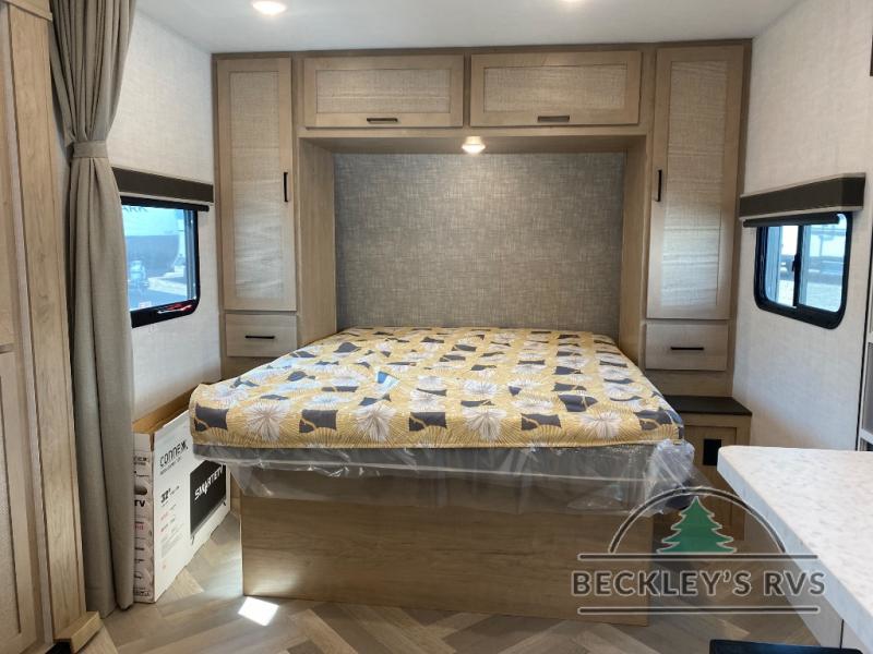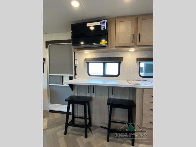 Camping trips just got sweeter in this single slide out travel trailer that will sleep two each night! There is a front queen bed with dual wardrobes and nightstands to keep your things tidy, plus a privacy curtain at the foot of the bed if you have someone staying over on an air mattress. You can relax on the theater seating slide out that also includes a wardrobe/pantry here for snacks or paper products. The kitchen with a dual burner cooktop and air fryer convection microwave will let you make meals each day, and the 10 cu. ft. 12V refrigerator will be perfect for your perishables. This unit also includes a breakfast bar/desktop area with two bar stools where you can dine or work from home. And of course there is a full bath on board so you can clean up after a day outdoors!