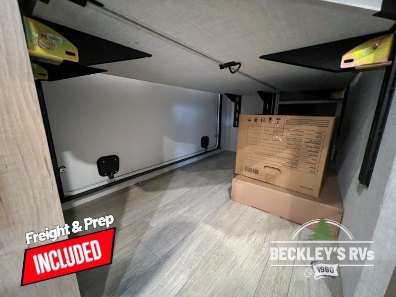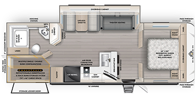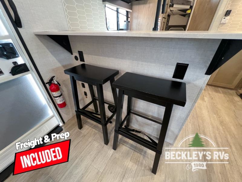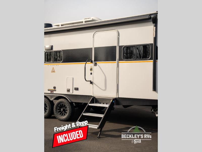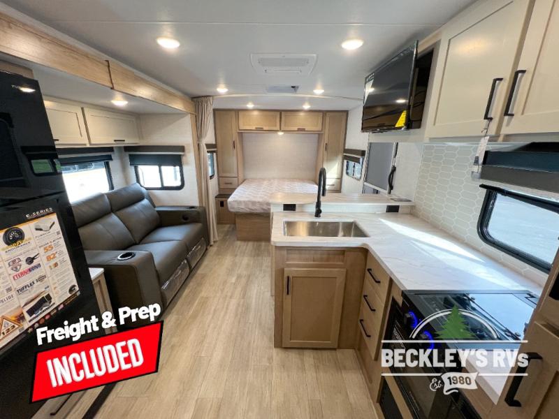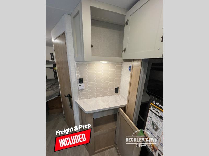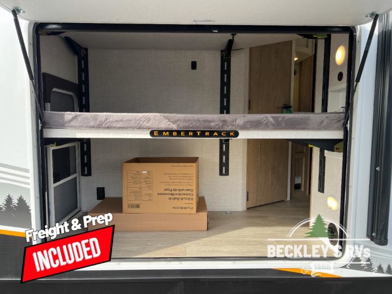 You'll love every minute spent in this spacious travel trailer that can sleep up to six. The repositionable EmberTrack E-Track bunk/storage system includes 74" x 46" cargo space, and there are multiple single/double bunk configurations to fit your needs. The front walk-around residential queen bed includes dual nightstands and dual wardrobes, plus a privacy curtain if you have guests staying over, and an optional Murphy bed is available if you choose that bed configuration. This E-Series kitchen includes an air fryer convection microwave, a two-burner cooktop, plus a breakfast bar with bar stools so you can visit with the chef as they cook meals. A legless dinette or optional theater seating will provide a place to dine, or you can take your plate outdoors to sit under the 14' power awning with a dimmable LED light. You'll also find a pass-through storage outside, along with a docking station and a kayak/bike storage door!