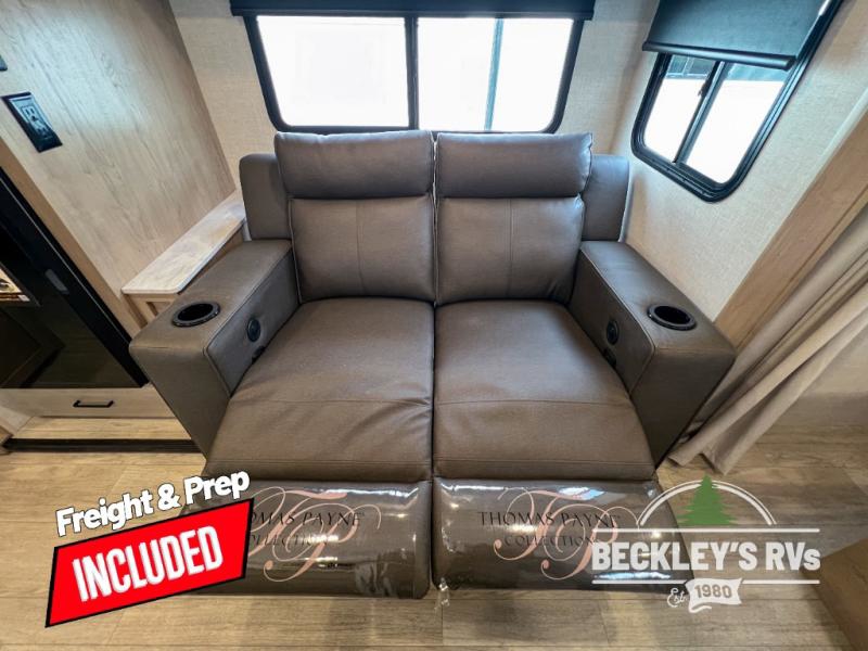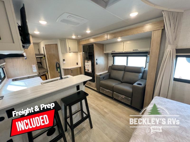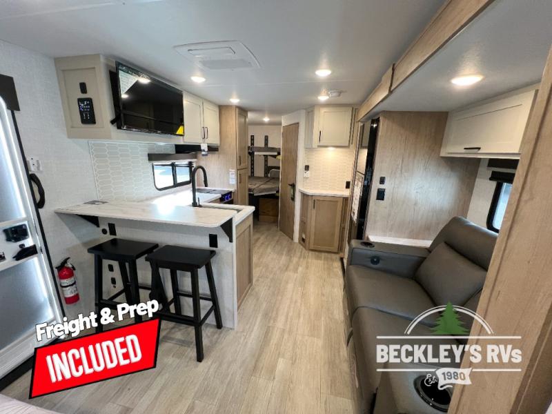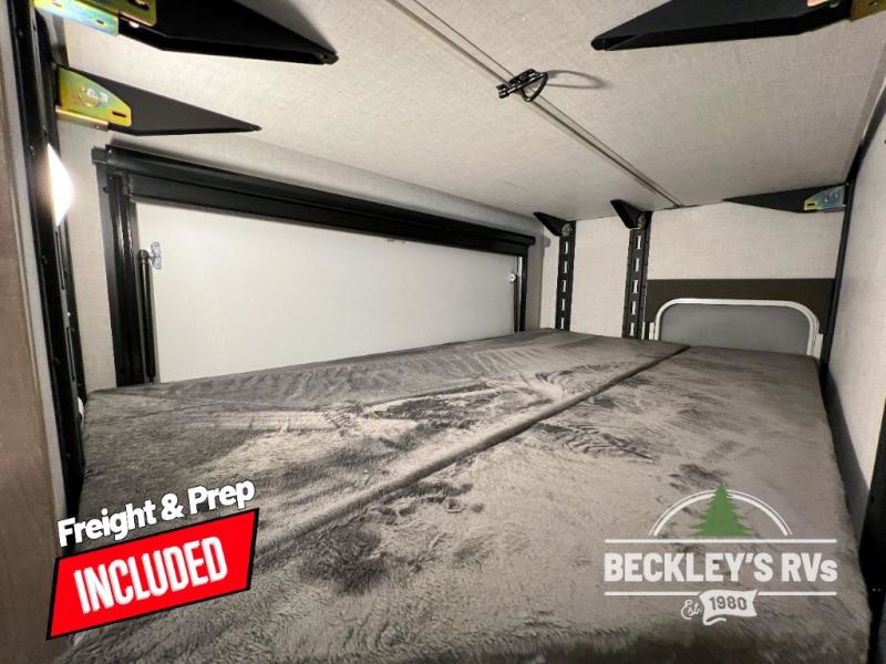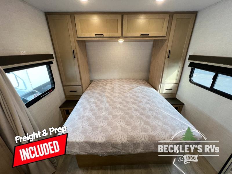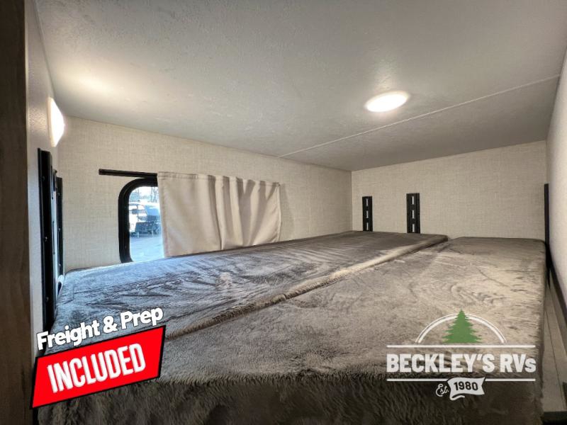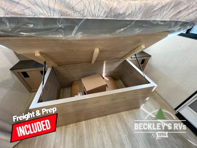 You'll love every minute spent in this spacious travel trailer that can sleep up to six. The repositionable EmberTrack E-Track bunk/storage system includes 74" x 46" cargo space, and there are multiple single/double bunk configurations to fit your needs. The front walk-around residential queen bed includes dual nightstands and dual wardrobes, plus a privacy curtain if you have guests staying over, and an optional Murphy bed is available if you choose that bed configuration. This E-Series kitchen includes an air fryer convection microwave, a two-burner cooktop, plus a breakfast bar with bar stools so you can visit with the chef as they cook meals. A legless dinette or optional theater seating will provide a place to dine, or you can take your plate outdoors to sit under the 14' power awning with a dimmable LED light. You'll also find a pass-through storage outside, along with a docking station and a kayak/bike storage door!