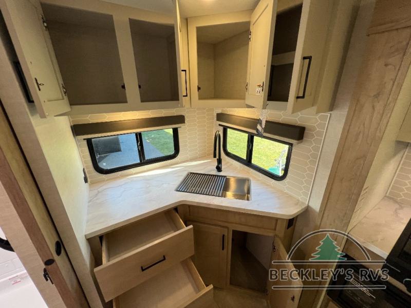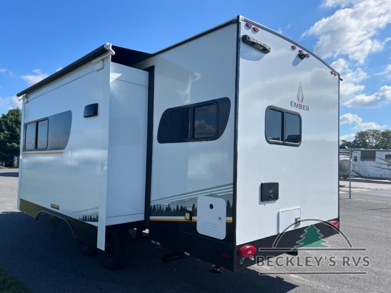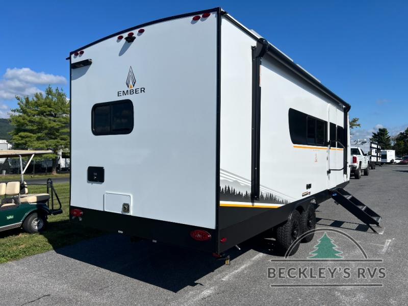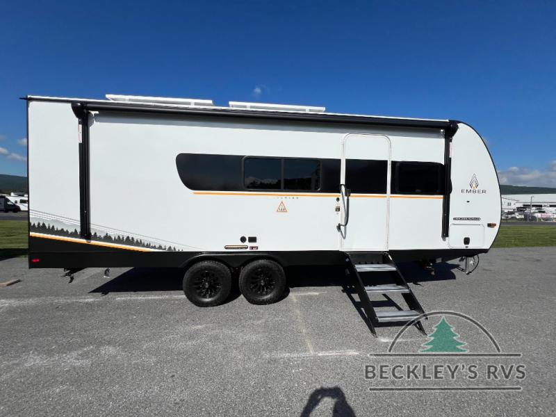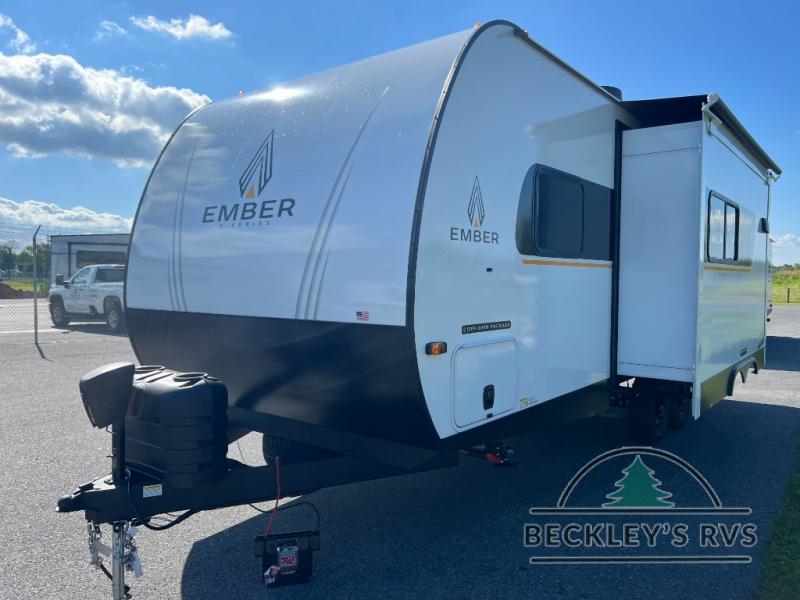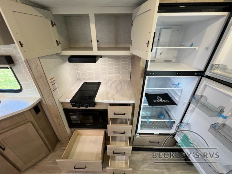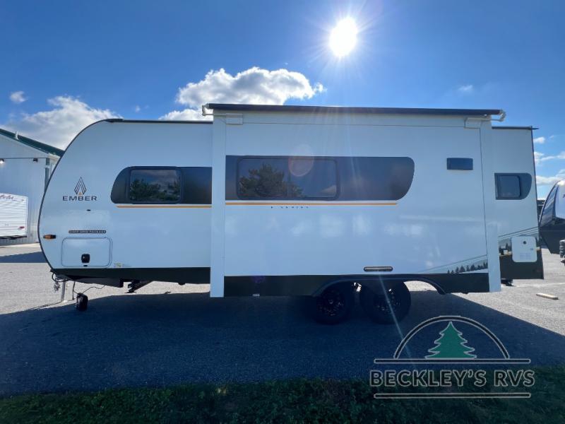 With any E-Series travel trailer by Ember RV you will enjoy a lightweight RV with all the "Essentials" needed for memorable trips in the great outdoors! Each model is constructed with durable laminated Azdel Onboard composite walls, a full walkable roof with a one-piece Tufflex PVC roofing material, and a gel-coated fiberglass exterior. The Dexter axles with E-Z lube hubs and forward self-adjusting electric brakes plus Goodyear Endurance tires will provide a smooth tow from home to campground. You will appreciate the Congoleum DiamondFlor "carpetless" interior that is easy to clean, and the hardwood framed cabinet doors will create a more residential feel. Each model includes a tankless on-demand water heater for endless hot showers and an 18,000 BTU Max Cool "Whisper Quiet" A/C, which is the largest single A/C in its class! An EmberLink Smart RV system will let you easily control features such as lights and slides and you can wash away those rainy day blues by watching the HDTV with a built-in Bluetooth AV system. If you're looking for off-grid capabilities, you might want to choose the optional Off-Grid Solar Package with 400 total watts of solar panels, a 2,000W Pure Sine wave inverter, and a Victron MPPT solar controller!