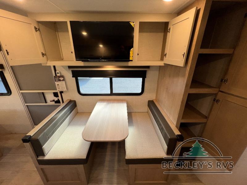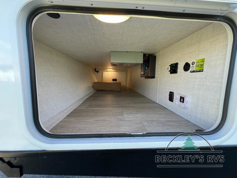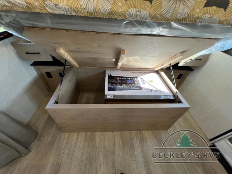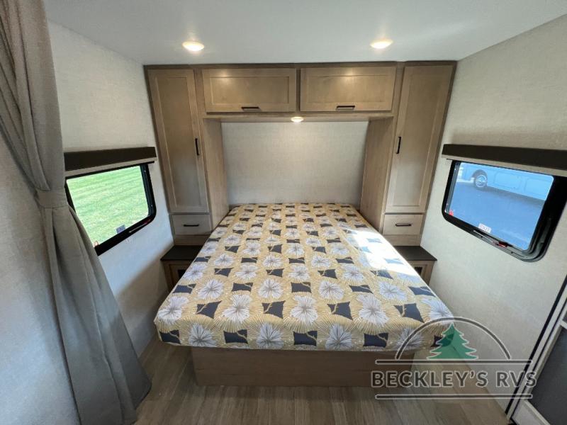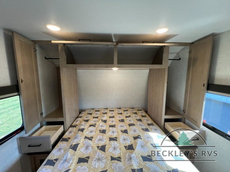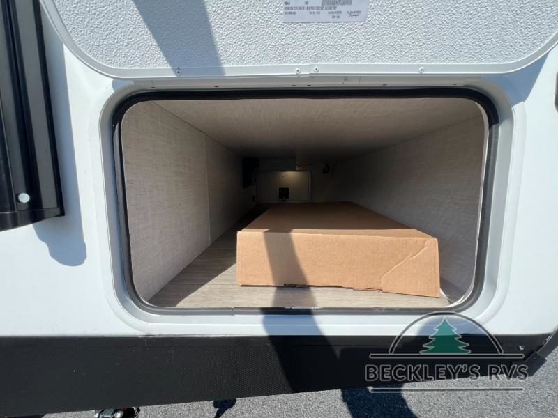 Camping trips just got a whole lot better in this tandem axle, single slide travel trailer! Once you arrive at the campground, you can put out the 18' power awning, grab your camp chairs from the pass-through storage, and relax! When you're getting hungry, head to the rear corner kitchen that includes ample counter space, a two burner cooktop, plus a 10 cu. ft. 12V refrigerator. There is also a pantry to store snacks and paper goods! You can get cozy after dinner on the theater seating that sits directly across from the HDTV for easy viewing, and there is a legless dinette if game night is in order. When you're ready for bed, the queen bed up front will provide a great night's rest, and there is a privacy curtain if you have a guest staying over on the dinette. And don't worry about storage space; this model has you covered with dual bedroom wardrobes, overhead cabinets, and convenient shoe storage!