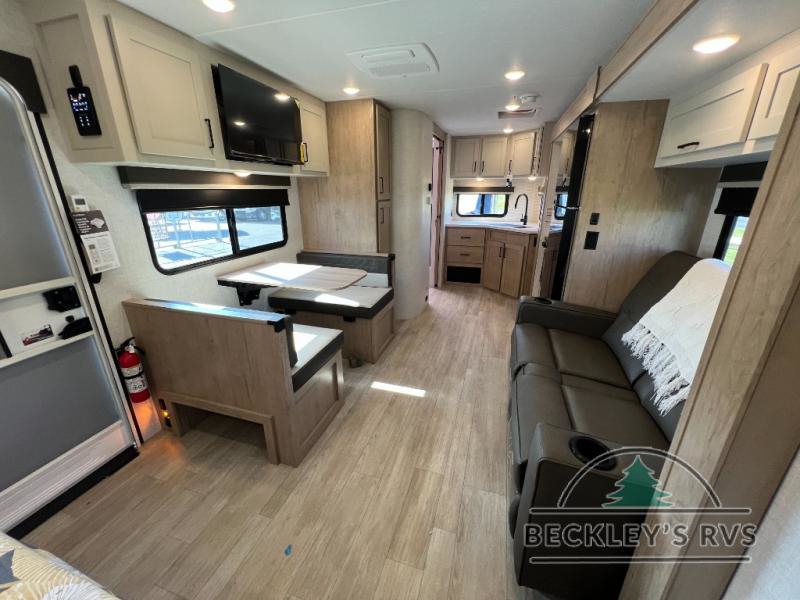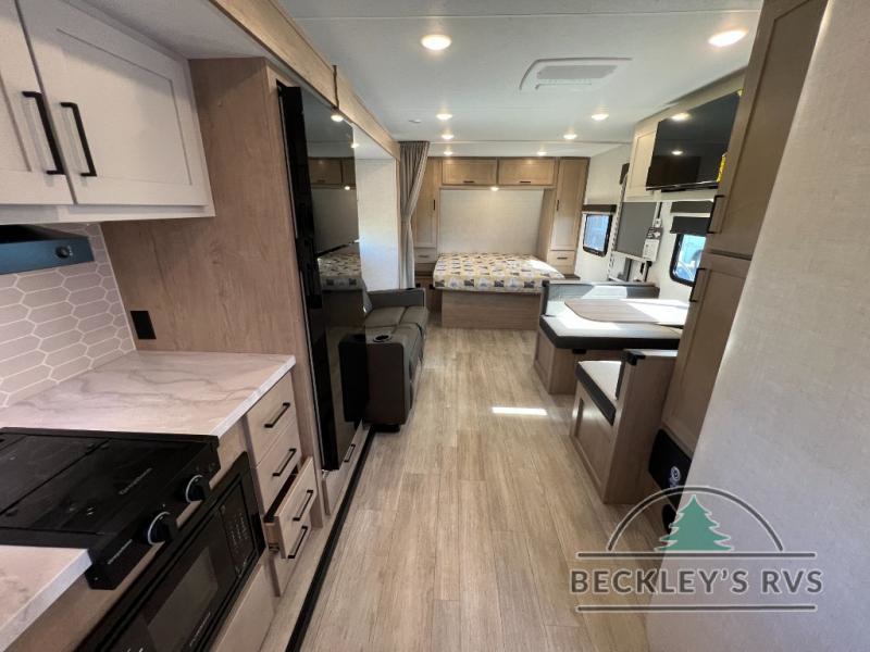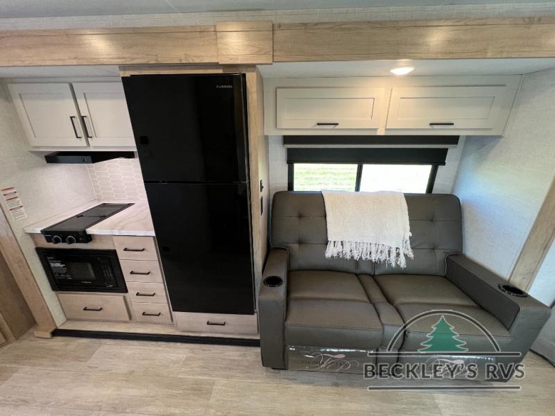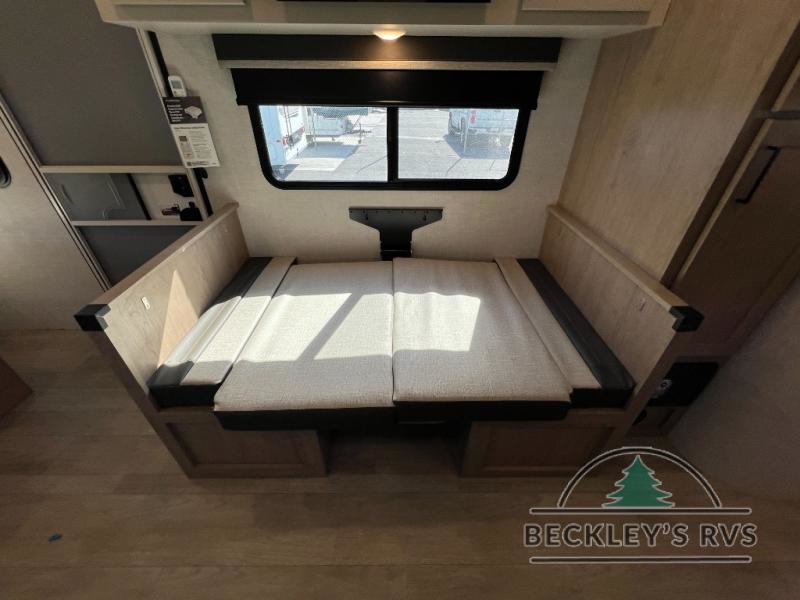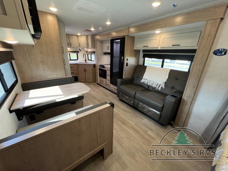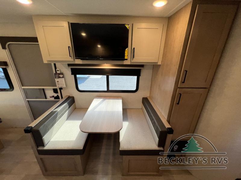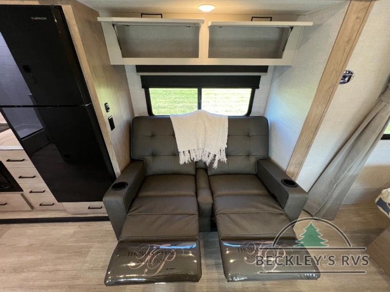 Camping trips just got a whole lot better in this tandem axle, single slide travel trailer! Once you arrive at the campground, you can put out the 18' power awning, grab your camp chairs from the pass-through storage, and relax! When you're getting hungry, head to the rear corner kitchen that includes ample counter space, a two burner cooktop, plus a 10 cu. ft. 12V refrigerator. There is also a pantry to store snacks and paper goods! You can get cozy after dinner on the theater seating that sits directly across from the HDTV for easy viewing, and there is a legless dinette if game night is in order. When you're ready for bed, the queen bed up front will provide a great night's rest, and there is a privacy curtain if you have a guest staying over on the dinette. And don't worry about storage space; this model has you covered with dual bedroom wardrobes, overhead cabinets, and convenient shoe storage!