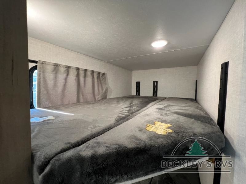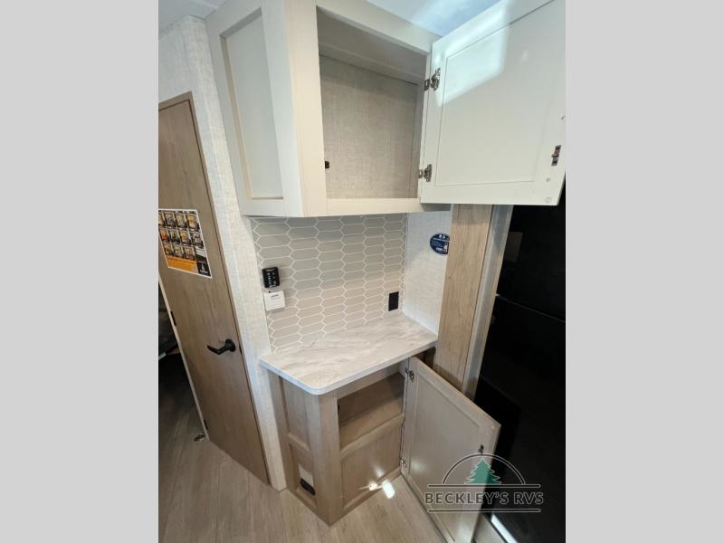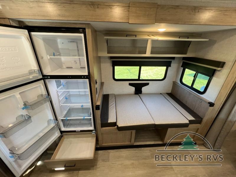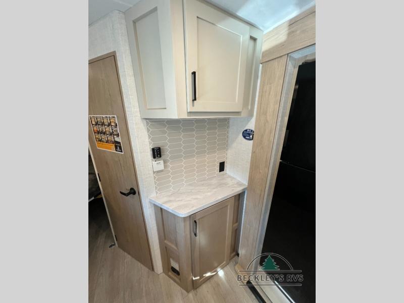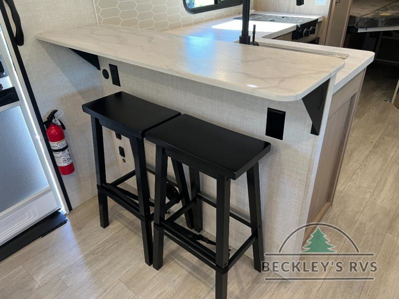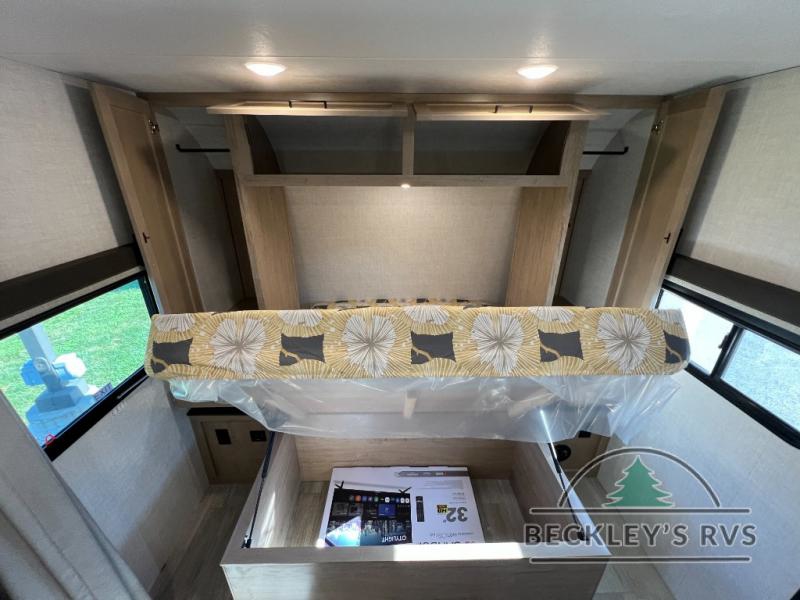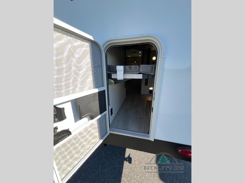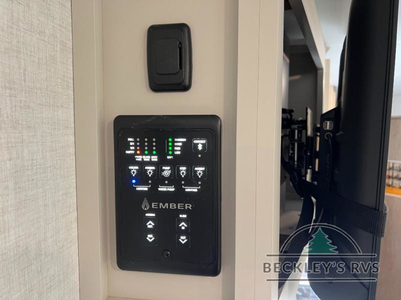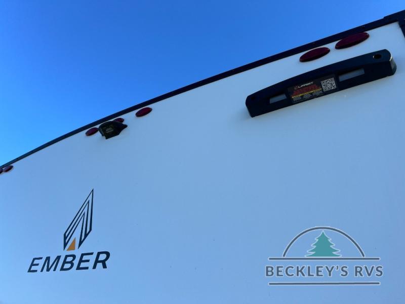 You'll love every minute spent in this spacious travel trailer that can sleep up to six. The patent-pending repositionable EmberTrack E-Track bunk/storage system includes 74" x 45" cargo space, and there are multiple single/double bunk configurations to fit your needs. The front walk-around true residential queen bed includes dual nightstands and dual wardrobes, plus a privacy curtain if you have guests staying over. This E-Series kitchen includes an air fryer convection microwave, a two burner cooktop, plus a breakfast bar with bar stools so you can visit with the chef as they cook meals. A legless dinette or optional theater seating will provide a place to dine, or you can take your plate outdoors to sit under the 14' power awning with a dimmable LED light. You'll also find a pass-through storage outside, along with a docking station and a kayak/bike storage door!