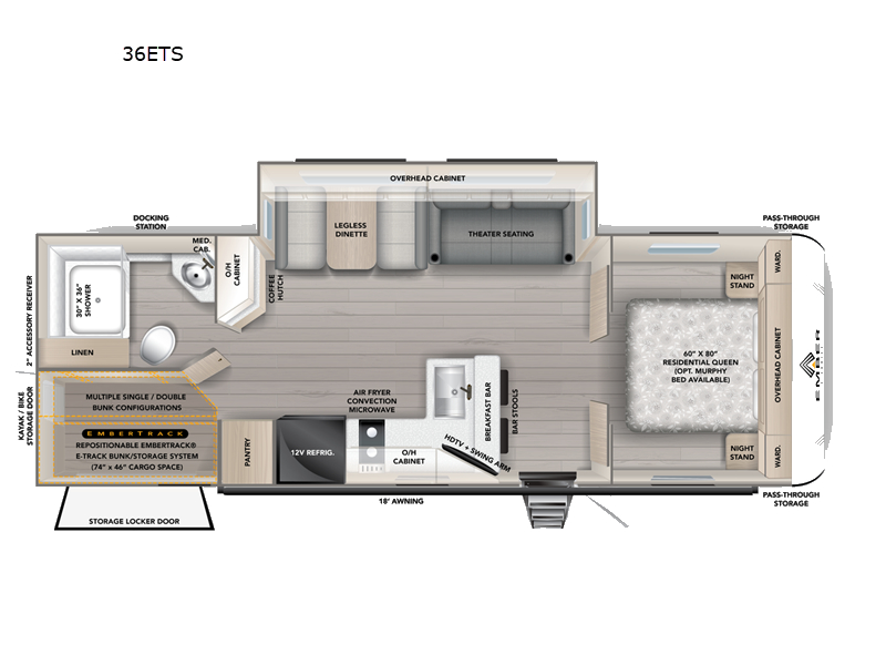 This model resembles 22ETS, but you'll enjoy added theater seating and a larger exterior length for more interior space! The repositionable EmberTrack E-Track bunk/storage system includes 74" x 46" cargo space, and there are multiple single/double bunk configurations to fit your needs. The front walk-around residential queen bed or optional Murphy bed includes dual nightstands and dual wardrobes, and you'll appreciate sliding doors that makes a private bedroom. This E-Series kitchen includes an air fryer convection microwave, a two-burner cooktop, plus a breakfast bar with bar stools so you can visit with the chef as they cook meals. A legless dinette will provide a place to dine, or you can take your plate outdoors to sit under the 18' power awning with a dimmable LED light. You'll also find a pass-through storage outside, along with a docking station and a kayak/bike storage door!