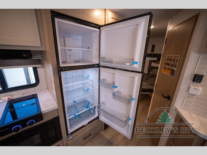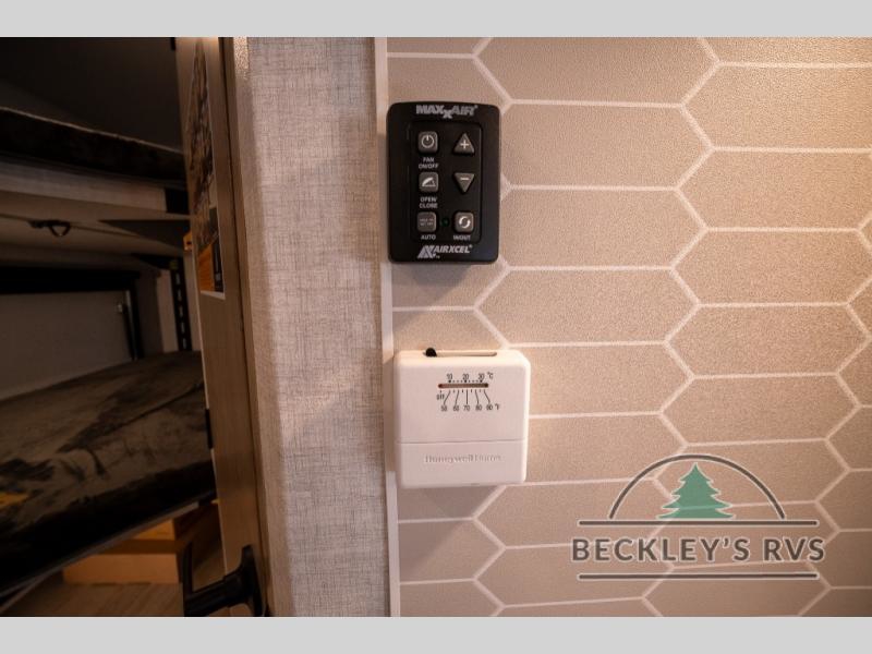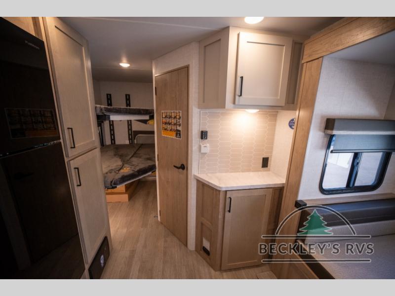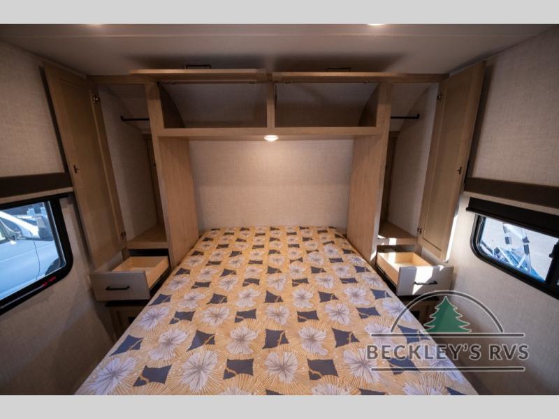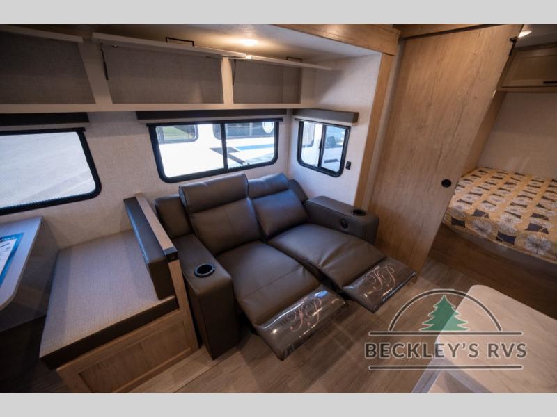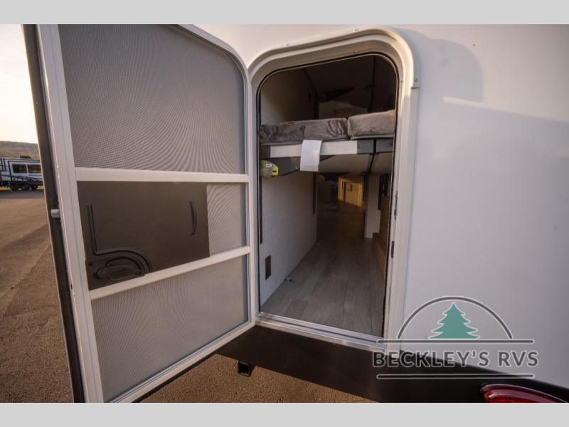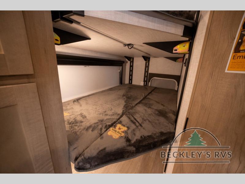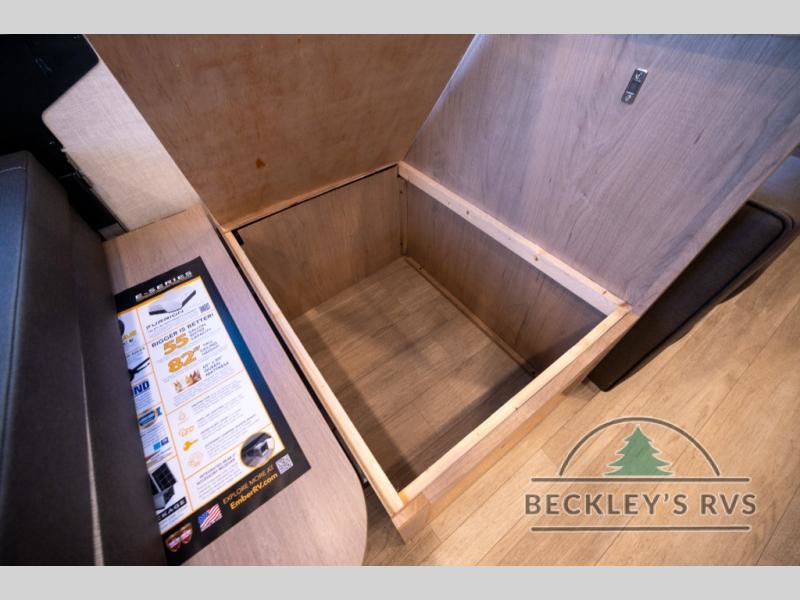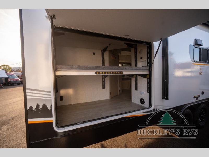 This model resembles 22ETS, but you'll enjoy added theater seating and a larger exterior length for more interior space! The patent-pending repositionable EmberTrack E-Track bunk/storage system includes 74" x 45" cargo space, and there are multiple single/double bunk configurations to fit your needs. The front walk-around true residential queen bed includes dual nightstands and dual wardrobes, and you'll appreciate sliding doors that makes a private bedroom. This E-Series kitchen includes an air fryer convection microwave, a two burner cooktop, plus a breakfast bar with bar stools so you can visit with the chef as they cook meals. A legless dinette will provide a place to dine, or you can take your plate outdoors to sit under the 18' power awning with a dimmable LED light. You'll also find a pass-through storage outside, along with a docking station and a kayak/bike storage door!