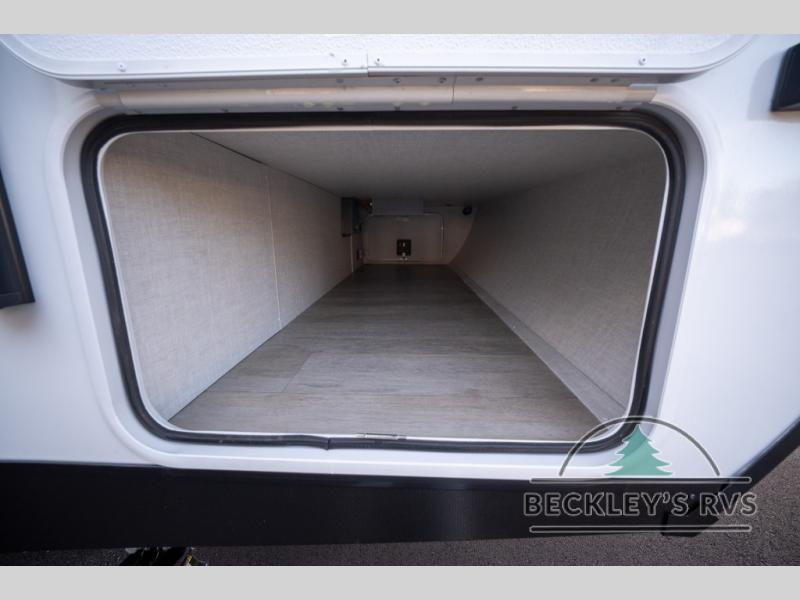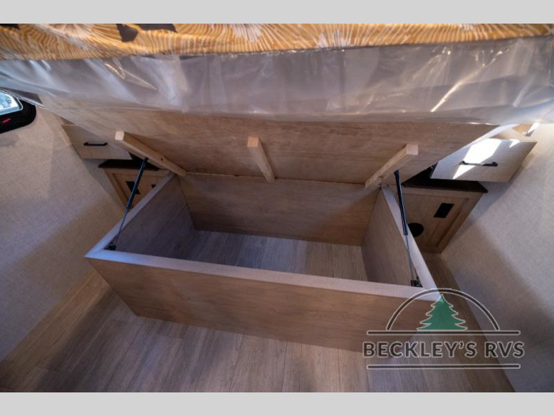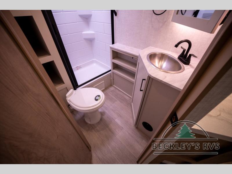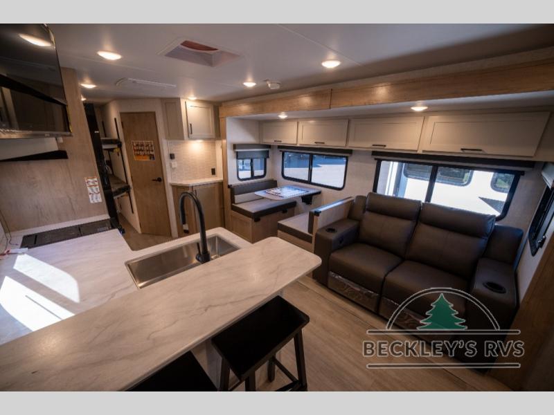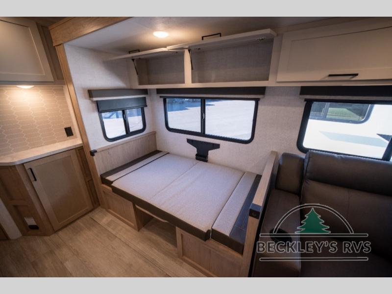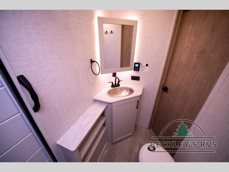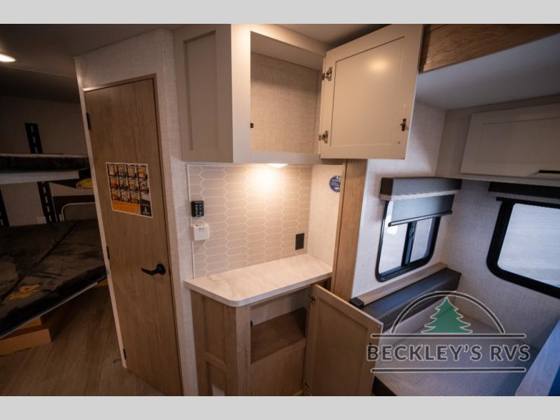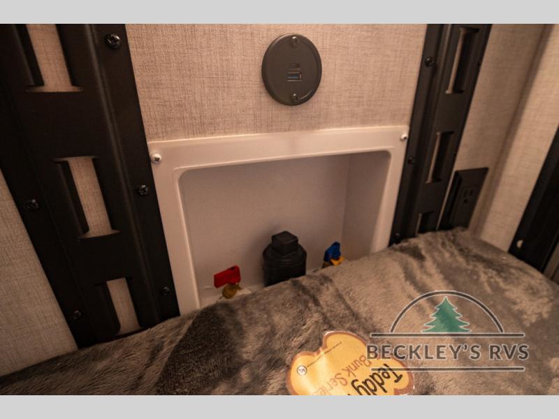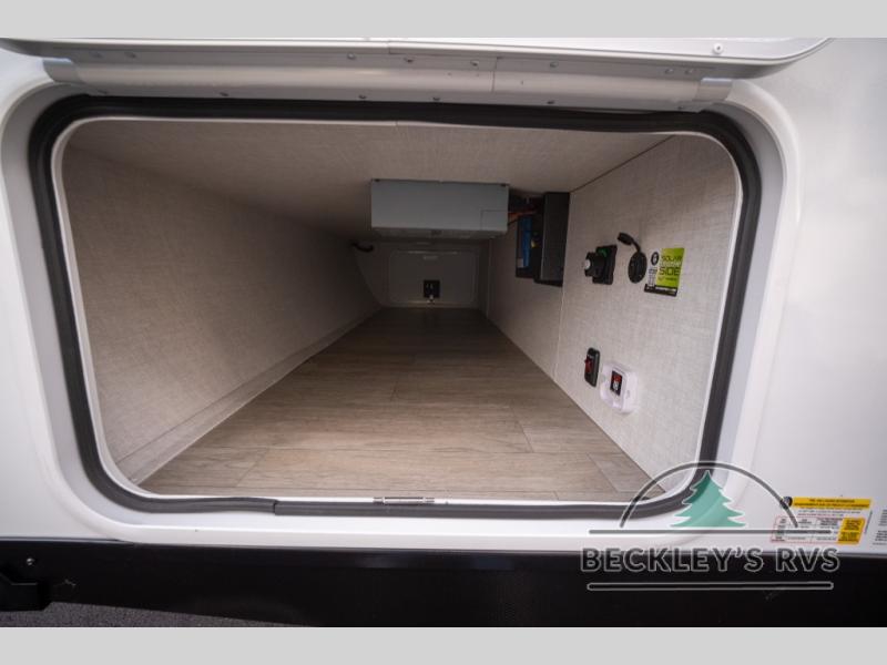 This model resembles 22ETS, but you'll enjoy added theater seating and a larger exterior length for more interior space! The patent-pending repositionable EmberTrack E-Track bunk/storage system includes 74" x 45" cargo space, and there are multiple single/double bunk configurations to fit your needs. The front walk-around true residential queen bed includes dual nightstands and dual wardrobes, and you'll appreciate sliding doors that makes a private bedroom. This E-Series kitchen includes an air fryer convection microwave, a two burner cooktop, plus a breakfast bar with bar stools so you can visit with the chef as they cook meals. A legless dinette will provide a place to dine, or you can take your plate outdoors to sit under the 18' power awning with a dimmable LED light. You'll also find a pass-through storage outside, along with a docking station and a kayak/bike storage door!