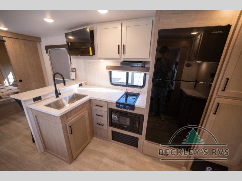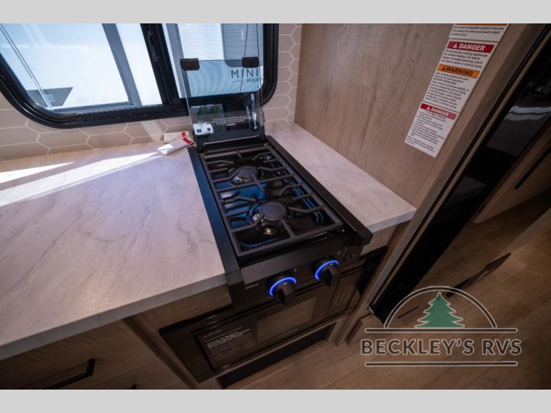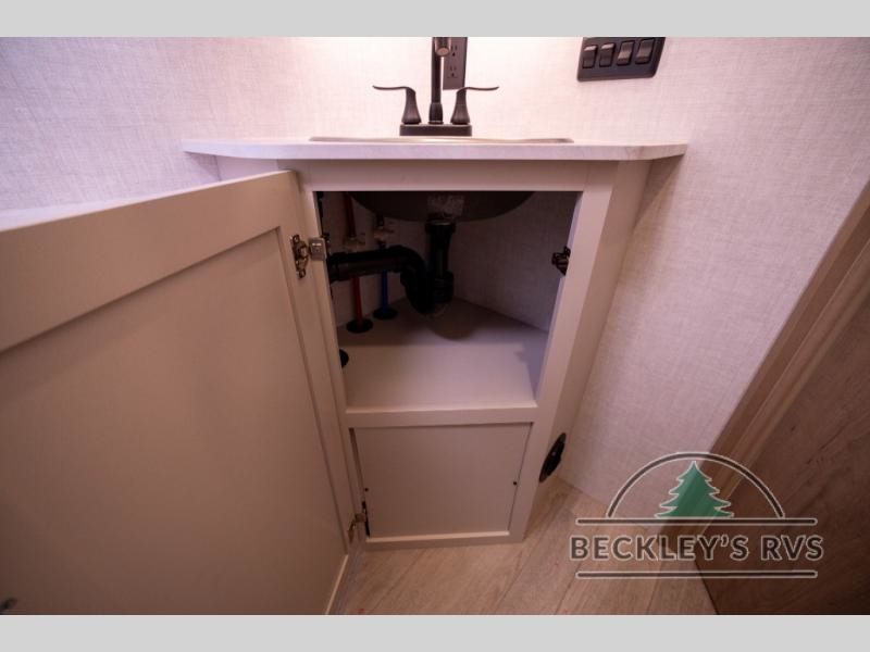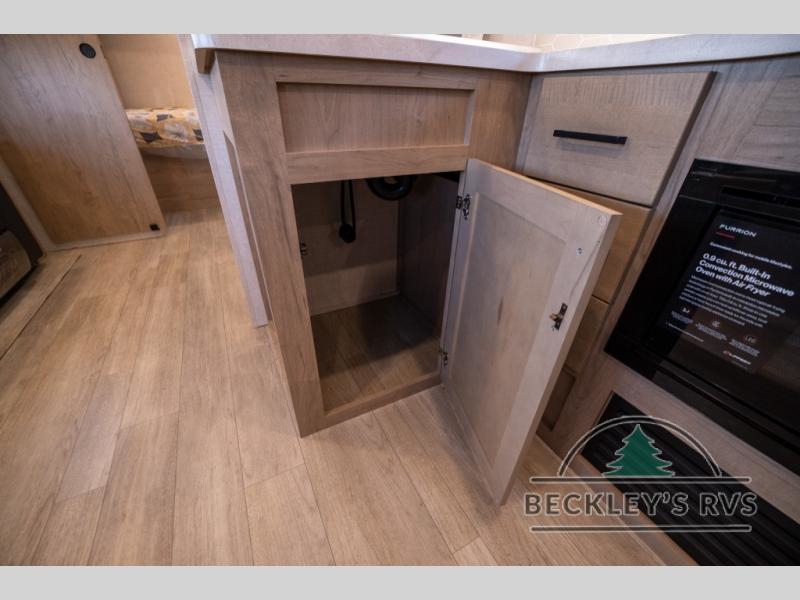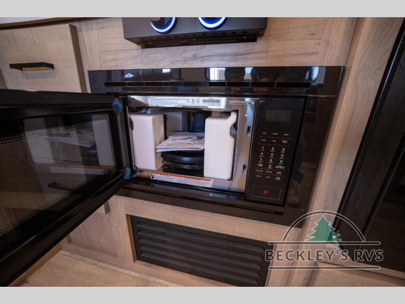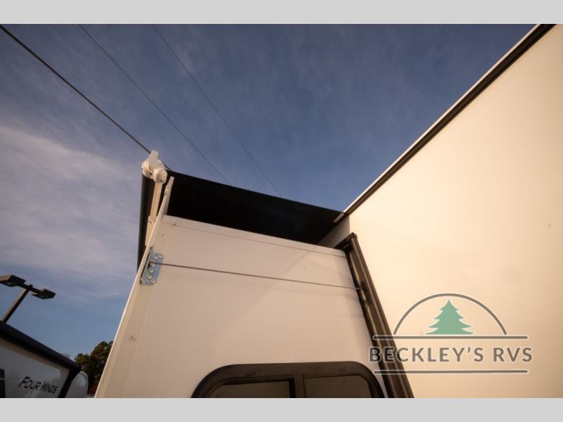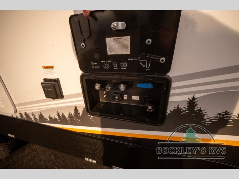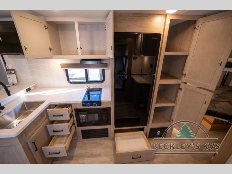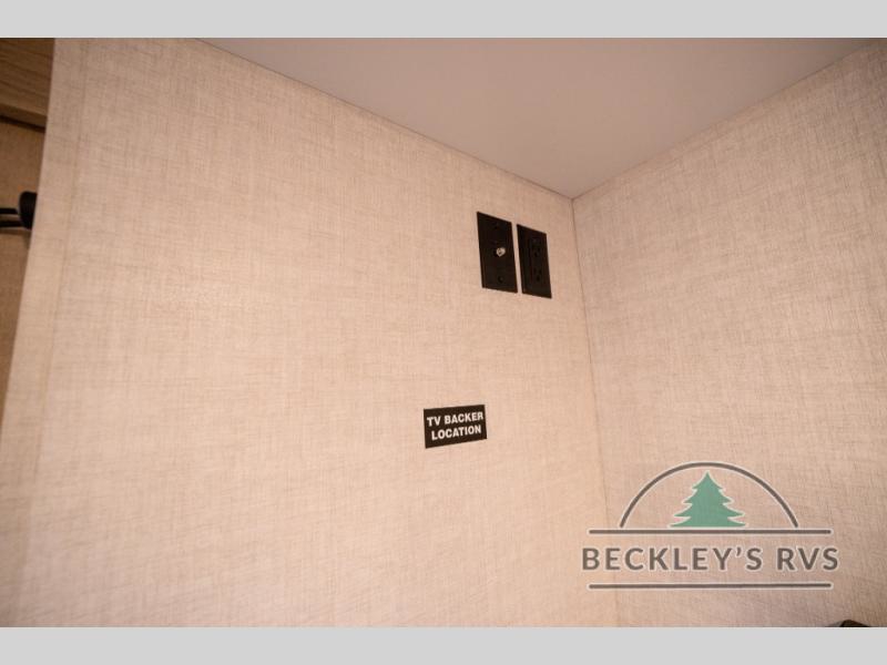 This model resembles 22ETS, but you'll enjoy added theater seating and a larger exterior length for more interior space! The patent-pending repositionable EmberTrack E-Track bunk/storage system includes 74" x 45" cargo space, and there are multiple single/double bunk configurations to fit your needs. The front walk-around true residential queen bed includes dual nightstands and dual wardrobes, and you'll appreciate sliding doors that makes a private bedroom. This E-Series kitchen includes an air fryer convection microwave, a two burner cooktop, plus a breakfast bar with bar stools so you can visit with the chef as they cook meals. A legless dinette will provide a place to dine, or you can take your plate outdoors to sit under the 18' power awning with a dimmable LED light. You'll also find a pass-through storage outside, along with a docking station and a kayak/bike storage door!