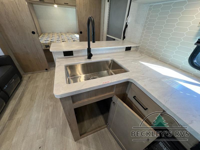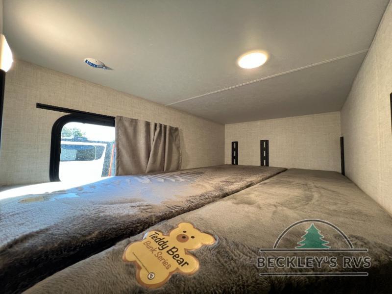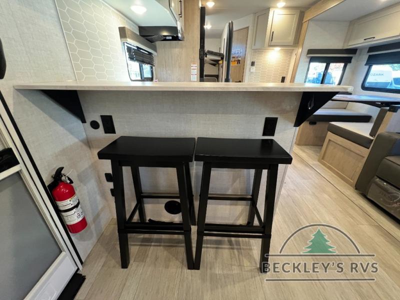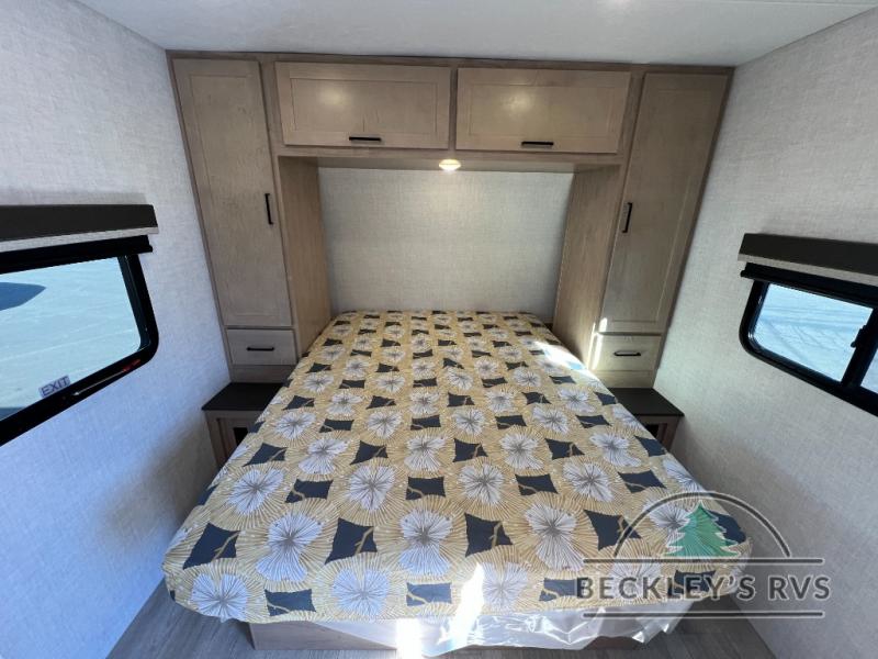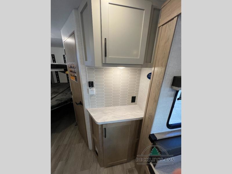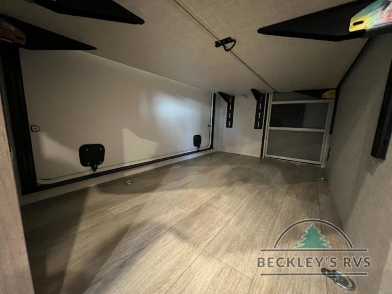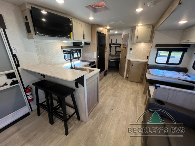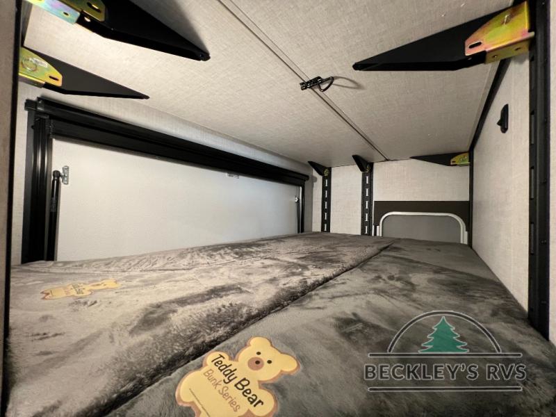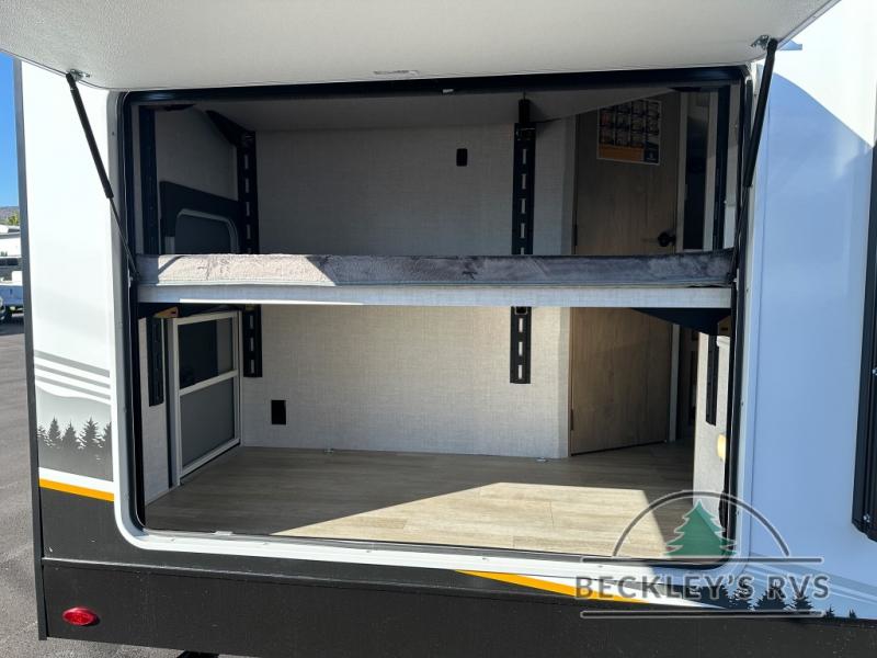 This model resembles 22ETS, but you'll enjoy added theater seating and a larger exterior length for more interior space! The patent-pending repositionable EmberTrack E-Track bunk/storage system includes 74" x 45" cargo space, and there are multiple single/double bunk configurations to fit your needs. The front walk-around true residential queen bed includes dual nightstands and dual wardrobes, and you'll appreciate sliding doors that makes a private bedroom. This E-Series kitchen includes an air fryer convection microwave, a two burner cooktop, plus a breakfast bar with bar stools so you can visit with the chef as they cook meals. A legless dinette will provide a place to dine, or you can take your plate outdoors to sit under the 18' power awning with a dimmable LED light. You'll also find a pass-through storage outside, along with a docking station and a kayak/bike storage door!