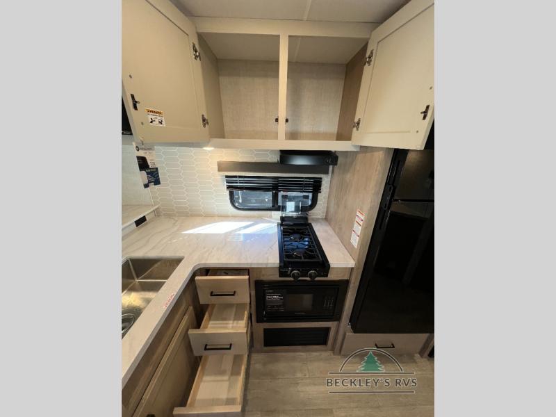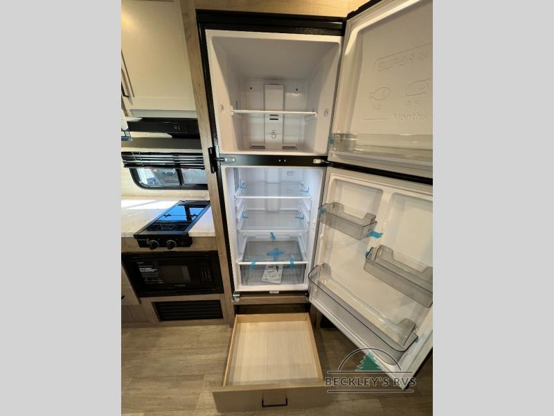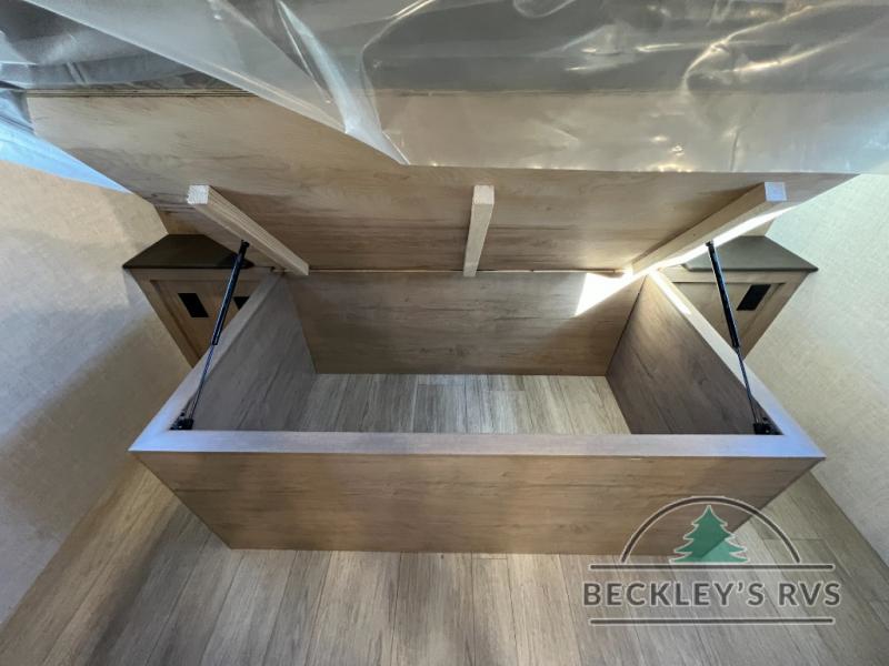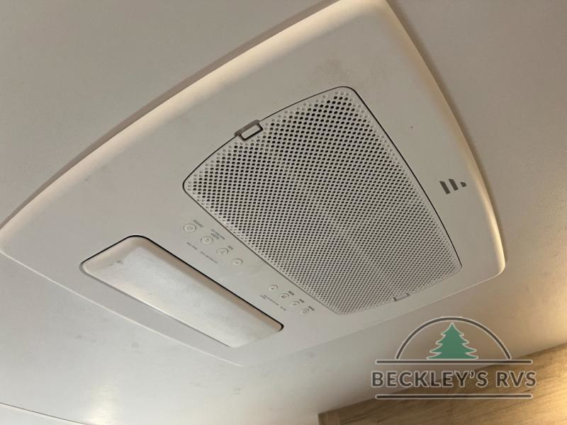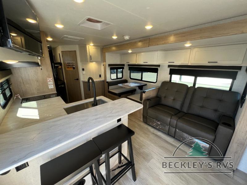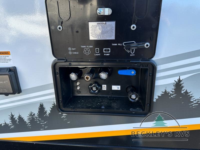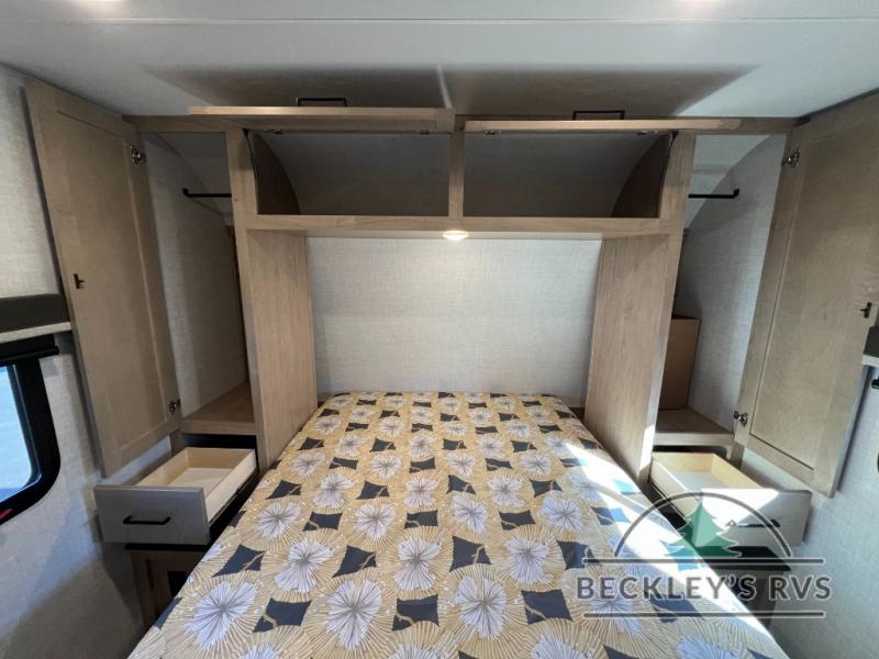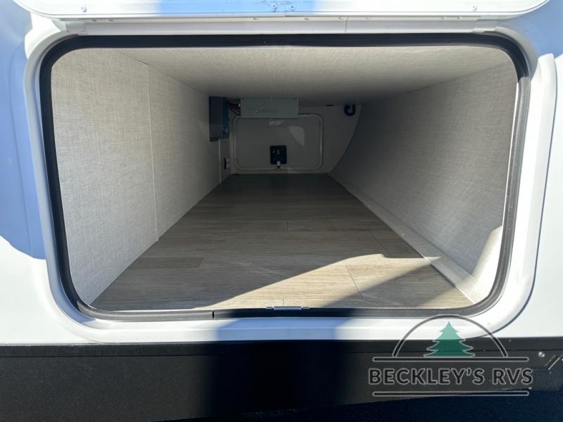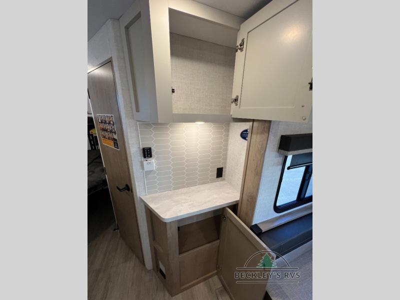 This model resembles 22ETS, but you'll enjoy added theater seating and a larger exterior length for more interior space! The patent-pending repositionable EmberTrack E-Track bunk/storage system includes 74" x 45" cargo space, and there are multiple single/double bunk configurations to fit your needs. The front walk-around true residential queen bed includes dual nightstands and dual wardrobes, and you'll appreciate sliding doors that makes a private bedroom. This E-Series kitchen includes an air fryer convection microwave, a two burner cooktop, plus a breakfast bar with bar stools so you can visit with the chef as they cook meals. A legless dinette will provide a place to dine, or you can take your plate outdoors to sit under the 18' power awning with a dimmable LED light. You'll also find a pass-through storage outside, along with a docking station and a kayak/bike storage door!