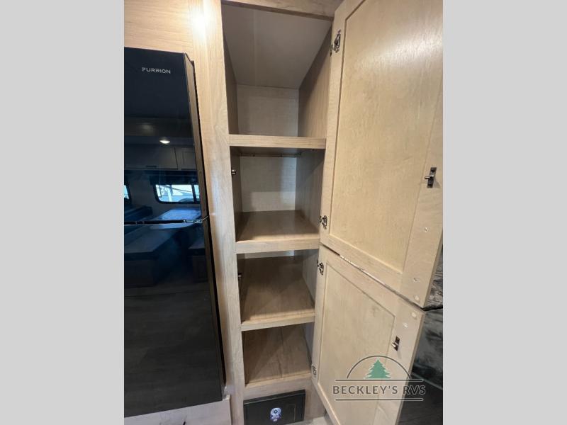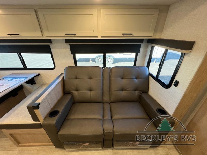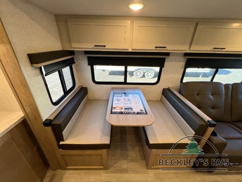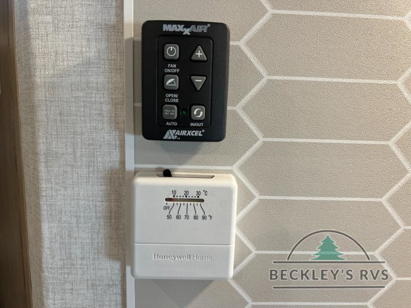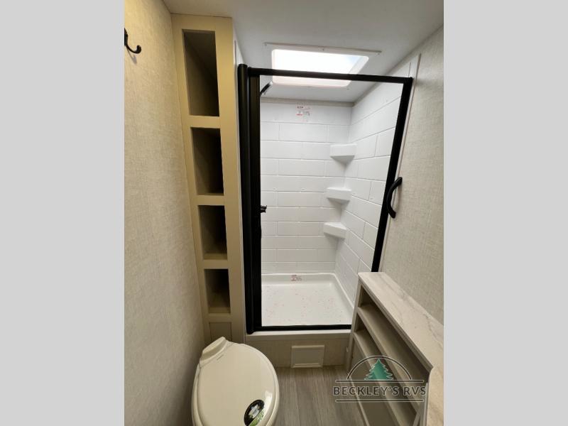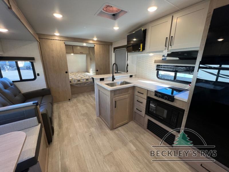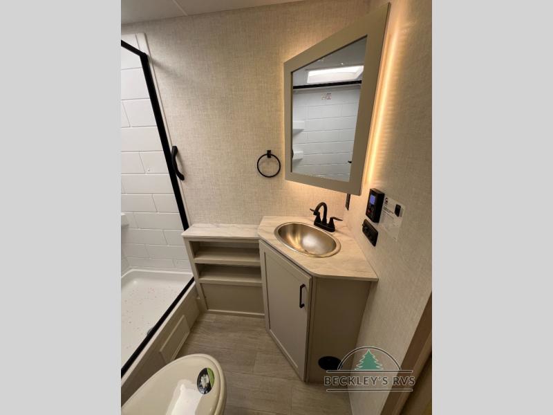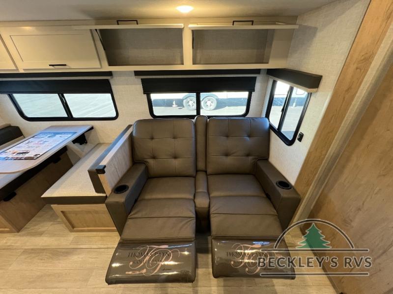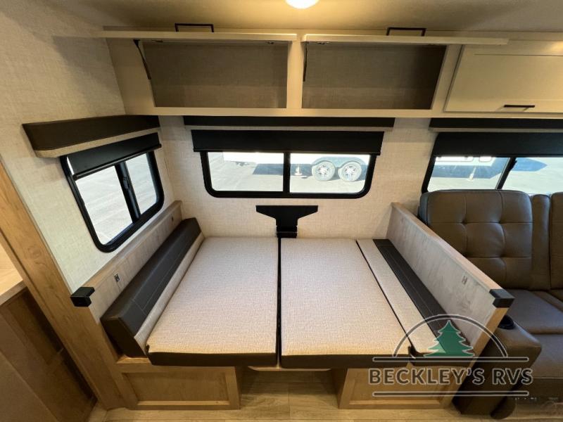 This model resembles 22ETS, but you'll enjoy added theater seating and a larger exterior length for more interior space! The patent-pending repositionable EmberTrack E-Track bunk/storage system includes 74" x 45" cargo space, and there are multiple single/double bunk configurations to fit your needs. The front walk-around true residential queen bed includes dual nightstands and dual wardrobes, and you'll appreciate sliding doors that makes a private bedroom. This E-Series kitchen includes an air fryer convection microwave, a two burner cooktop, plus a breakfast bar with bar stools so you can visit with the chef as they cook meals. A legless dinette will provide a place to dine, or you can take your plate outdoors to sit under the 18' power awning with a dimmable LED light. You'll also find a pass-through storage outside, along with a docking station and a kayak/bike storage door!
