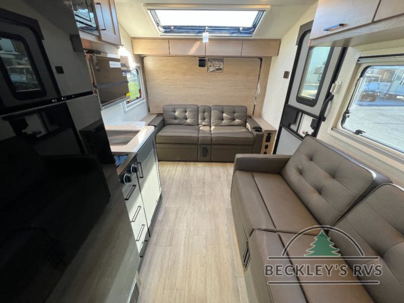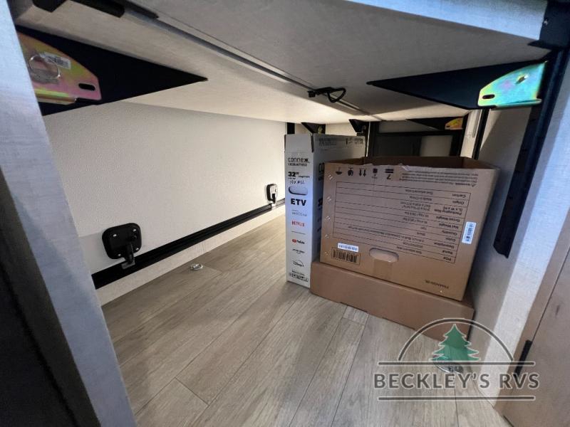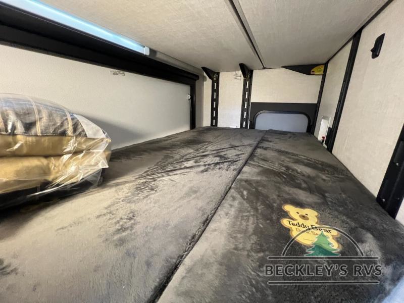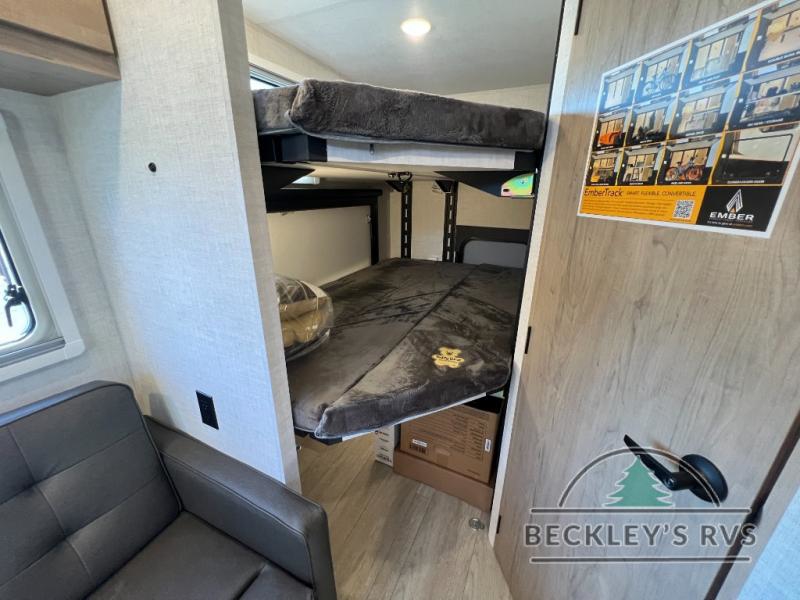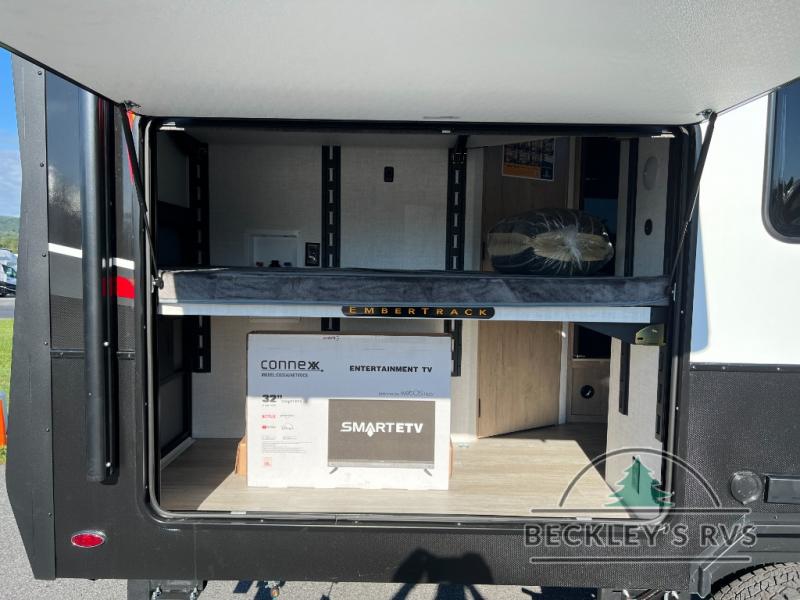 This unique travel trailer offers versatile living! Starting with the front Murphy bed that has a 60" x 80" queen bed to lay your head on at night and can convert into a sofa for seating during the day with a nightstand and a 12V HDTV/AV system to watch your favorite movies in bed. Create your best home cooked meals with the dual burner cooktop and 12V refrigerator then enjoy them at the jackknife sofa with a removable table. There is a second removable table that can be used by the Murphy bed/sofa. The repositionable Embertack E-track bunk/storage system has a 74" x 46" cargo space for your items and a storage locker door to access them from the exterior. You can enjoy twin bunks or convert them to double-size bunks to sleep two to four. The exterior also features a kayak/bike storage door, front pass-through storage area, and a 2" accessory receiver!