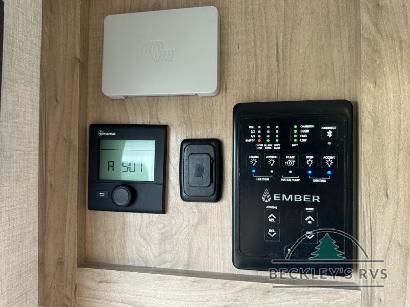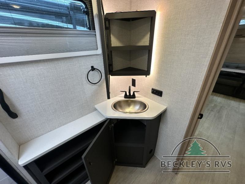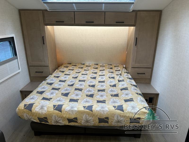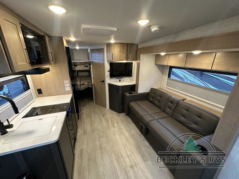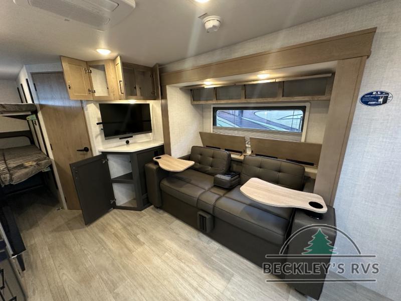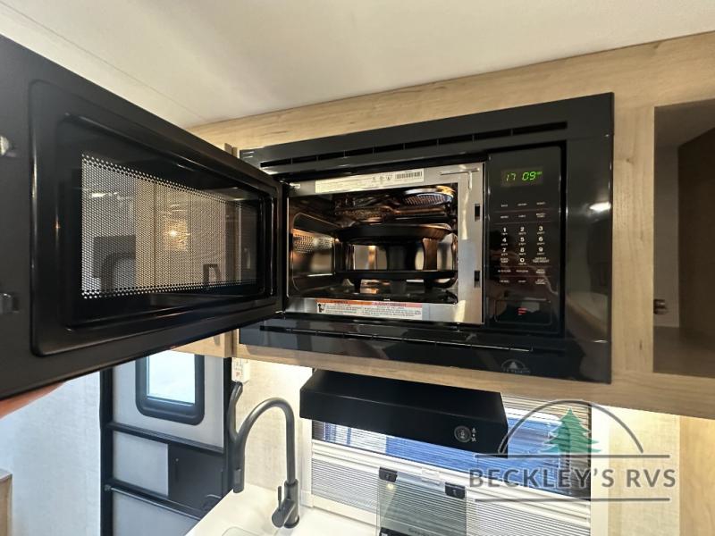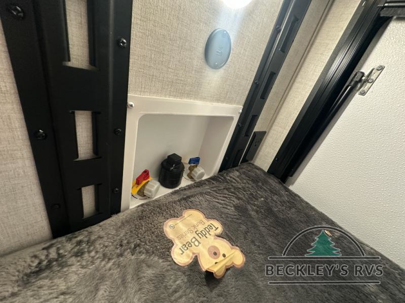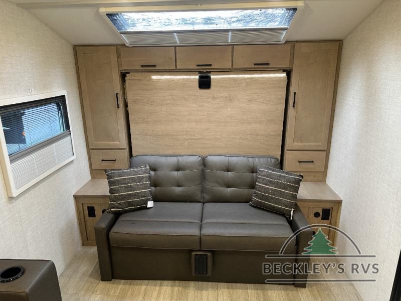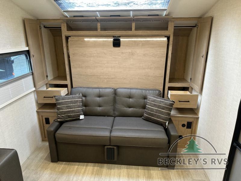 You're going to love everything about this travel trailer that can comfortably sleep three to six people each night, depending on your bunk configurations. There is a spacious storage locker that can be used for hiking gear, plus a kayak/bike storage door for quick and easy packing. The Embertrack system lets you convert the benches to twin bunks, double-size bunks, a desk, or remove them altogether for more storage space. You will enjoy the queen-size Murphy bed up front, along with the "stargazer" skylight for nighttime views, along with dual nightstands and dual wardrobes to keep your clothes tidy. And in the morning you can relax on the jack-knife sofa with a removable table once the bed is put away. This trailer also includes a full kitchen with a 12V refrigerator, an air fryer convection microwave oven, a dual burner cooktop, and a stainless steel sink for easy clean-up.