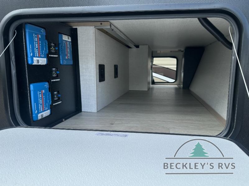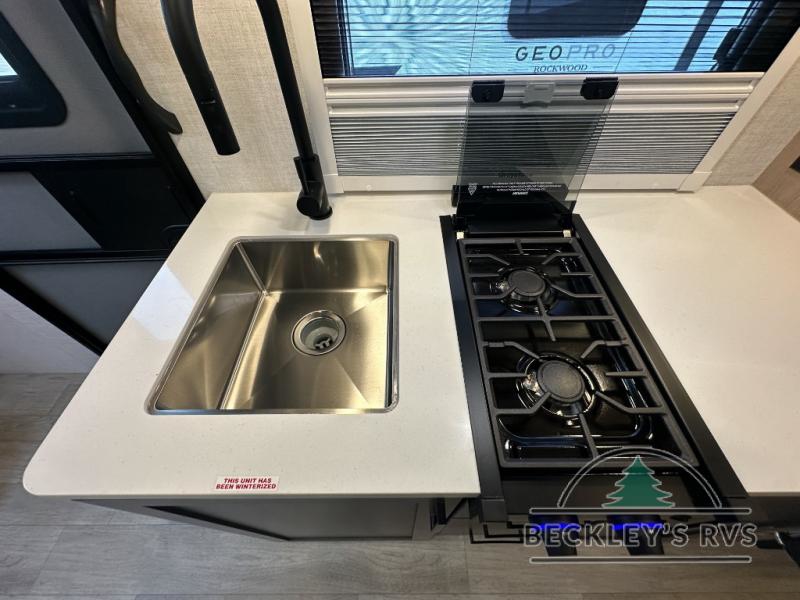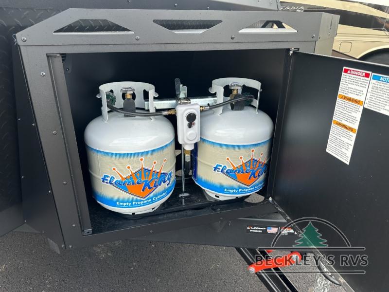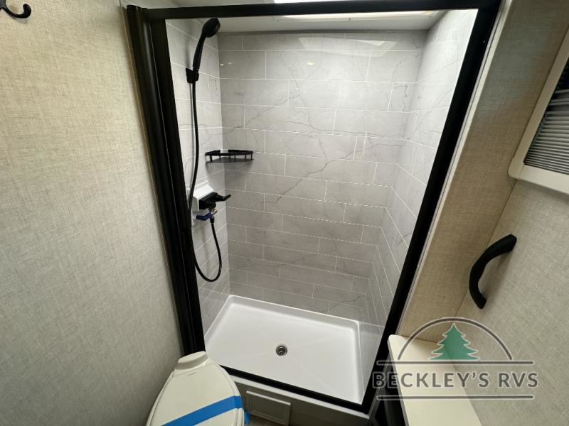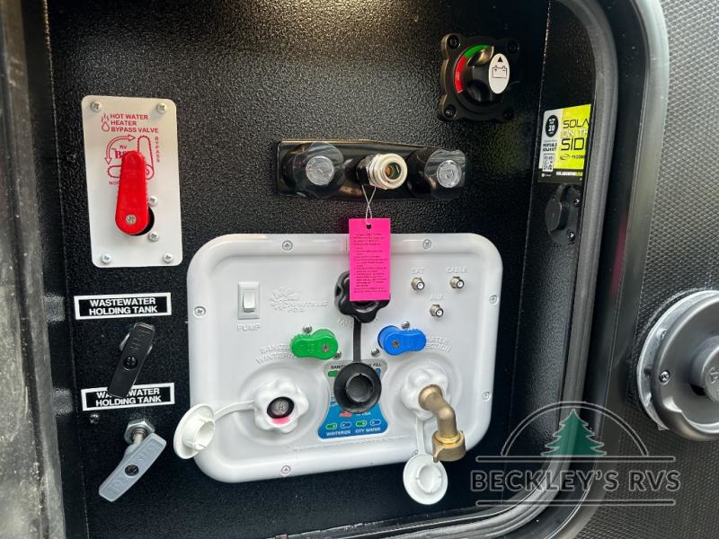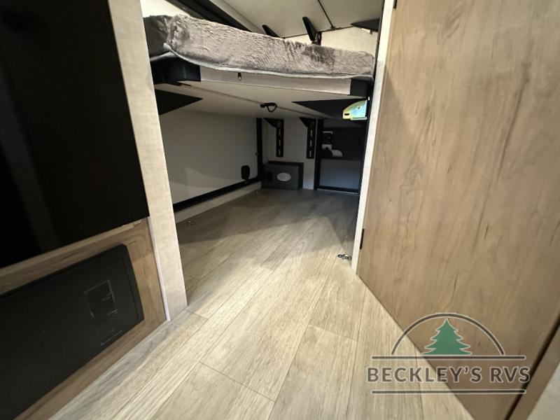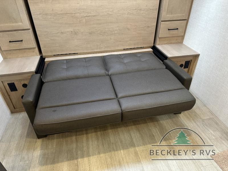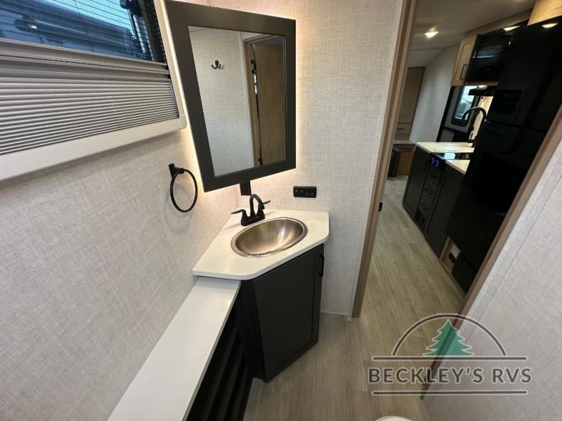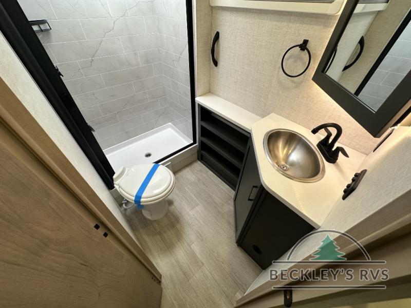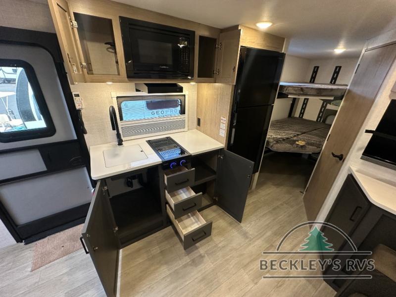 You're going to love everything about this travel trailer that can comfortably sleep three to six people each night, depending on your bunk configurations. There is a spacious storage locker that can be used for hiking gear, plus a kayak/bike storage door for quick and easy packing. The Embertrack system lets you convert the benches to twin bunks, double-size bunks, a desk, or remove them altogether for more storage space. You will enjoy the queen-size Murphy bed up front, along with the "stargazer" skylight for nighttime views, along with dual nightstands and dual wardrobes to keep your clothes tidy. And in the morning you can relax on the jack-knife sofa with a removable table once the bed is put away. This trailer also includes a full kitchen with a 12V refrigerator, an air fryer convection microwave oven, a dual burner cooktop, and a stainless steel sink for easy clean-up.