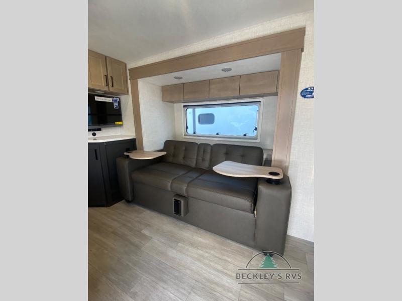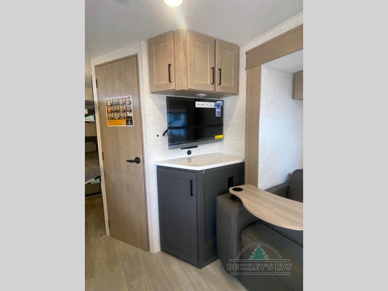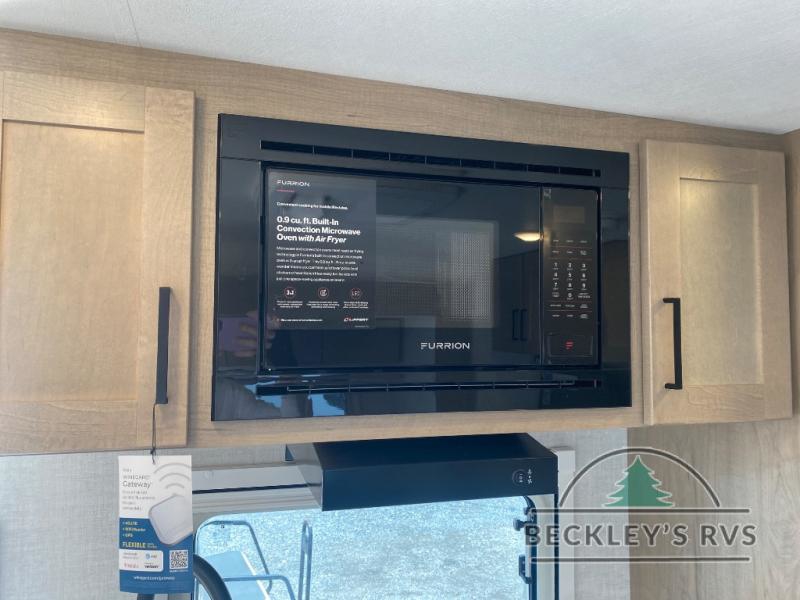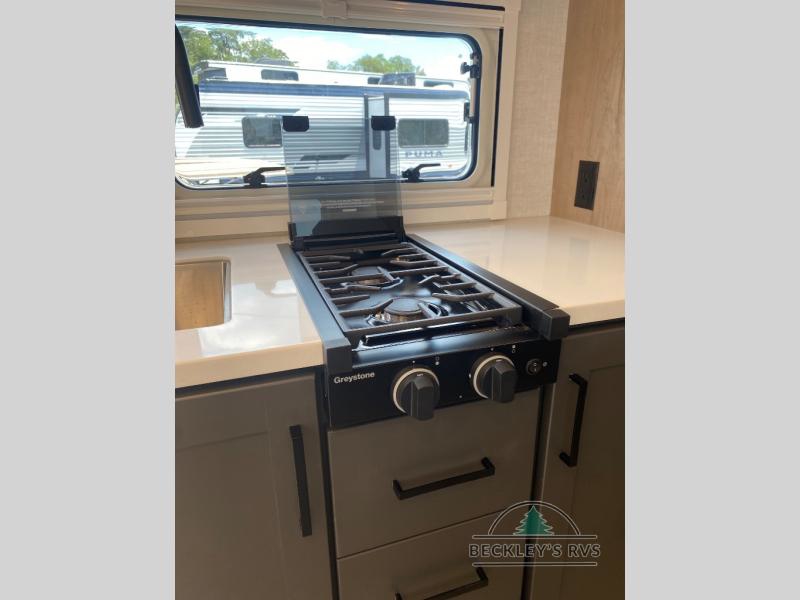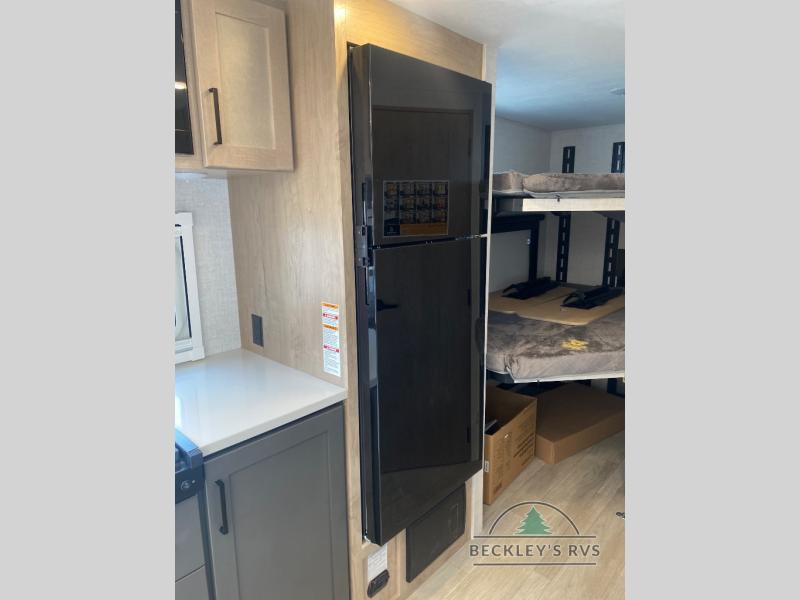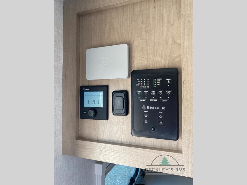 You're going to love everything about this travel trailer that can comfortably sleep three to six people each night, depending on your bunk configurations. There is a spacious storage locker that can be used for hiking gear, plus a kayak/bike storage door for quick and easy packing. The Embertrack system lets you convert the benches to twin bunks, double-size bunks, a desk, or remove them altogether for more storage space. You will enjoy the queen-size Murphy bed up front, along with the "stargazer" skylight for nighttime views, along with dual nightstands and dual wardrobes to keep your clothes tidy. And in the morning you can relax on the jack-knife sofa with a removable table once the bed is put away. This trailer also includes a full kitchen with a 12V refrigerator, an air fryer convection microwave oven, a dual burner cooktop, and a stainless steel sink for easy clean-up.