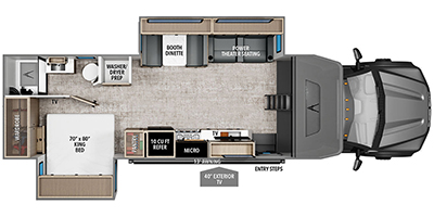 You can be sure to enjoy the journey and the stay in this coach! Once you stop for the day, you can make lunch with the kitchen appliances, then dine at the booth dinette within the large slide out. There is also power theater seating here across from a TV for easy viewing. A 10 cu. ft. 12V refrigerator and pantry will let you keep food stocked, and the closet with washer and dryer prep gives you the option to add these appliances. The 70" x 80" king bed slide is sure to provide a great night's rest, and there is a wardrobe to keep your things tidy. And of course, a full rear corner bath onboard makes staying fresh easier than ever!